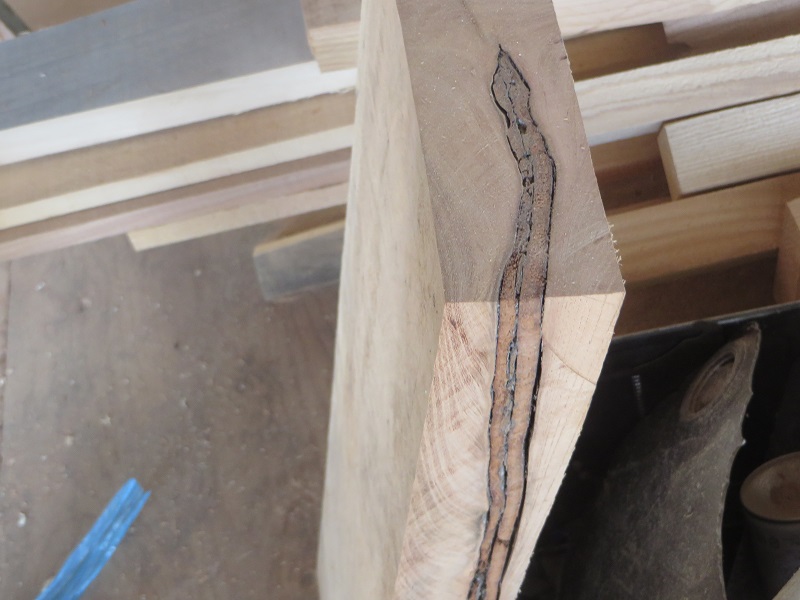 樹皮が成長過程で巻き込まれて入り皮が入り込んだ欅板の断面