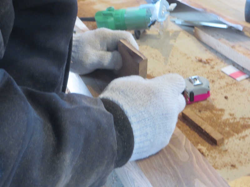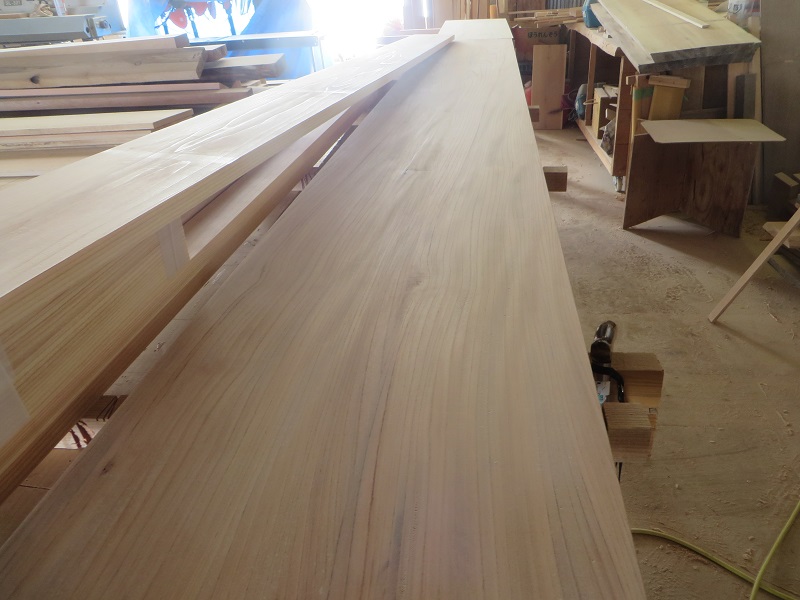 先週の土曜日、木材の清めが行われた作業場から離れた場内では、5年間桟積み乾燥した南部赤松の修正挽や欅板材をカウンターに加工する作業がされていました。その欅板は表面上は立派なものでしたが、いざ手をかけてみると入り皮が内部に入るなかなか難しい手強い素材だったようです。でも、こんなの使えないとは言わず、この欅が育つ際に巻き込んだと考えられる樹皮部を上手く切り外して板を切り分けて剥ぎ足して作ってくれていたのです。大工のこの技術は自然からの賜りものを人が生かす心の表れですから、木材の清め式に通じるものがあると私は感じて今回ご紹介させて頂いた次第です。