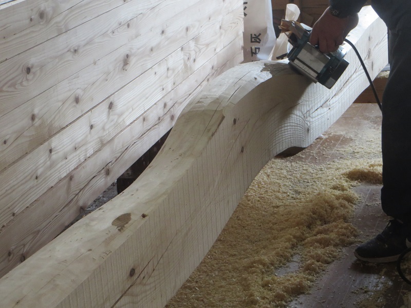 車椅子大工の墨付けが進み、これからは太鼓梁への墨付けに取り掛かる事になります。その太鼓梁はとても良く綺麗にカーブしたものから強くゴロンと盛り上がる材からと様々です。これらもこの姿のままに扱う事になります。木が生き物として自然の中で育った姿形をひたすら四角に整形しているのが現代の効率技術となります。しかし、人が自然の中に暮らし衣食住を満たしながらの地球との共存技術は長期に渡る人々の伝承からなるものです。それを今、この車椅子に乗る若き大工が受け継ぎ、この家に住む人の御為に技術を傾注しようとしております。