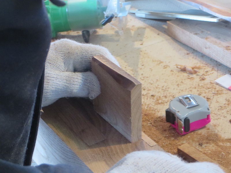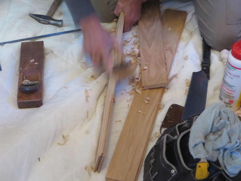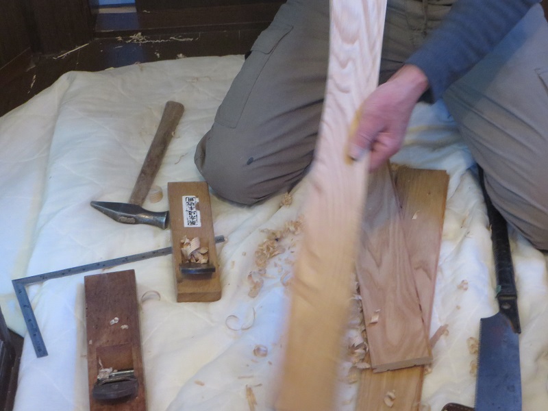 便座の曲線に合わせて床板を鉋で削り込んでいるところです。