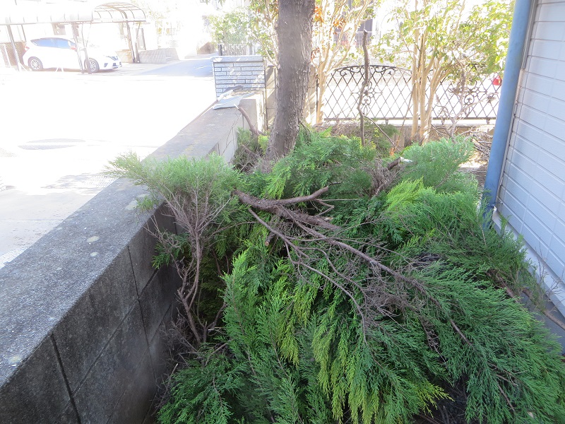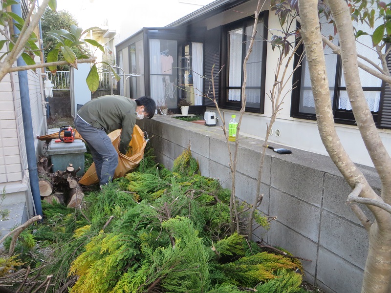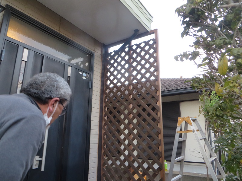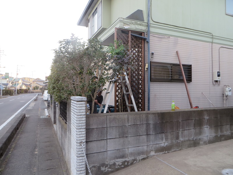 茨城県土浦市での仕事は、庭木の伐採のみならず、伐採後の目隠しラチスパネルの取付、トイレの床張りにドアレバーハンドルの調整などでした。最近は上吊レール金具を利用した引き戸の多い当社ではドアのレバーハンドルを扱う事は殆ど無くなりましたから、大工は久し振りに30年前の感覚を取り戻しながら直してくれていました。今回の様な便利屋的な何でも仕事が出来るのは誇りですね。