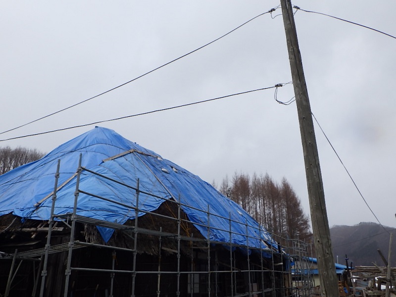 屋根をブルーシートで包み込んで冬越養生しておりましたが、春が近づくと強風が吹く地域なので、シートが剥がれて来たとのご連絡を受けて急ぎ直しに行って来ました。好摩野作業場では屋根の木組み材の刻みが進んでいます。