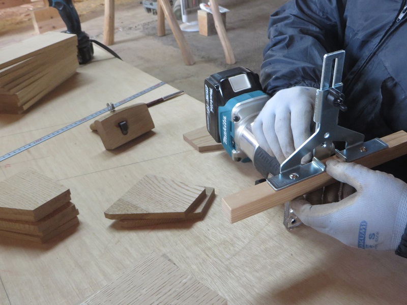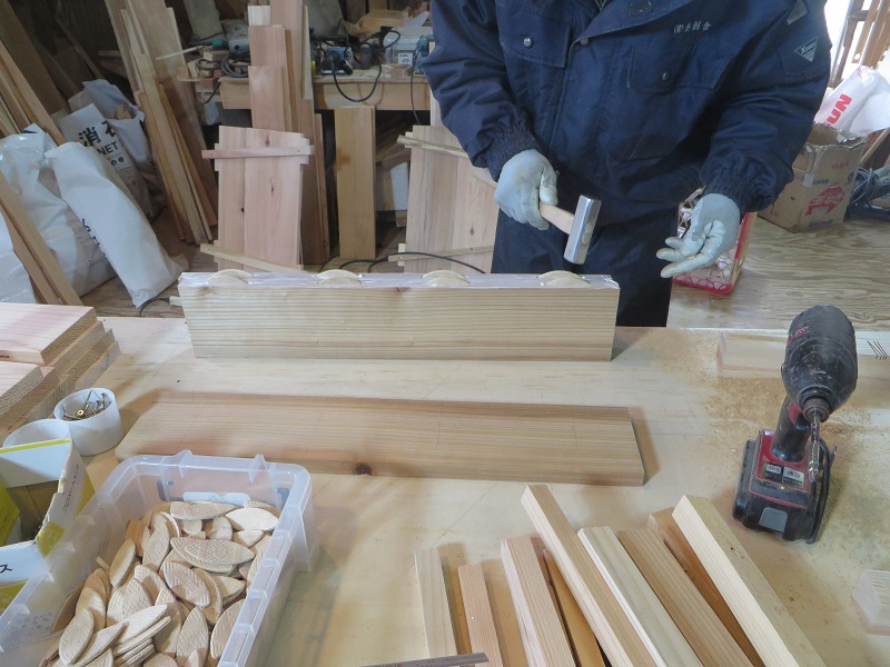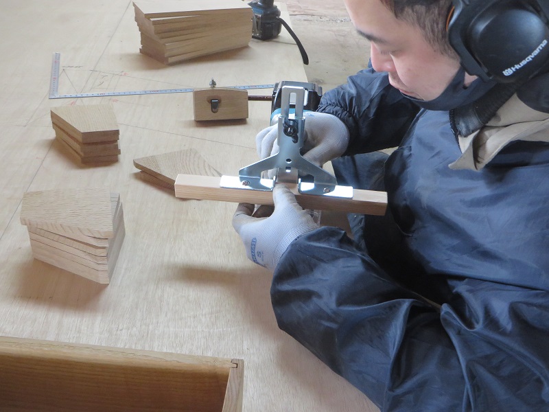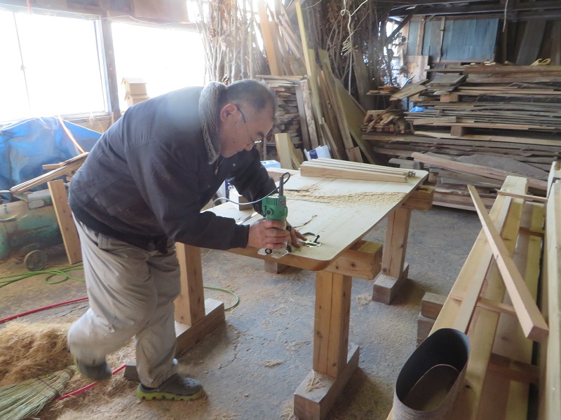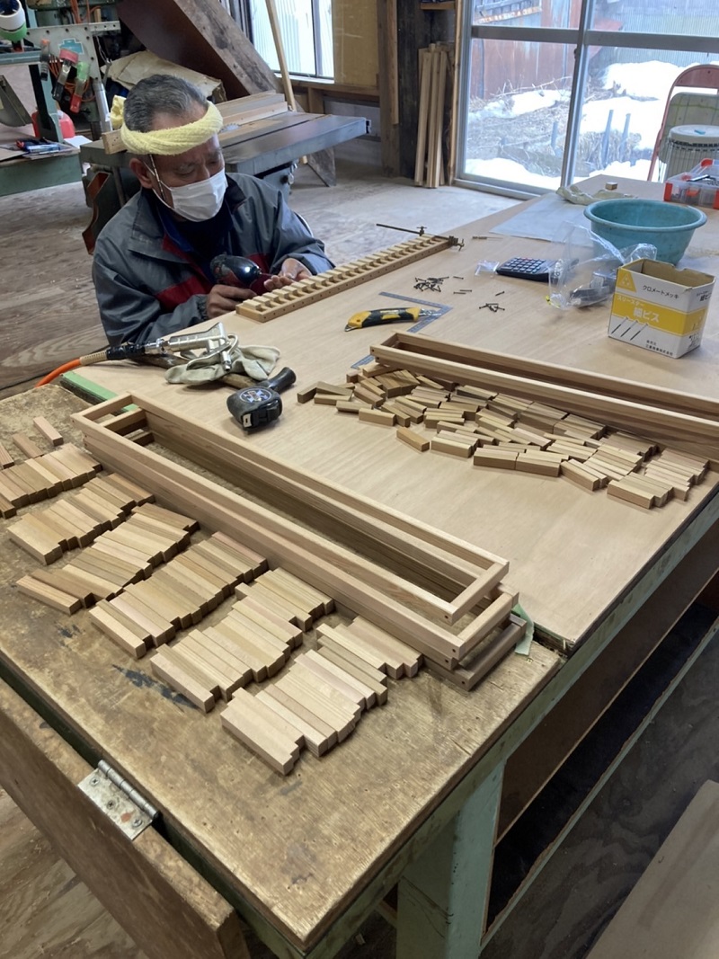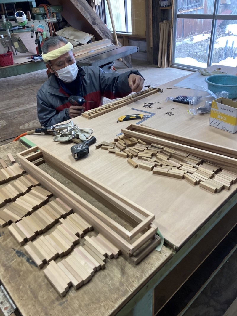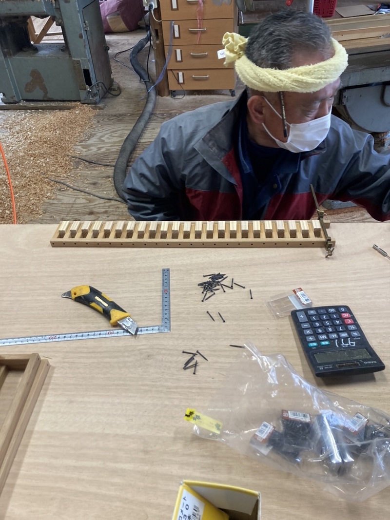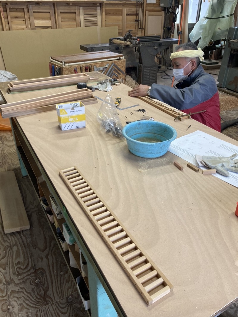 春めいて来た場内の作業場では、床下暖房の暖気を室内に上げる為の床に取り付けるスリット造りが行われていました。この杢創舎日記では季節の移り変わりの中で働く職人の風景を共に配信させて頂いてきました。季節が廻りまた新しい一年のスタートラインに立っている感じがあります。では、スリット造りの写真と古民具修繕の写真と共にご紹介させて頂きます。