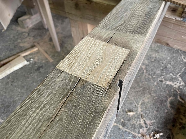 同じ樹種の使わない部分を切り取り、杢目を合わせてはめ込みます。