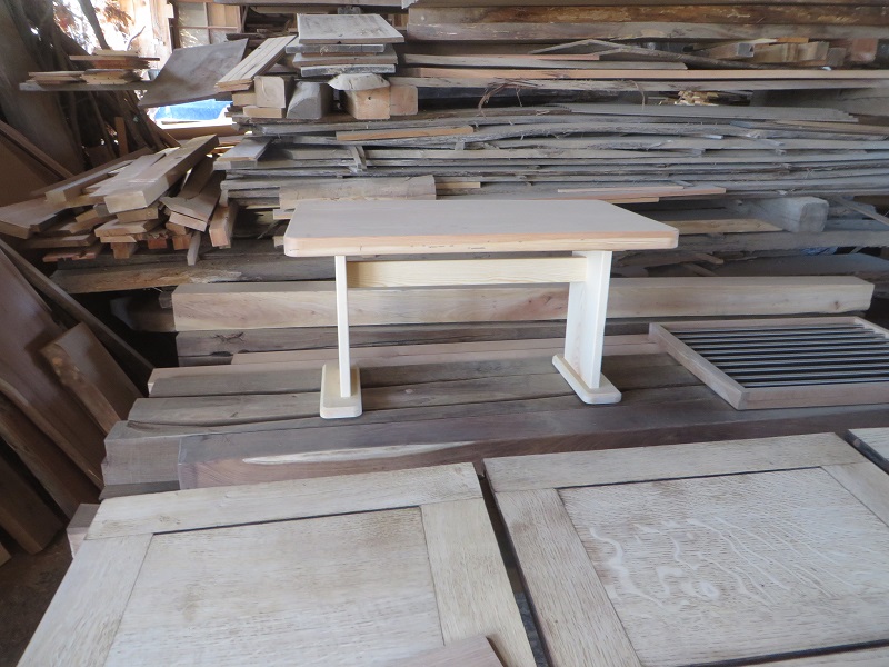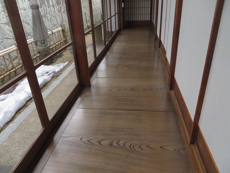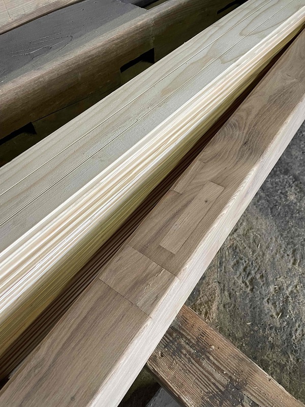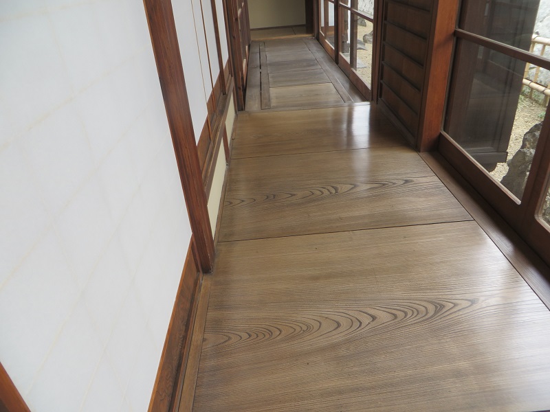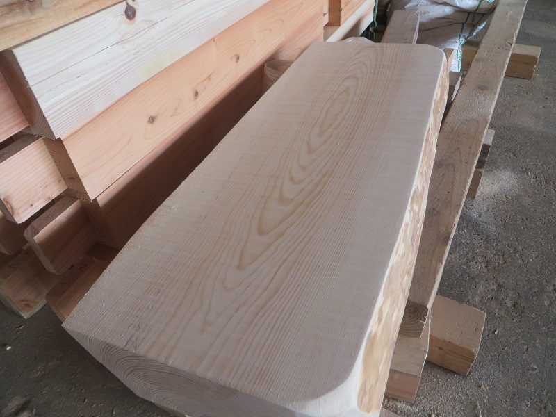 玄関の土間床と内部の床の段差解消の敷台を赤松梁の切り落とし端材を磨いて製作していました。鋸目が面白い材料でしたが、靴下が引っかからない様にと磨き込みんで鋸目が消えてしまいました・・・・でも杢目は綺麗です。