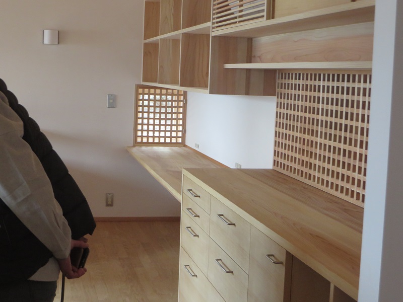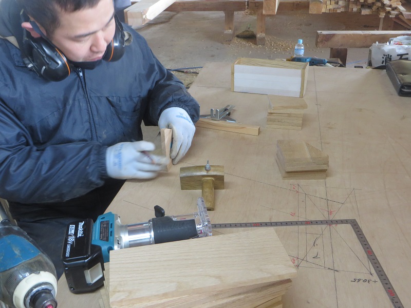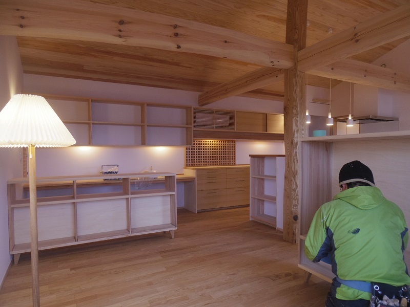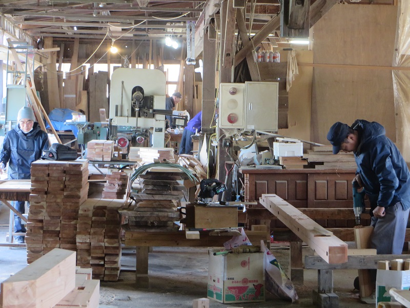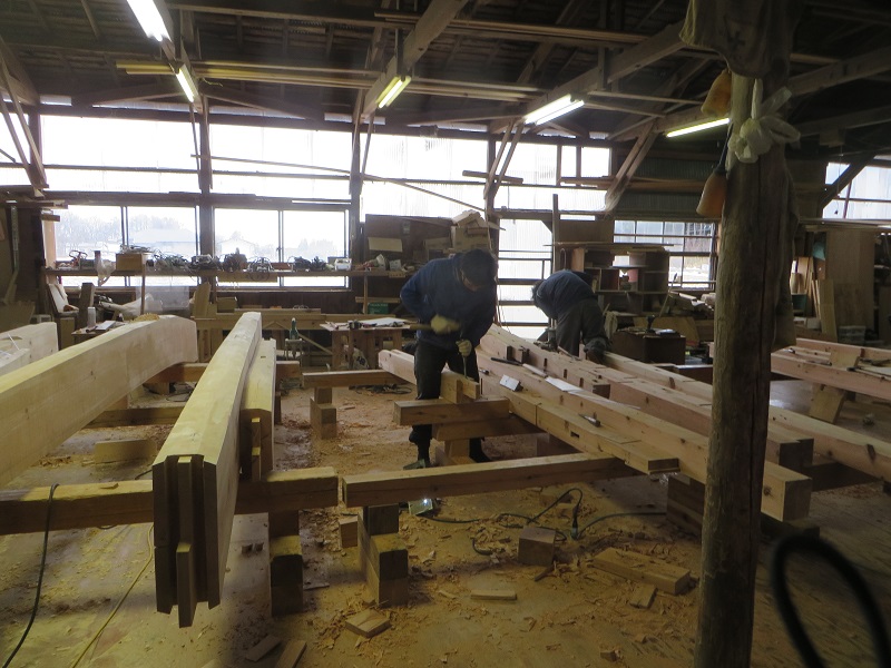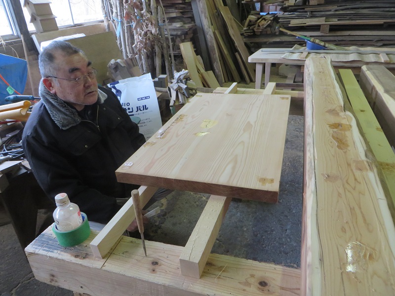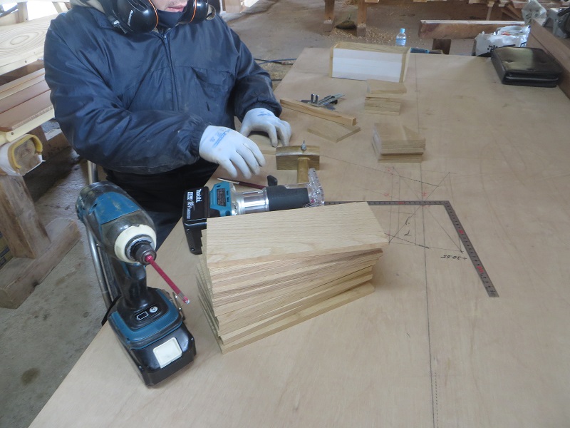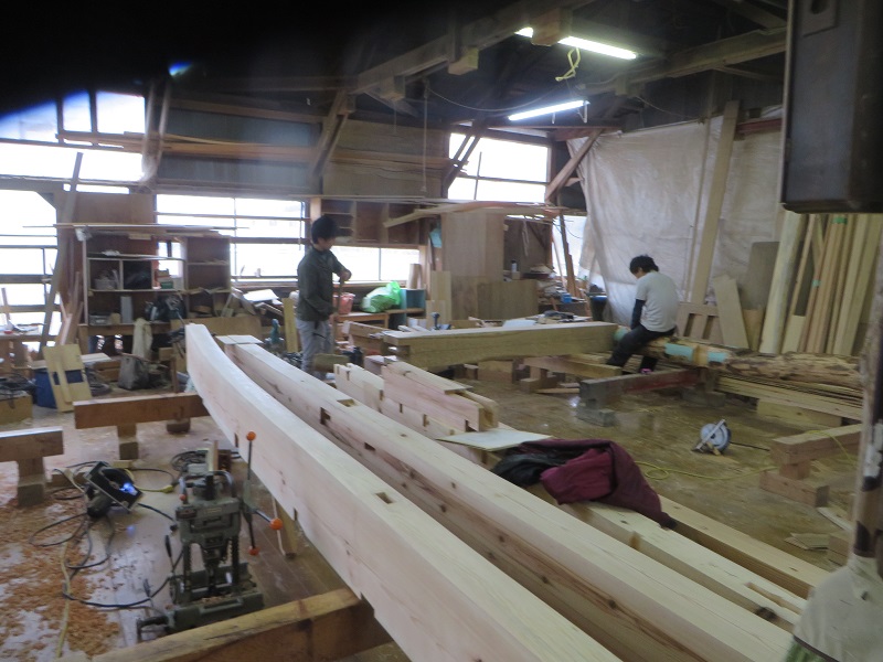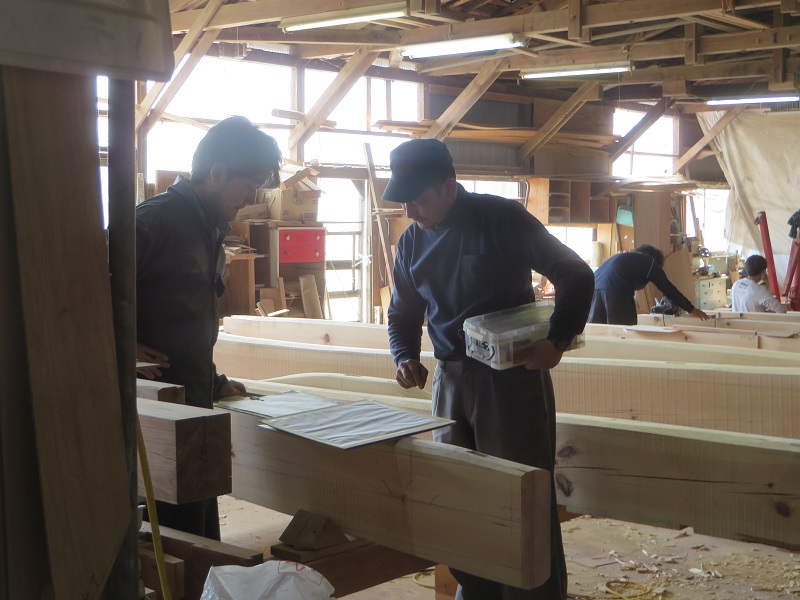 先週までは静かだった作業場が俄かに活気づいてきました。若手大工による手刻みが再開しただけではなく、熟練職人の造作材加工や家具造り建具造もガンガンと取り組まれています。