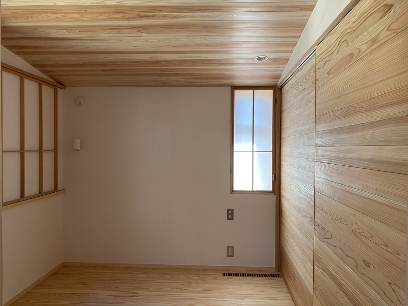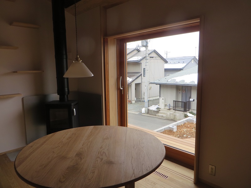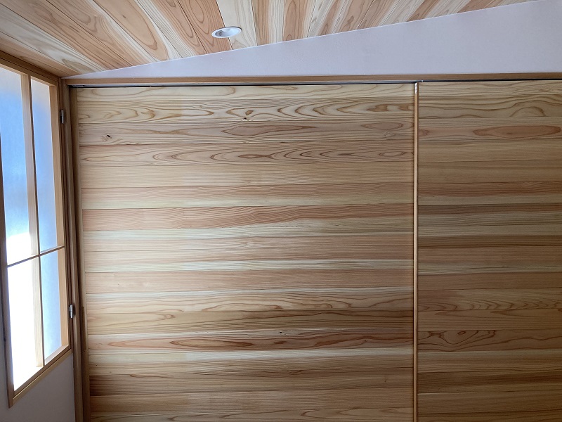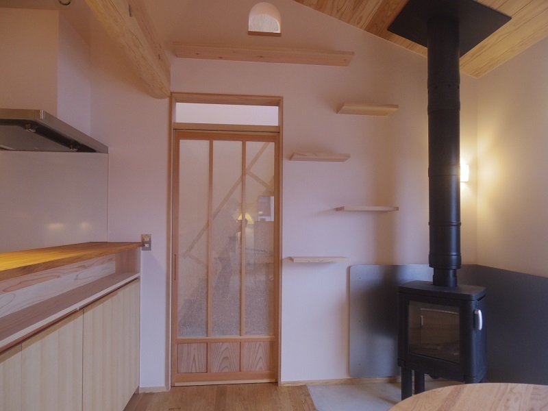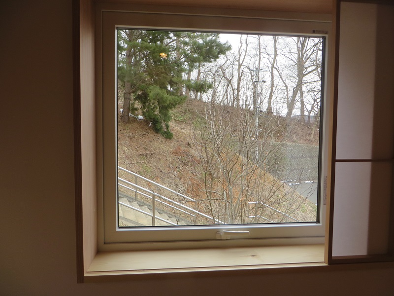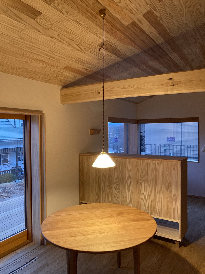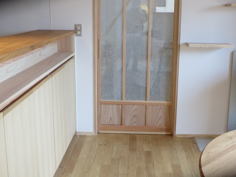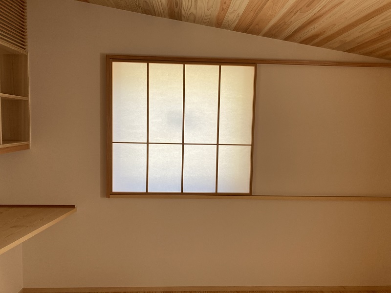 カーテン代わりの雪見障子は、お施主様持ち込み障子のリサイクル品です。