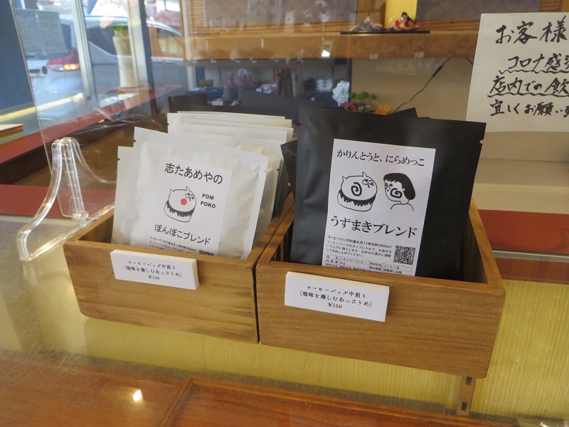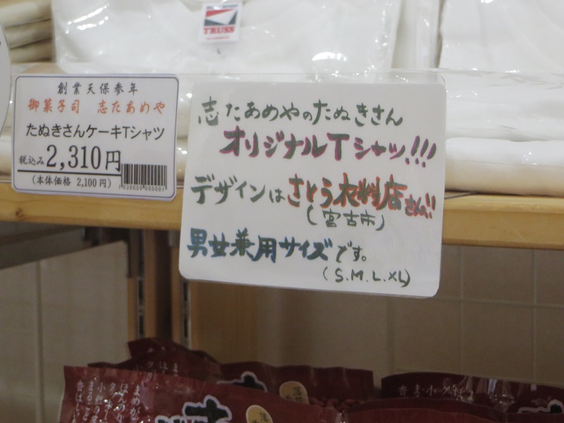 昨日の続きになりますが、岩泉町に着いて、先日盛岡駅での岩泉フェアで買えなかった志たあめやさんのたぬきさんケーキを買って来ました。お店に入ると、宮古のさとう衣料店店主さんデザインのTシャツや手拭いに例のコーヒーパックが販売されていて、当社でもお世話になっているので、繋がりのご縁に微笑ましく嬉しくなりました。志たあめやさんは江戸時代の天保3年1832年創業の190年地域の御菓子造りの老舗さんなのです。道中の道の駅三田貝分校にもTシャツなど色々と置かれていますが、たぬきさんケーキは岩泉町うれいら通りまで来て頂いてのお買い求めを何卒よろしくお願い申し上げます。