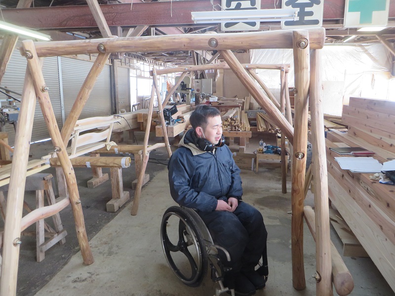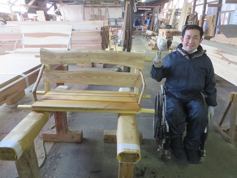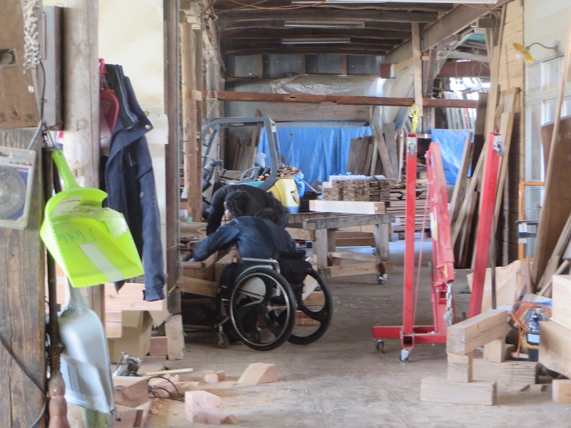 車椅子大工が木の照明器具造りをしていました。当社オリジナルのブラケット照明で、ナラ材です。自然の木には、こうして車椅子大工に次から次に仕事を生み出してくれる有難さを感じます。これが塩ビシート材や合板材だと身障者の仕事に繋がらないのです。