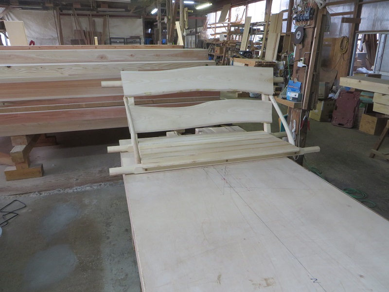 先週12日土曜日の作業場では車椅子大工は木のブランコ造二台目を仕上げ、家具職人は黒石野の大改修現場用の各種カウンター造りなどが取り組まれていました。そして、日月と二日連休明けで本日は、大改修現場に応援で途中だった刻みが再開されます。