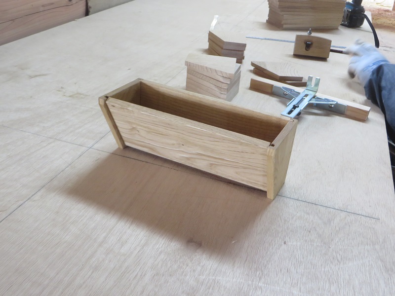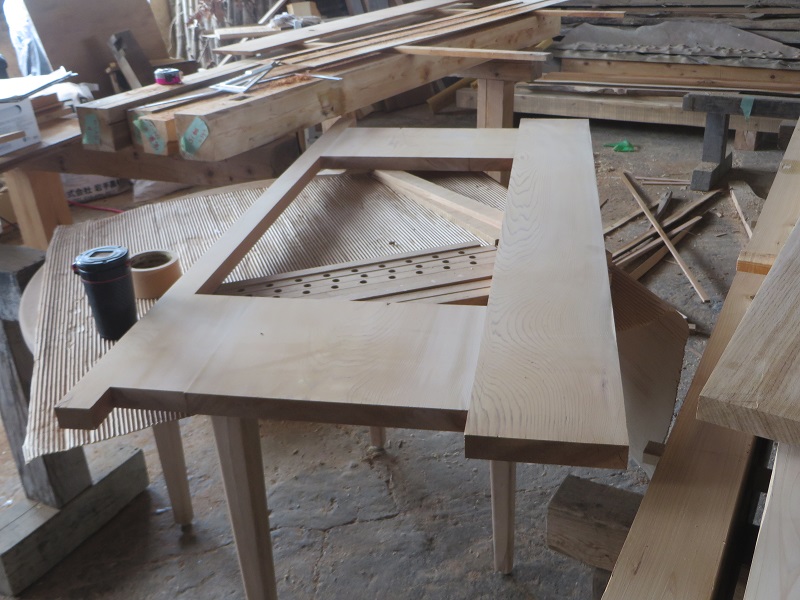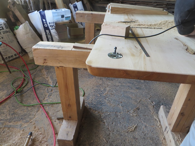 二日連休明けの作業場は、手刻みが再開し、テーブル造が行われていたり建具造も盛況で、とても賑やかでした。特に手刻みの若手大工の面々が集まって今度立てる住まいの図面を見ている姿が、これぞ家造りの本流と思いましたので、嬉しかったです。