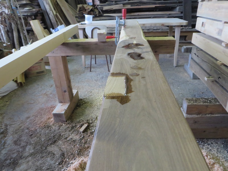 黒石野の大改修現場のテーブル造が進んでいます。施主手持ちの栗の板を預かって足を付けてテーブルに造り変えていますが、置き板だったらしく経年変化で反ったり歪んだりしているのと、子供たちの落書きもあって、歪みを直し面を取り、磨き込んだので落書きは消えてしまいました。そして、テーブル面の穴に樹脂を入れて穴の処理をする合間に、古材の穴に埋木を行う作業も同時並行で作業していました。自然の無垢の木だからこそこうして修繕して再度新たに使用することができます。これこそ、「SDGS」の作業の姿そのものです。