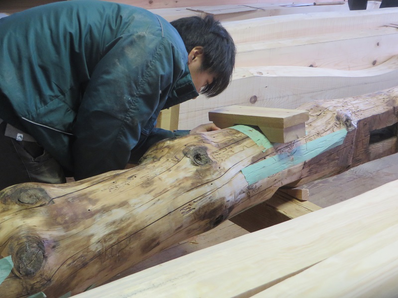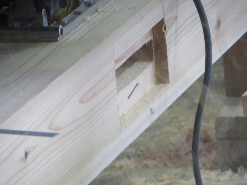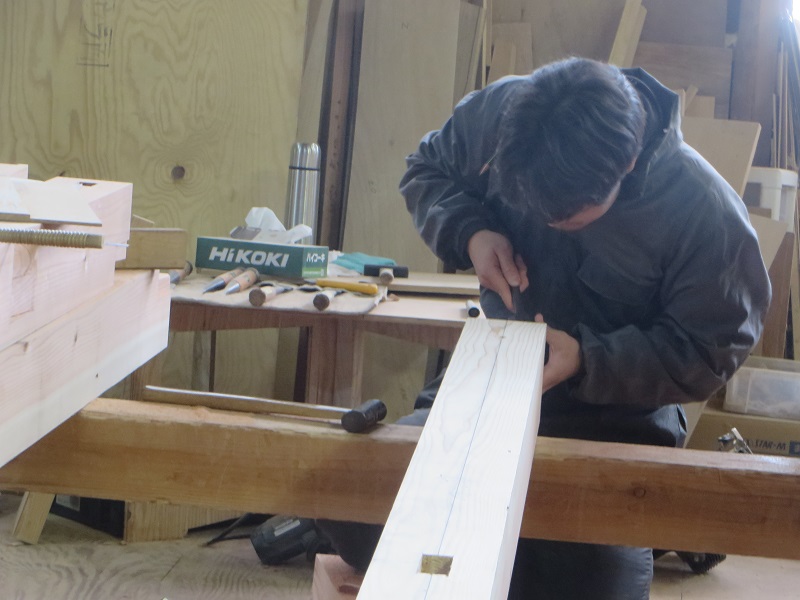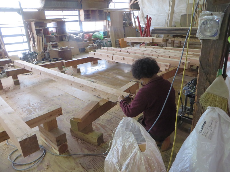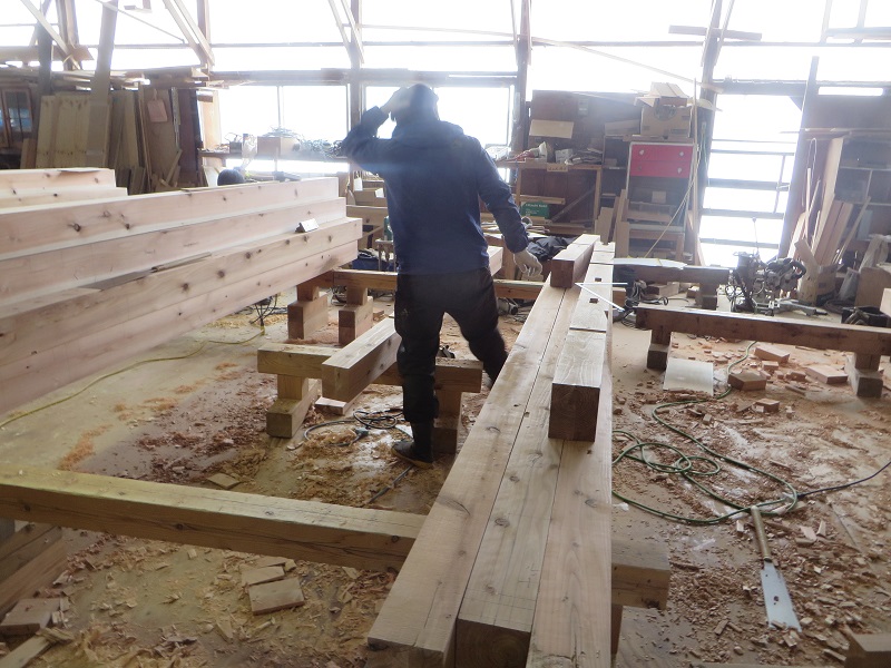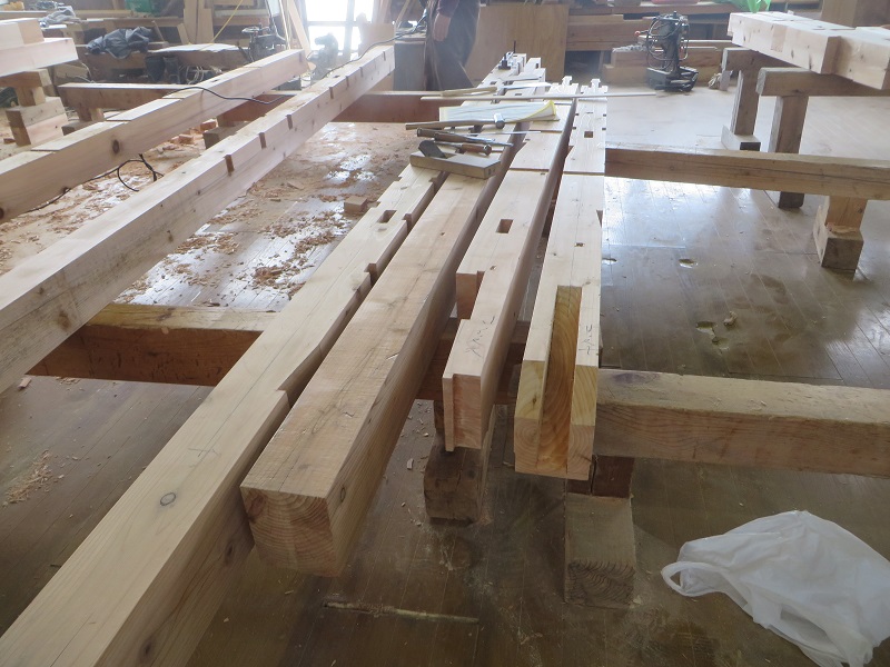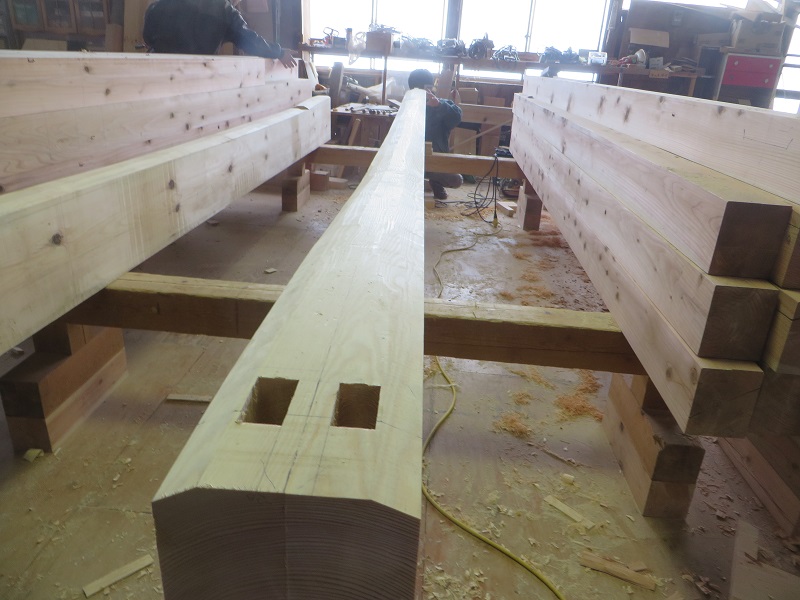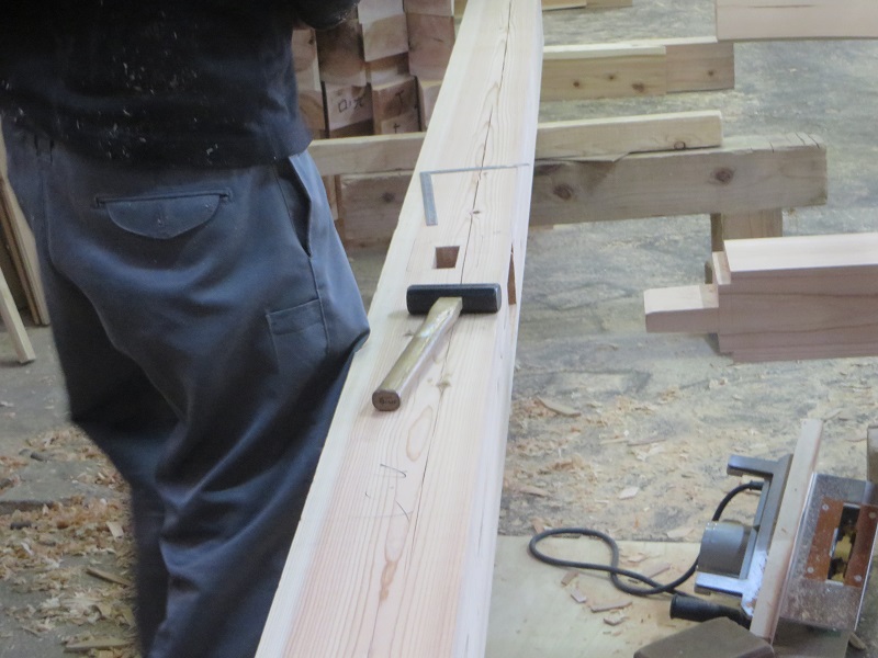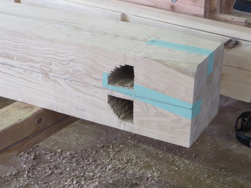 杉5寸角の通し柱の刻みも進めています。各方向から梁桁が差し込まれるので、一度組んで確かめながらの刻みになります。