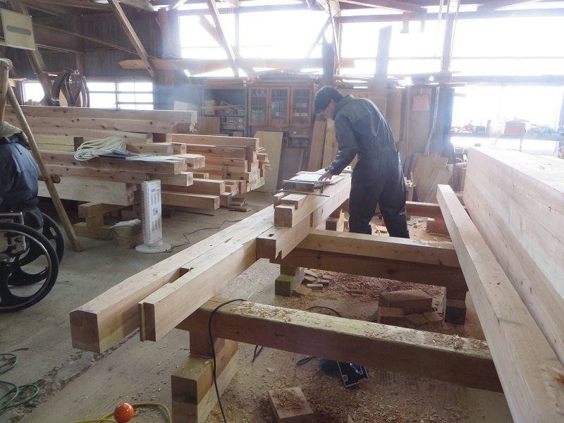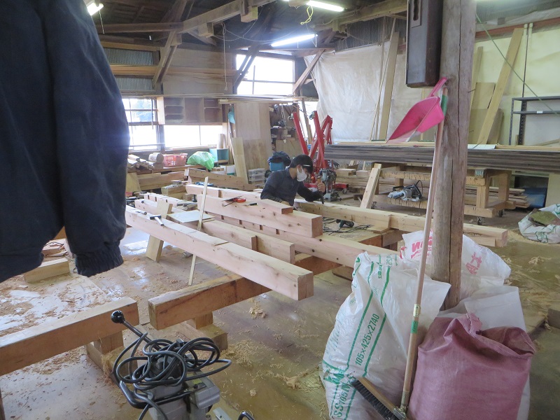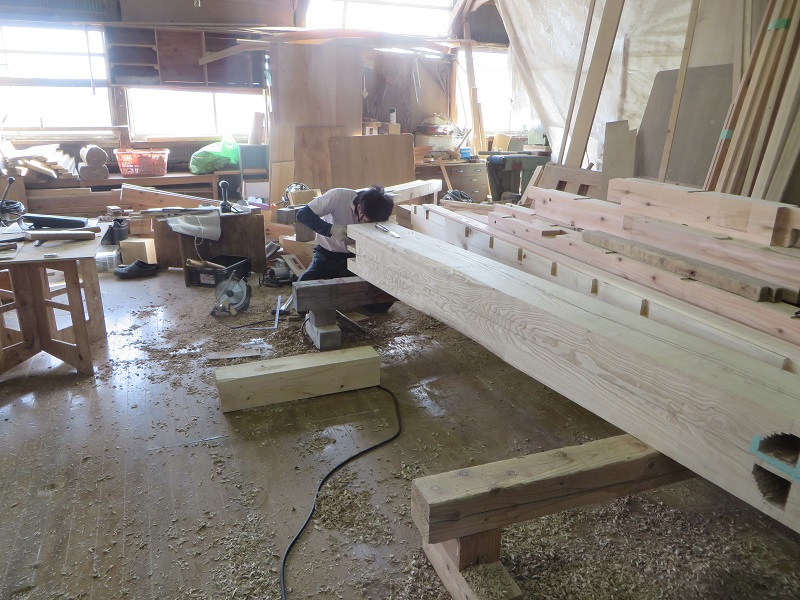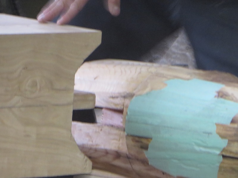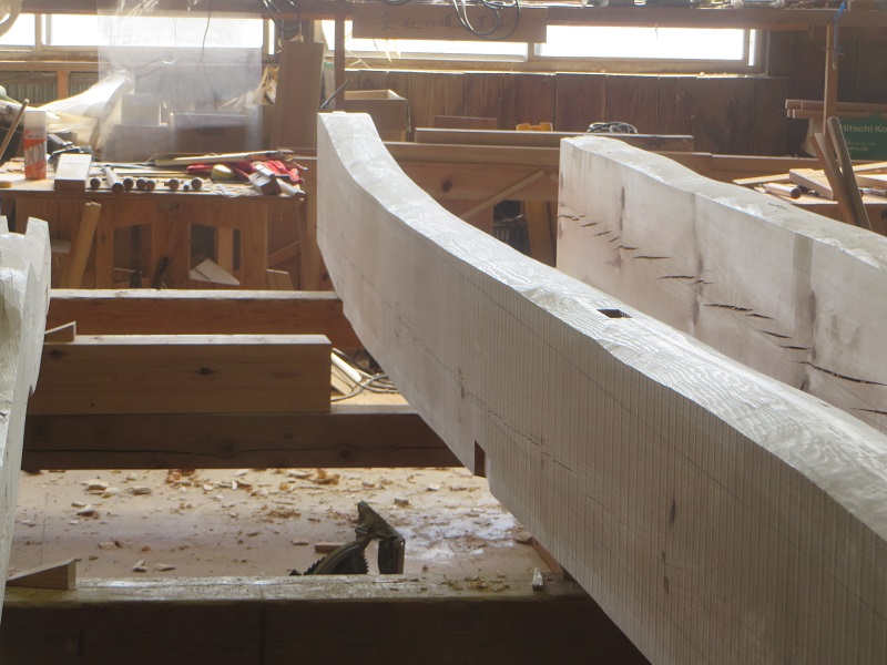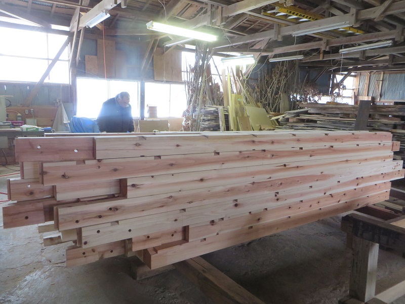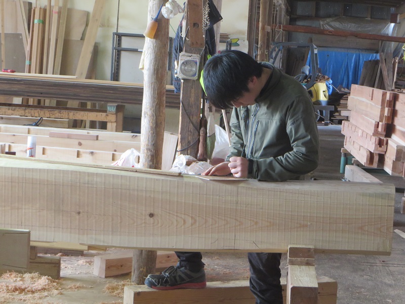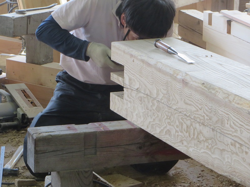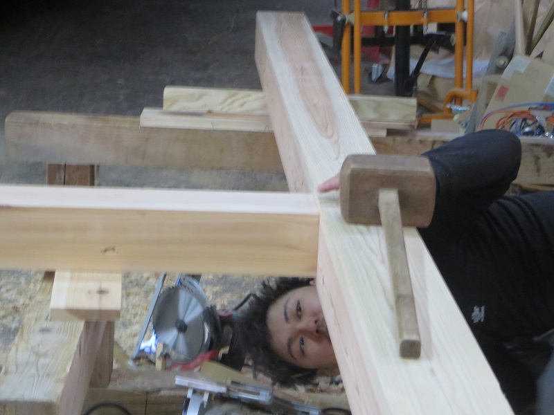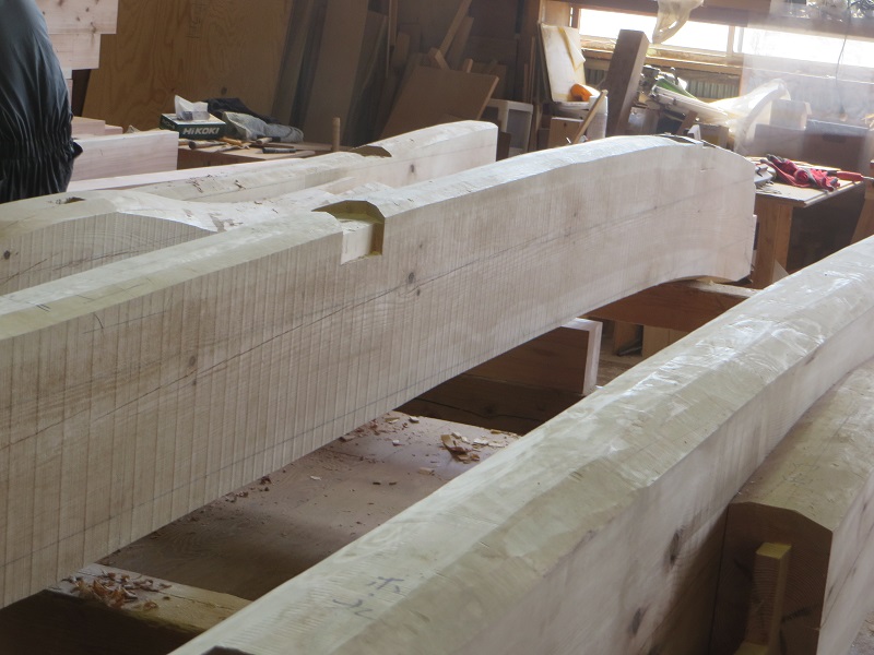杉5寸角の通し柱の刻みも進めています。各方向から梁桁が差し込まれるので、一度組んで確かめながらの刻みになります。