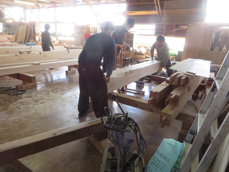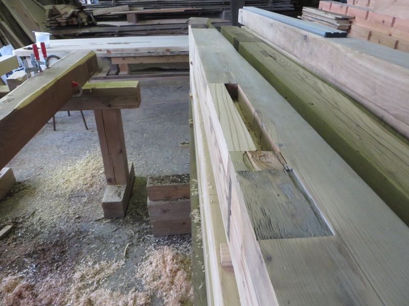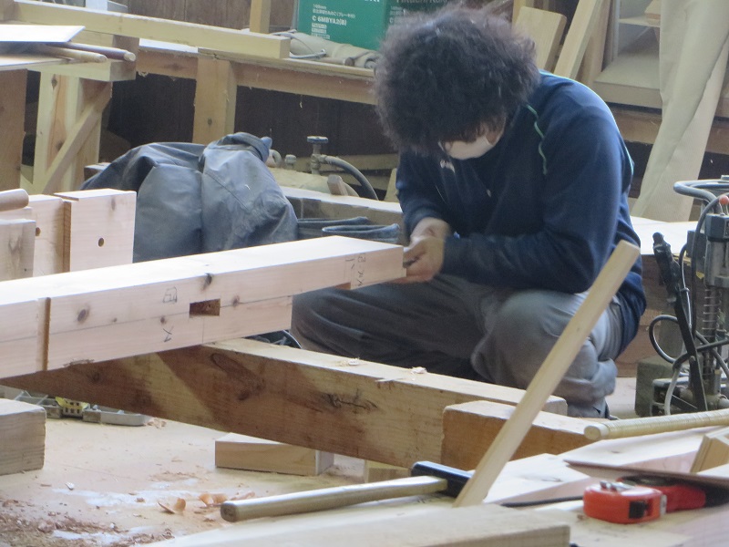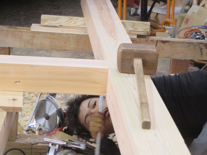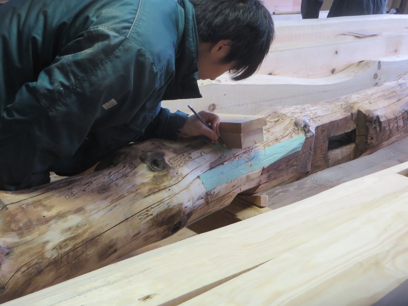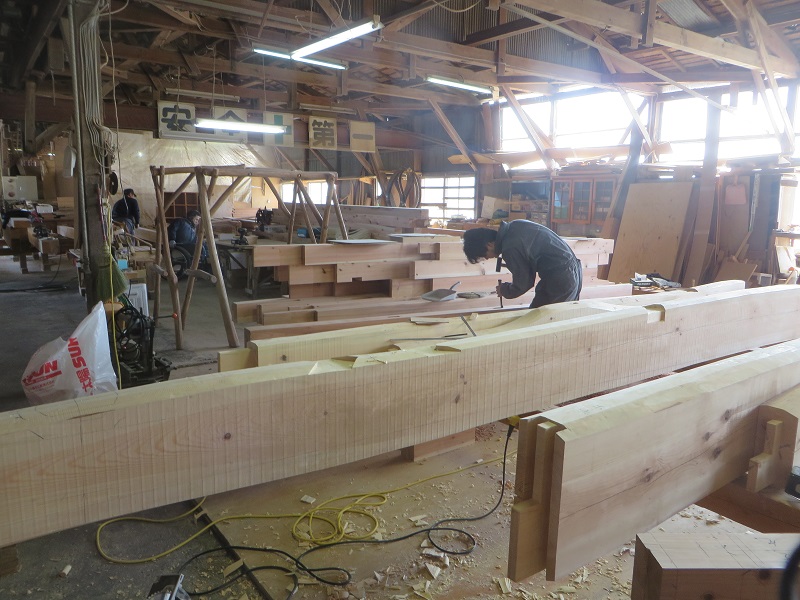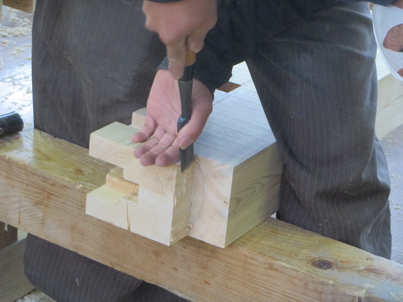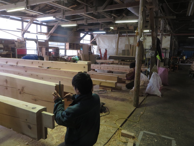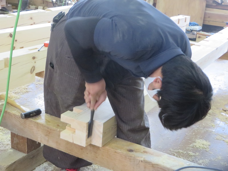 杉5寸角の通し柱の刻みも進めています。各方向から梁桁が差し込まれるので、一度組んで確かめながらの刻みになります。