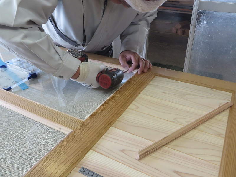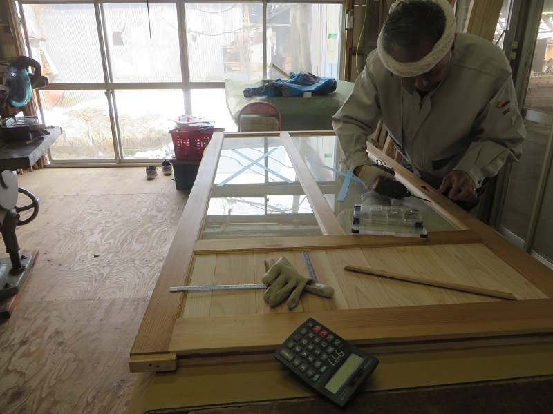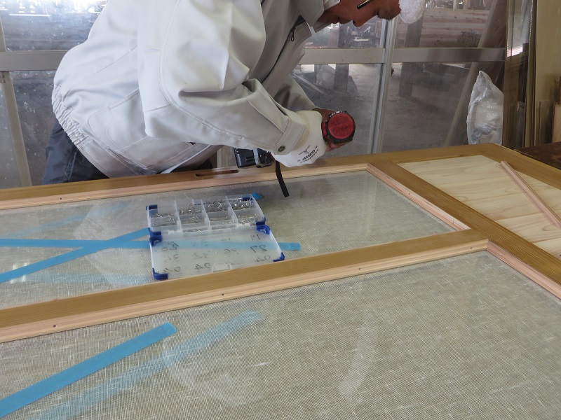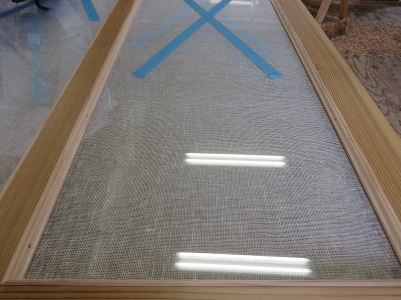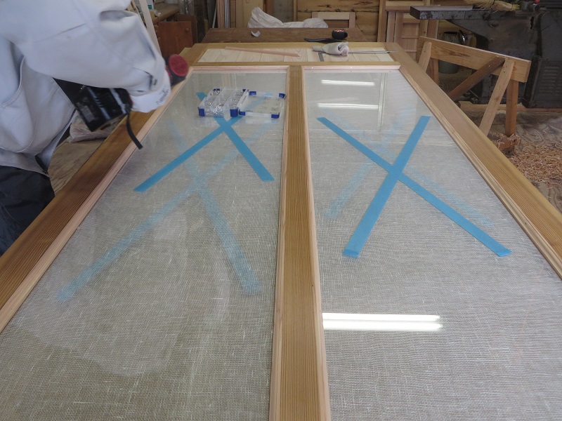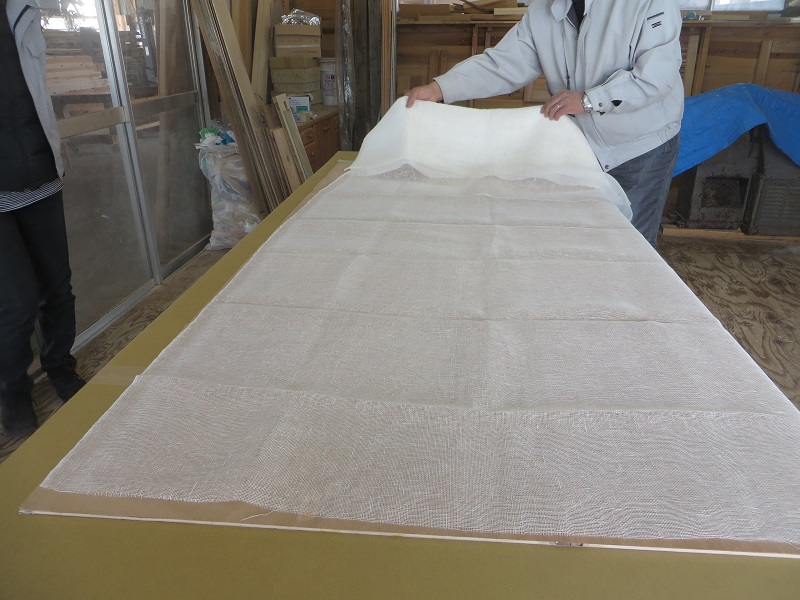 現在建具職人が一生懸命に取り組んでいるのが、茅布をガラス板でサンドイッチするガラス戸造りです。しかも古建具の再生品でした。広げた布に霧吹きで水をかけ晒して、アイロンで延ばしてからガラスで挟むのだそうです。