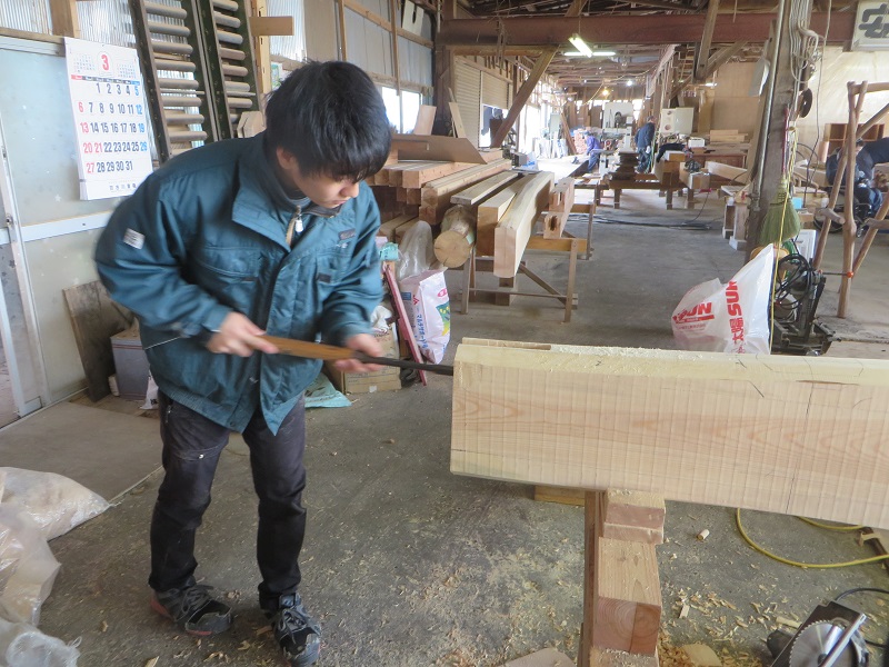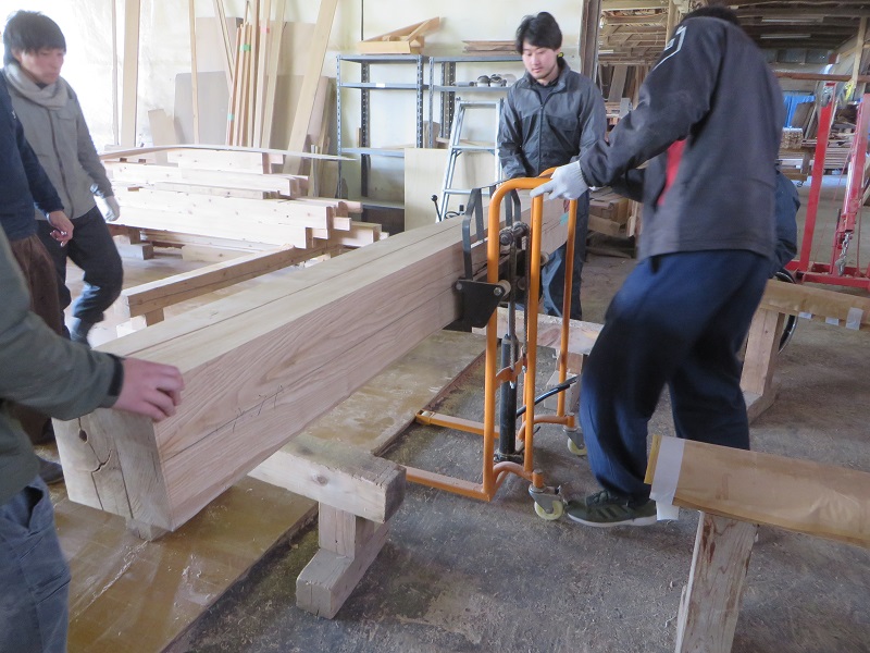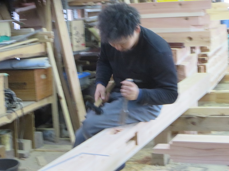 栗8寸角の大黒柱の刻みに取り掛かっていました。200kgと思われるとても重く頑丈な栗材です。無理して腰を痛めない様にと昨年購入した手動リフトが活躍しています。