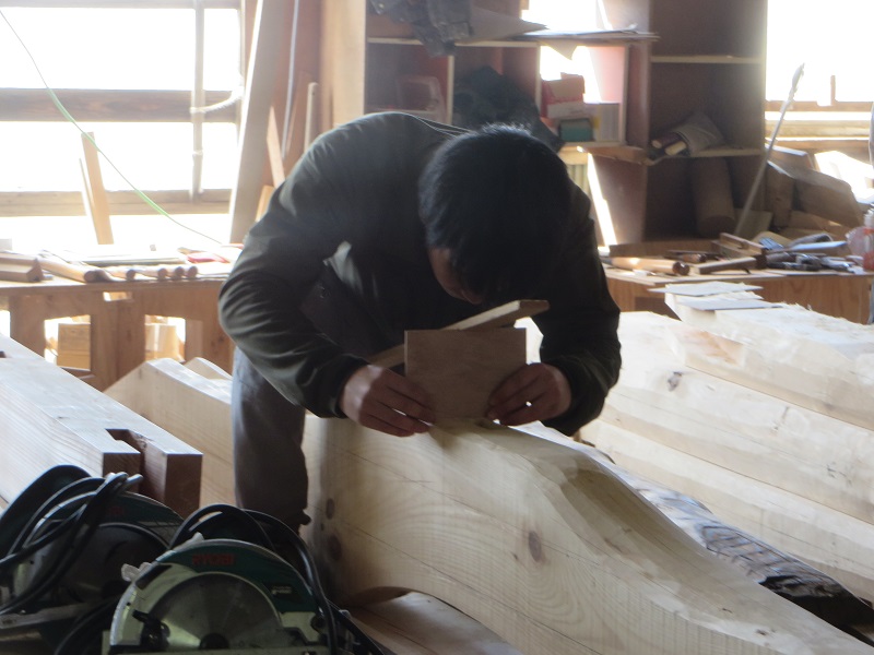 昨日の鑿に続き今日はひかり付けです。四角い木材同士なら単純に直角直線でかみ合わせが加工できるのですが、相手が局面で曲がり材だと、その姿を写し撮る必要があります。その作業を「ひかる」と呼んでいます。自然の木を扱うにはこの技術が当然ながらに必要となります。なぜならなば、自然界には人間に都合よく垂直直角な木はないからです。この作業には教科書は無く、実践を通して体験して学ぶのが一番の手法です。なので、伝統を継承する縁は、実践の体験の継続が重要です。