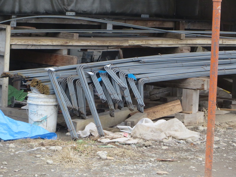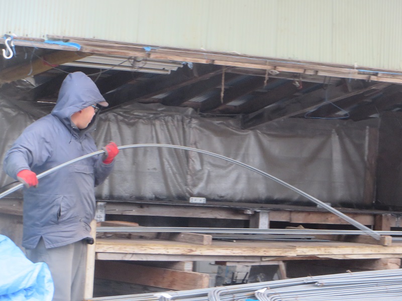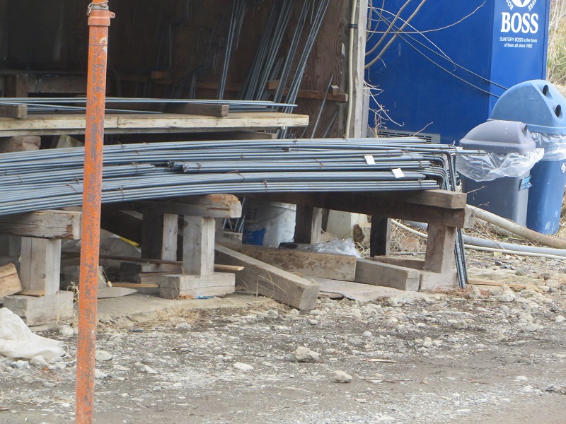 当社では、大工工事のみならず、基礎工事も自社施工しています。住宅の基礎配筋に使用する鉄筋の加工も自社で、必要長さに切断し、曲げ加工も行っています。写真の加工された鉄筋は、現在基礎工事中の宮古の基礎現場で使用されていました。常にこうして、新築現場も改修現場でもここで準備されています。