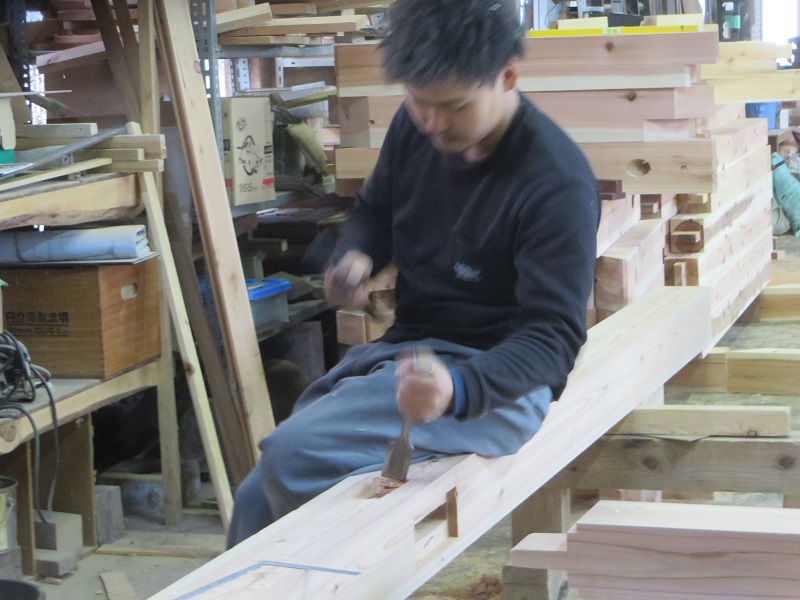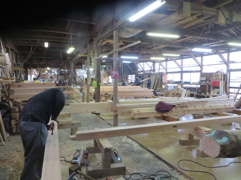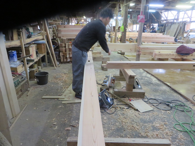 今週から活気付いていい雰囲気の作業場では、引き続きの手刻みが進んでいます。写真からも場内の音が聞こえて来そうな気がします。構造材の刻みは20代の若手が5人と50代の中堅熟練大工1人の計6人で刻んでいました。そして、万能機側の造作材の加工は還暦過ぎの熟練も5人の計11人の仕事風景が写真内に写ります。