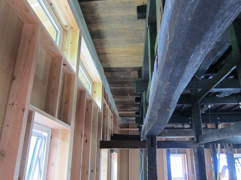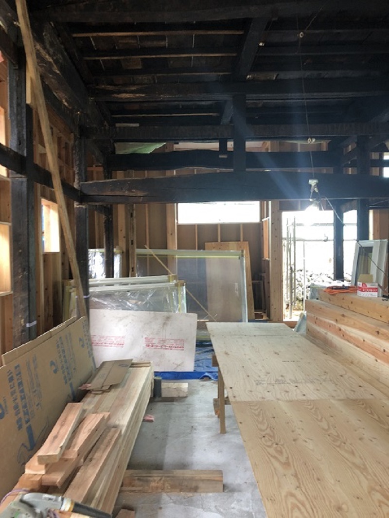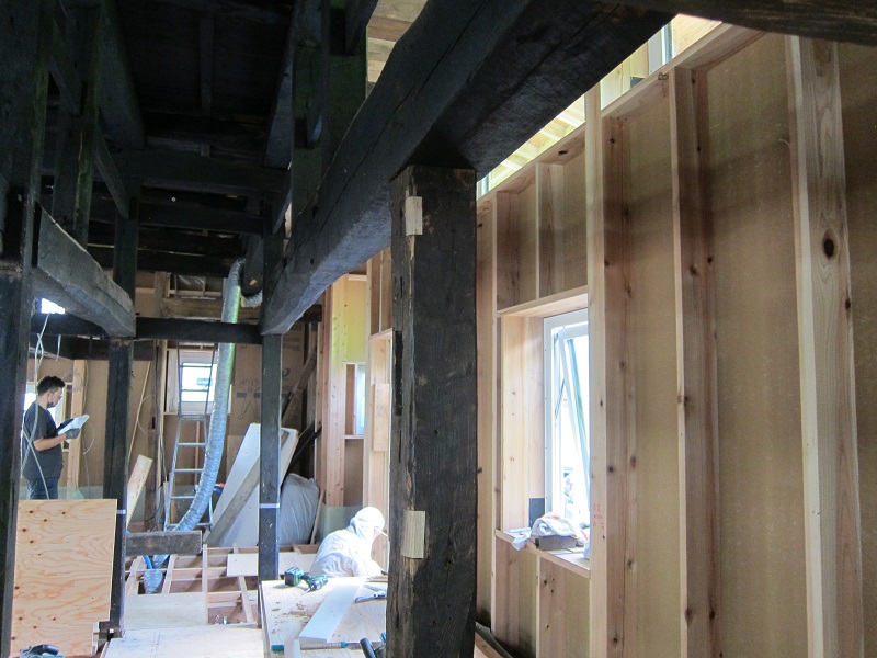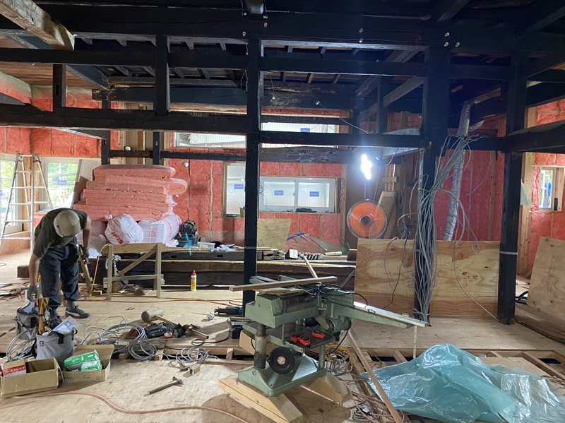 岩泉町大川地区での古民家大改修現場から届いた写真を見ると、200年前の古構造の補強と共に、外周部にピンク色の断熱材やトリプルガラスサッシ、上下水道の配管が入り込む写真が見られました。昔からの木組みと現代の温かく明るく住まう新技術が混ざり合い新旧融合する建物へと工事が進められています。正しく温故知新の家造りがここ大川の山奥で取り組まれています。そして、無垢の木を扱う大工の手業は今も昔も変わりなく、古来から連綿と伝わって来た尊い技術です。