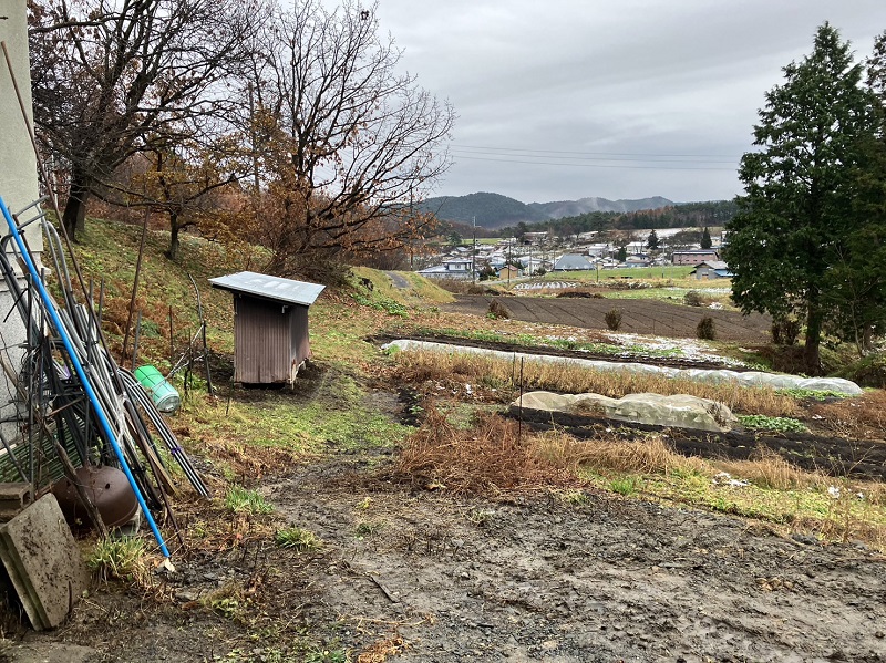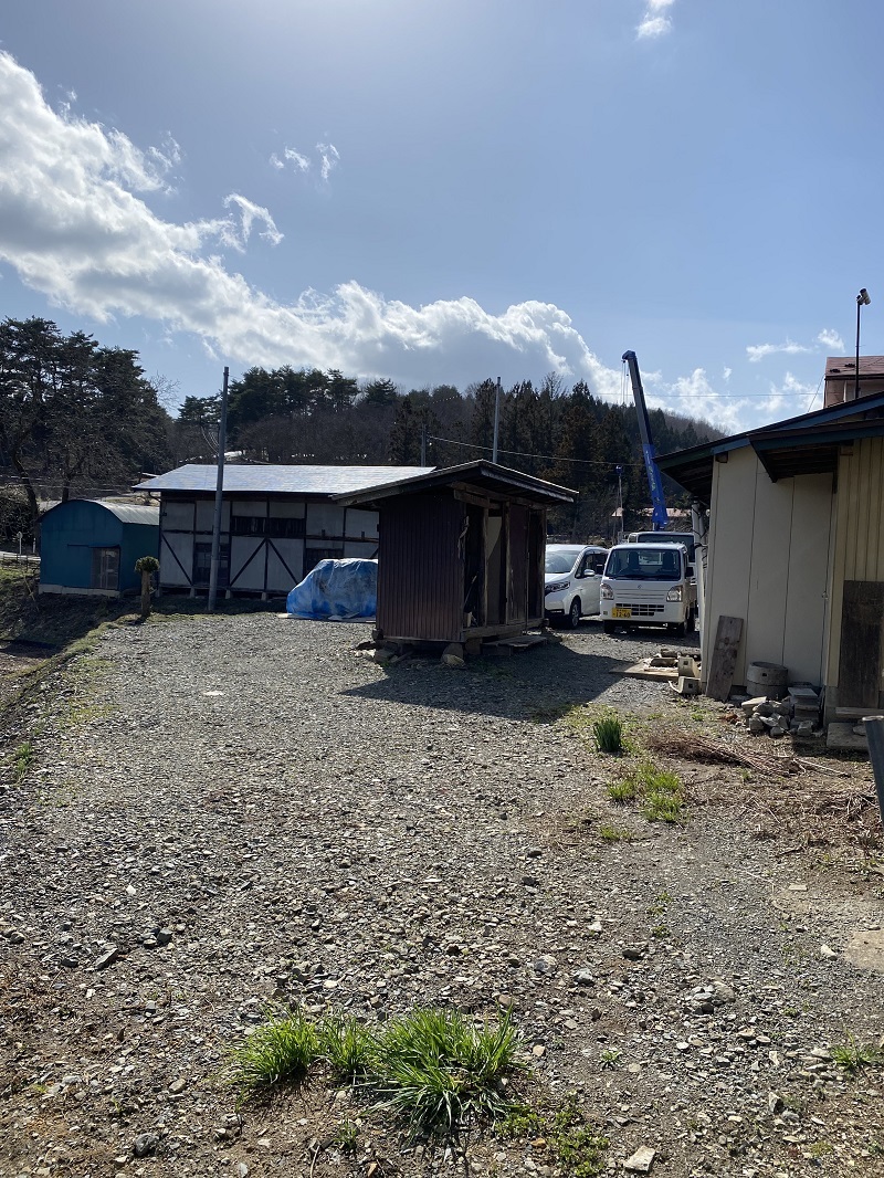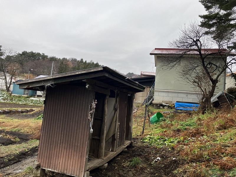 九戸村での大改修工事現場で、以前から頼まれていた外小屋トイレを畑側に移設する工事を行いました。雑木の木組みの小屋なのでかなりの重量だったらしく、釣りあげたクレーンの脚が浮いてしまって青ざめた瞬間があったとの事でしたが、事故も無く無事移設完了しました。畑側に置いた方がしっくりとしていい絵になる感じです。