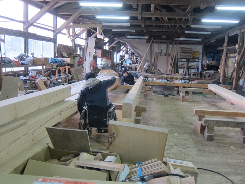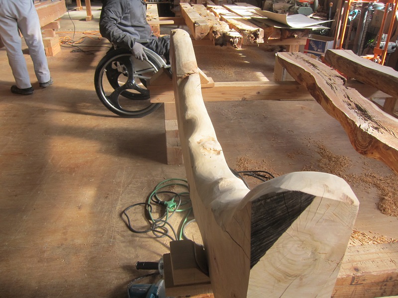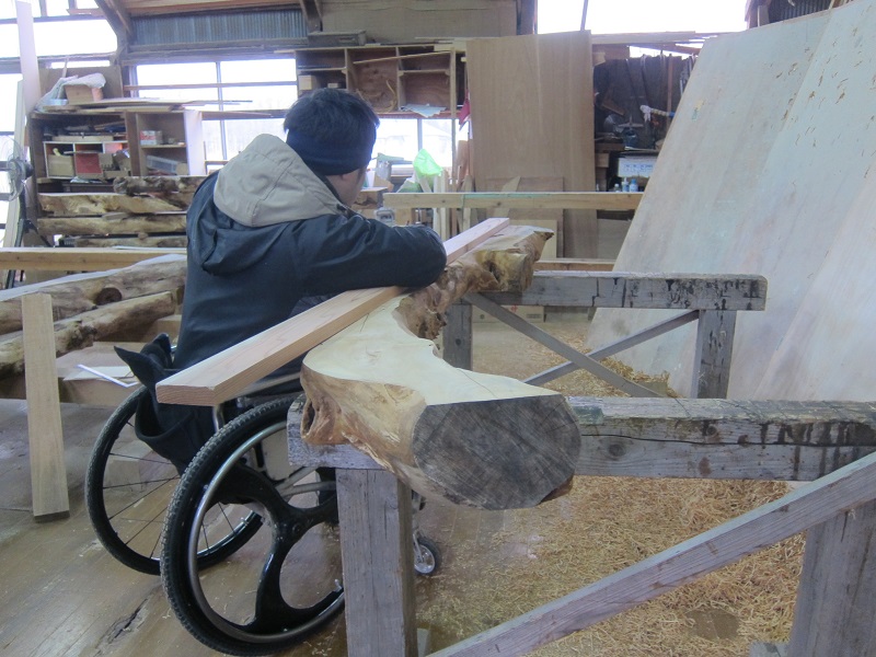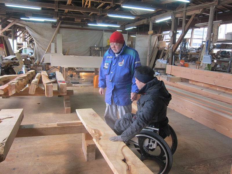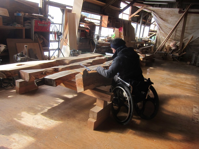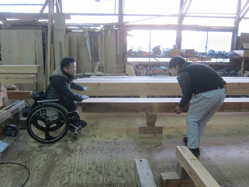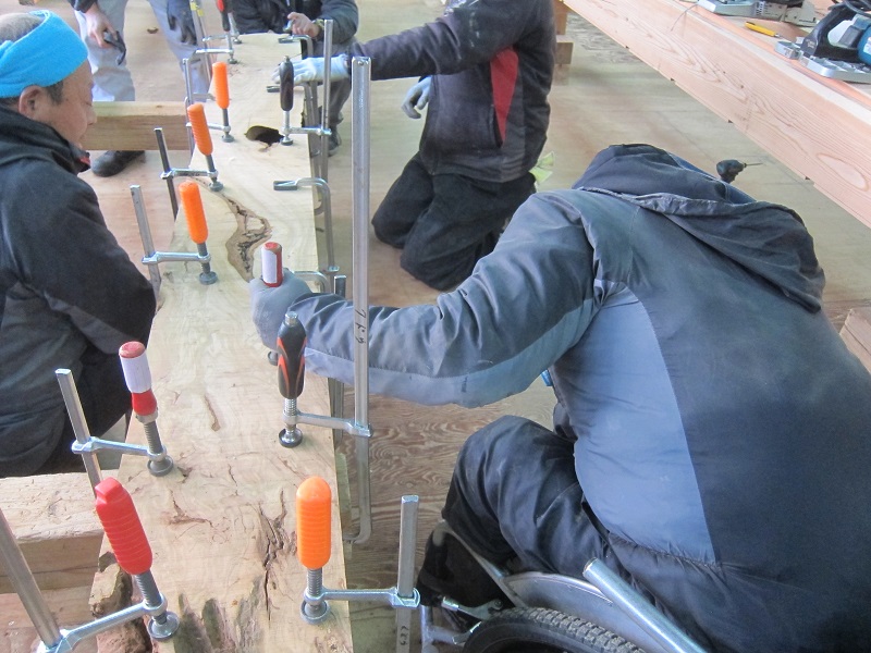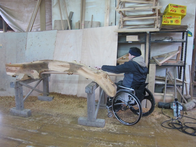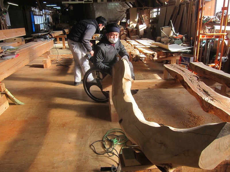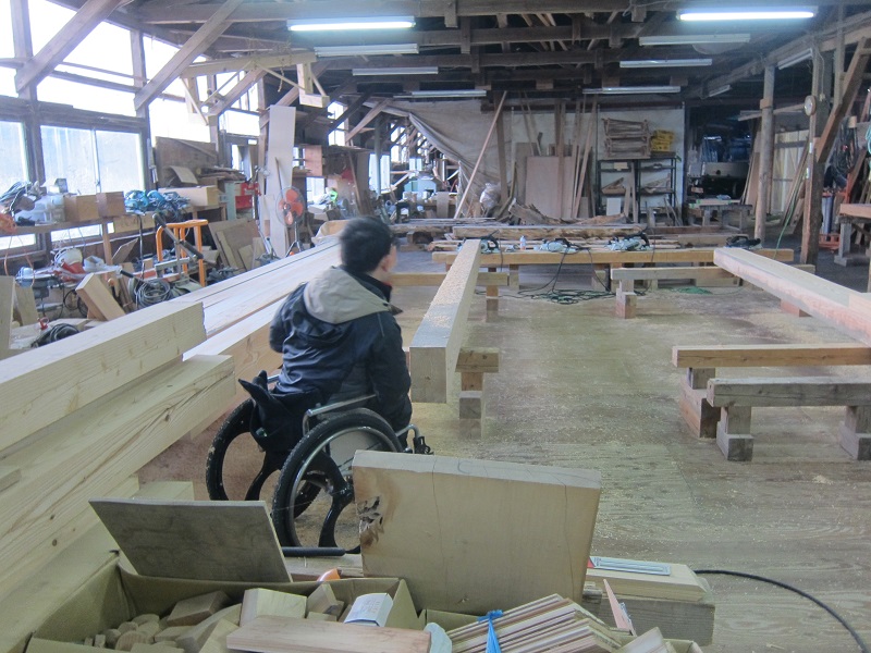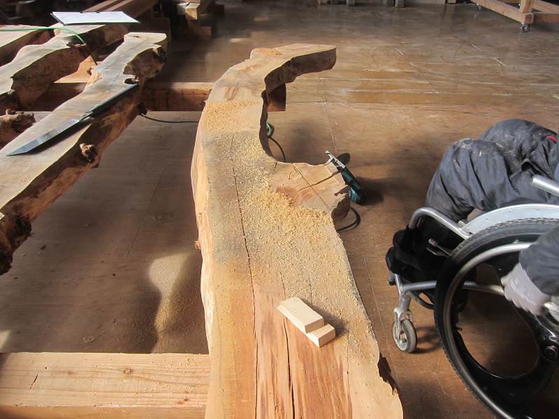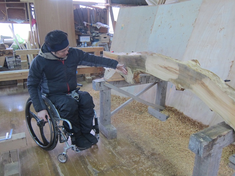 塗り込みの間に車椅子大工は板の所にスタンバイして