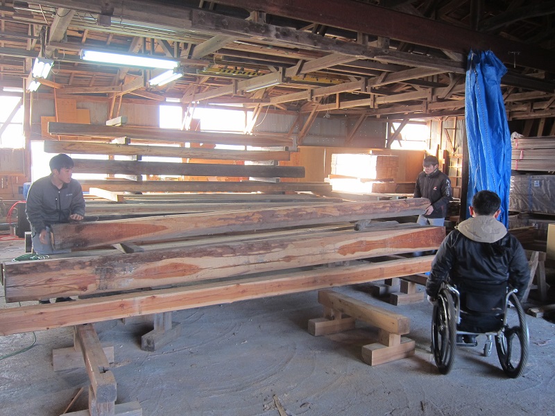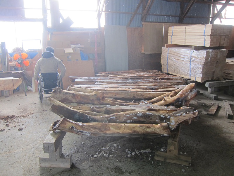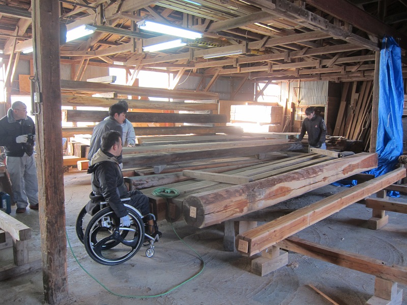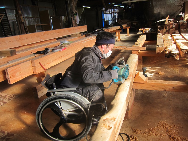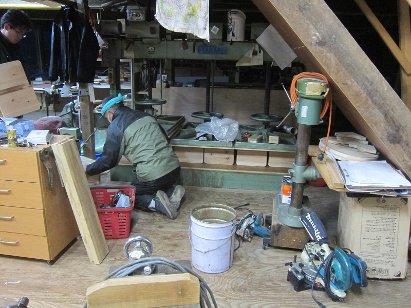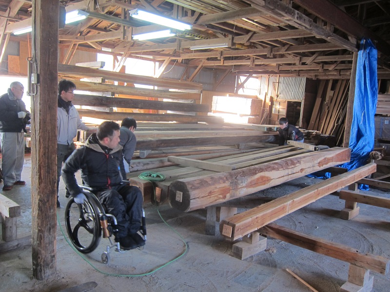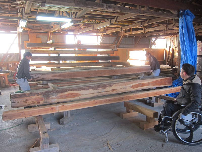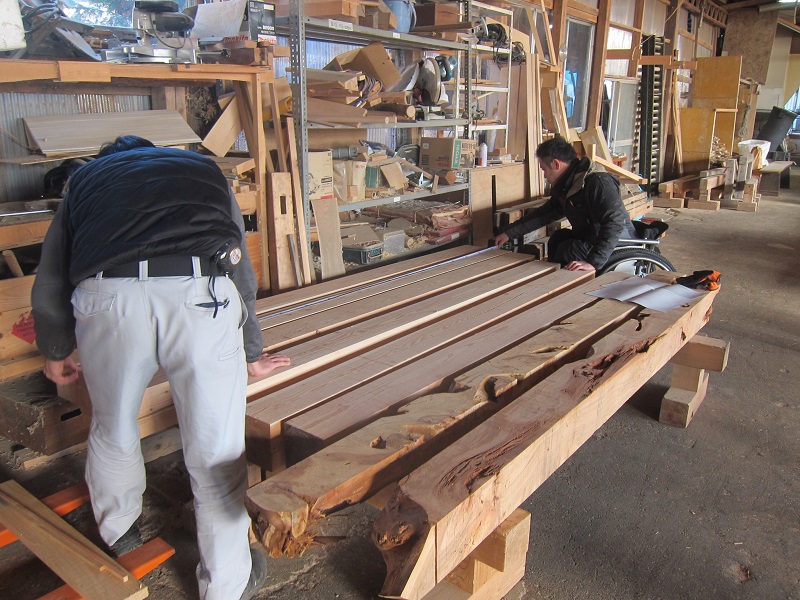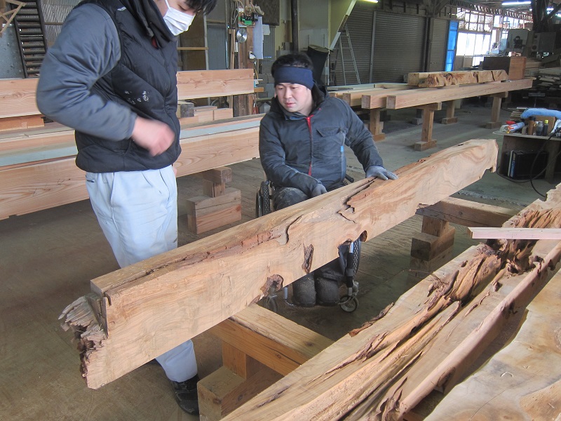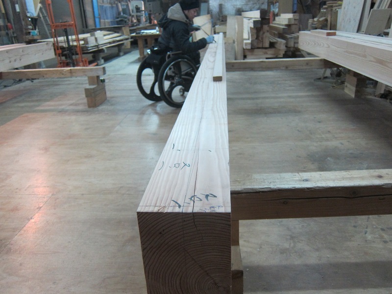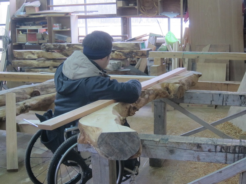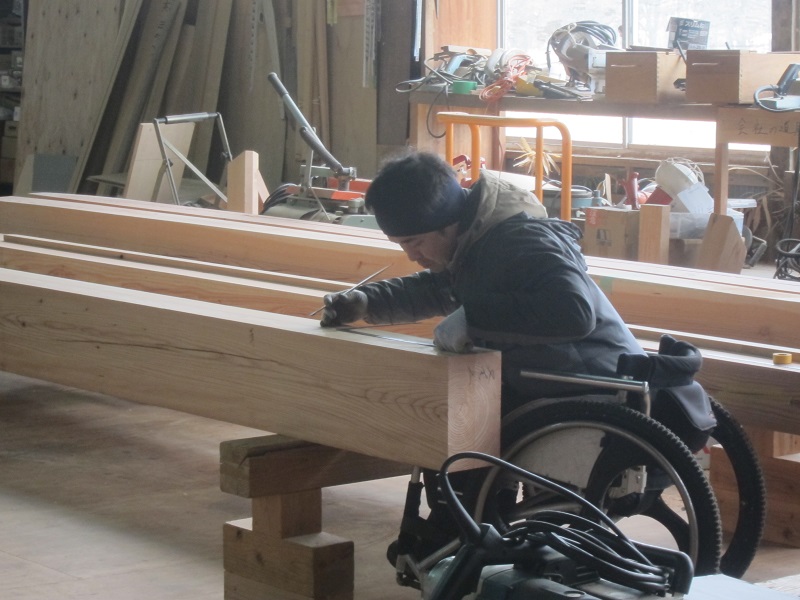 塗り込みの間に車椅子大工は板の所にスタンバイして