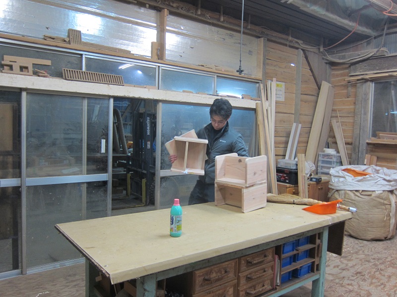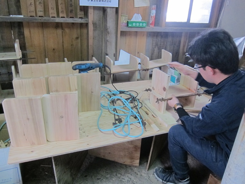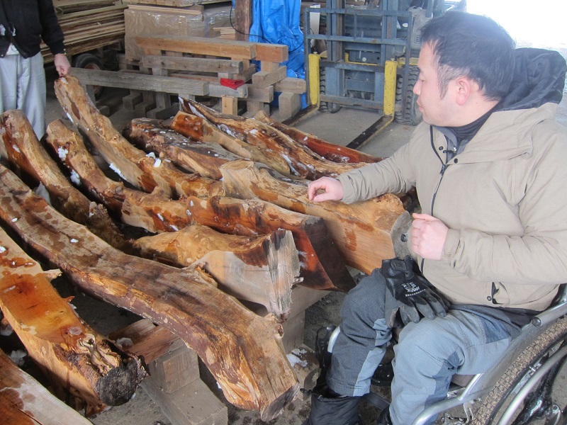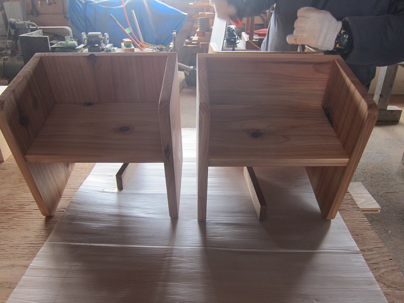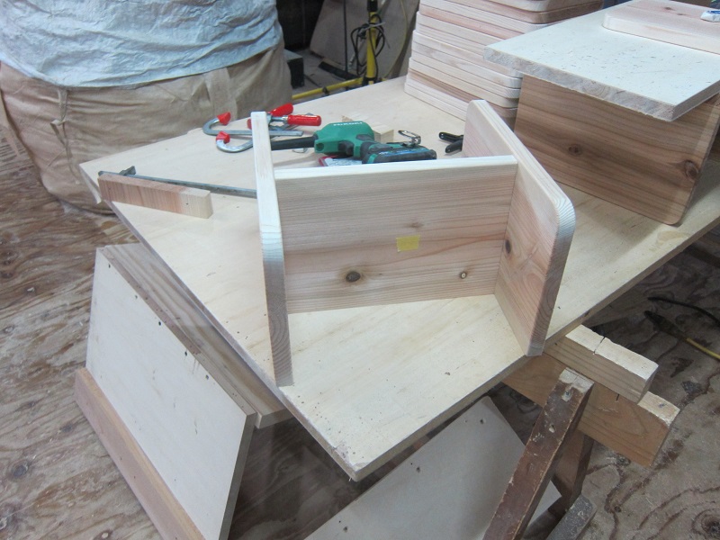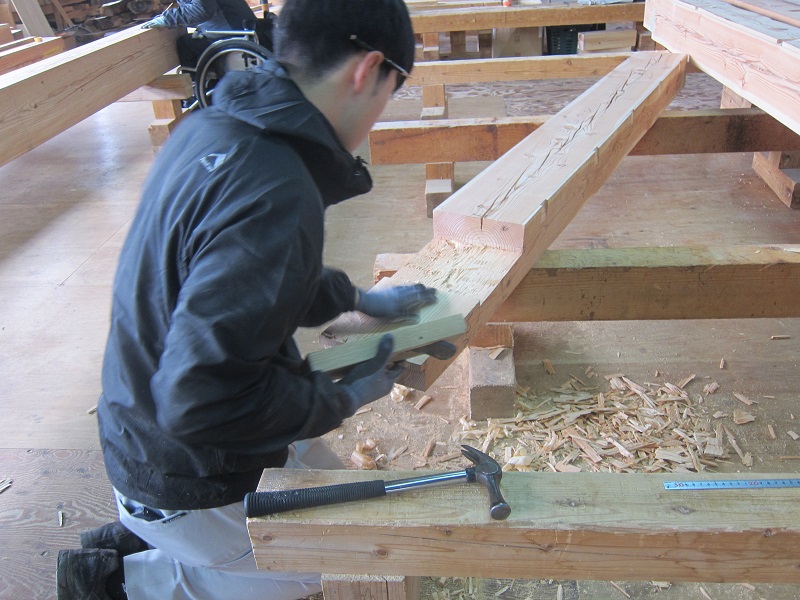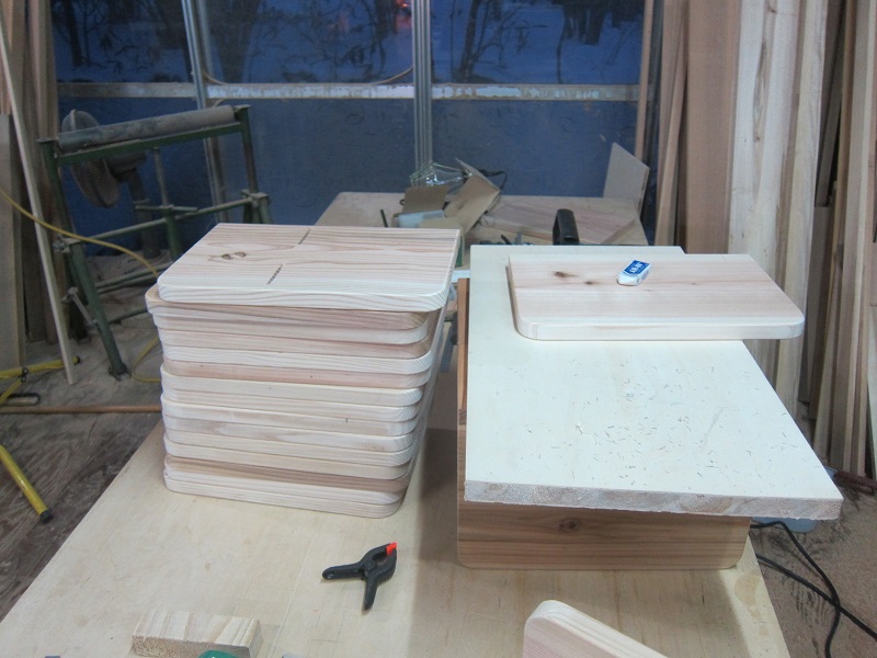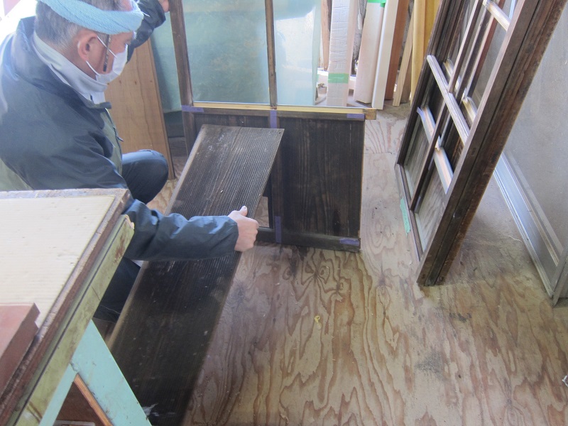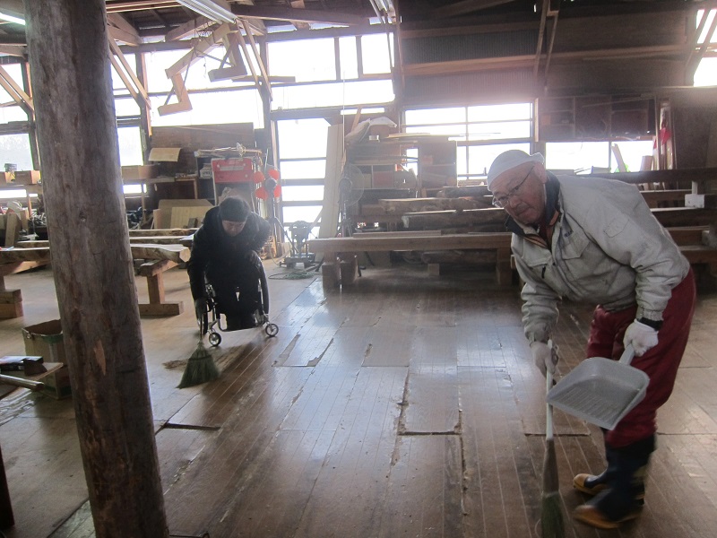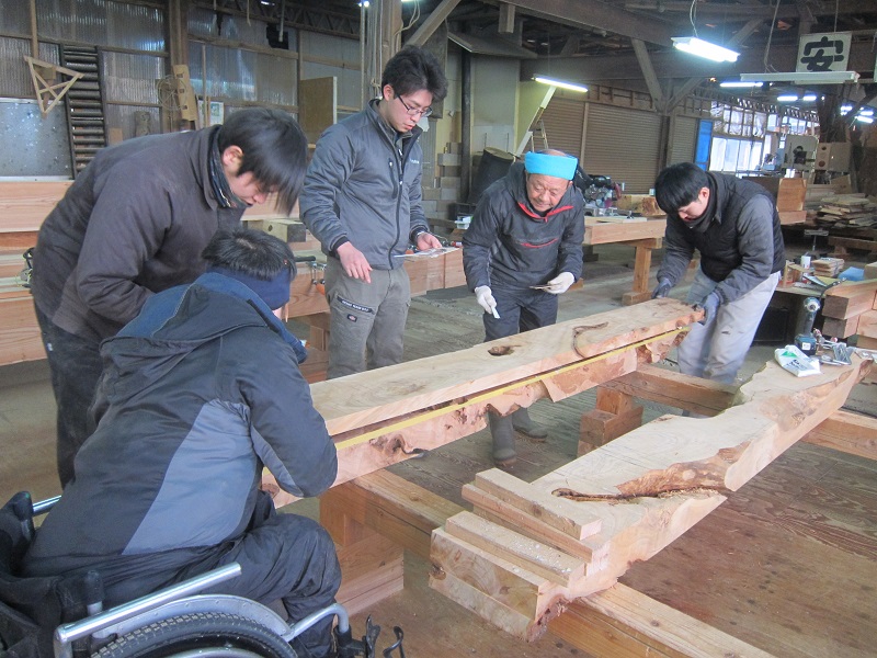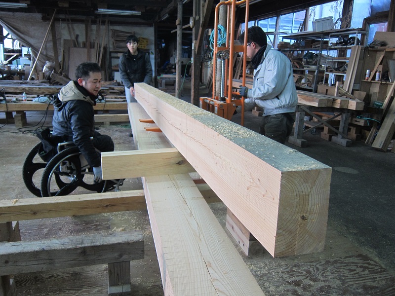 塗り込みの間に車椅子大工は板の所にスタンバイして