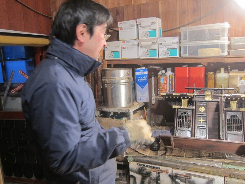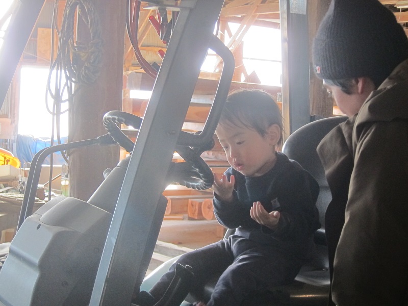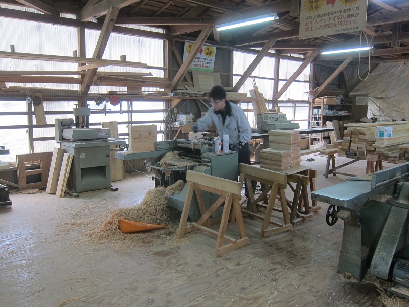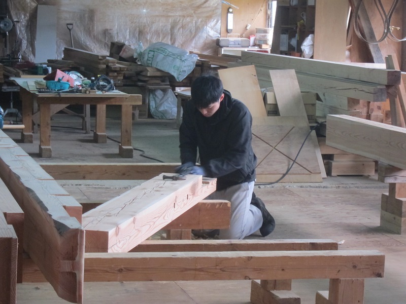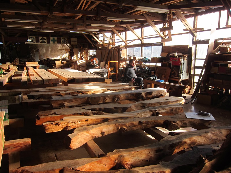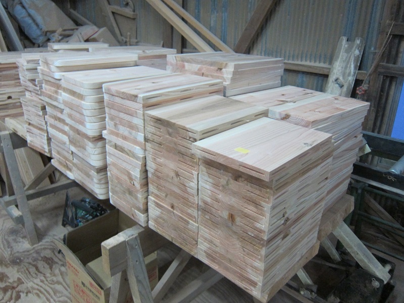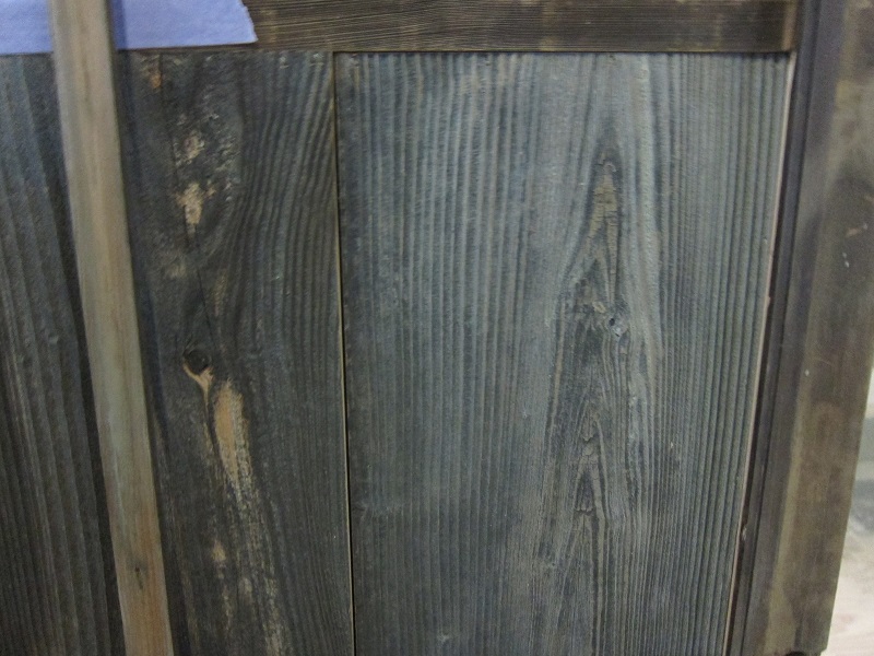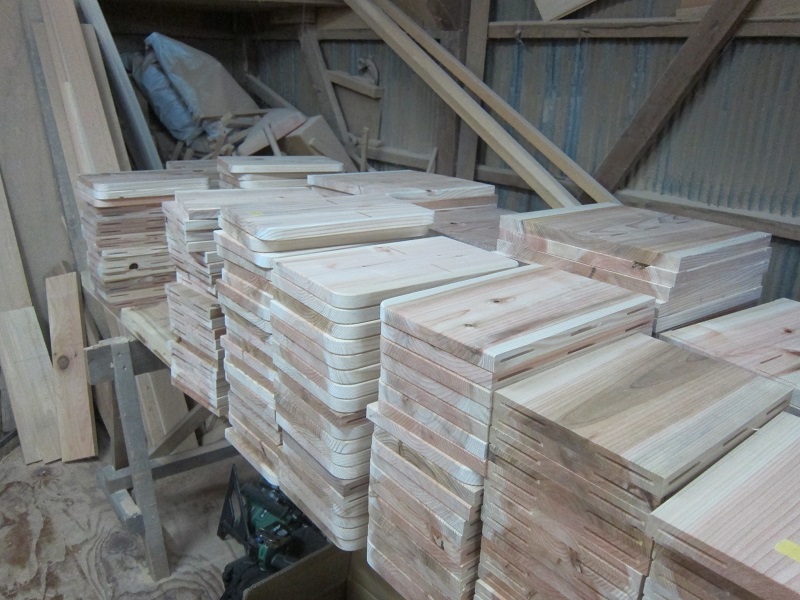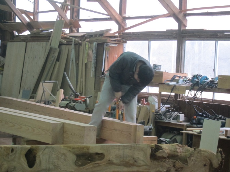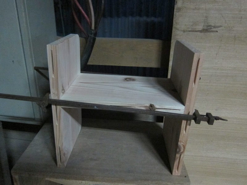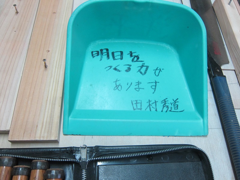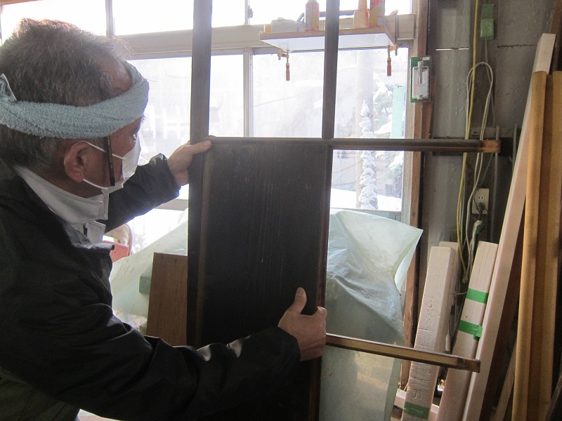 塗り込みの間に車椅子大工は板の所にスタンバイして