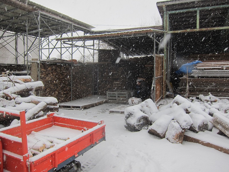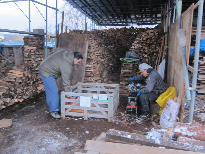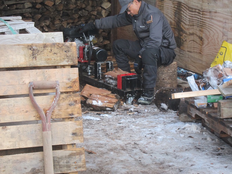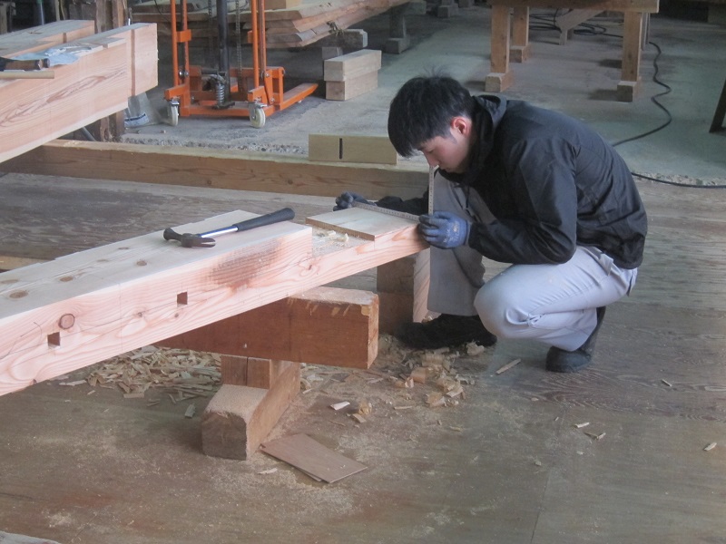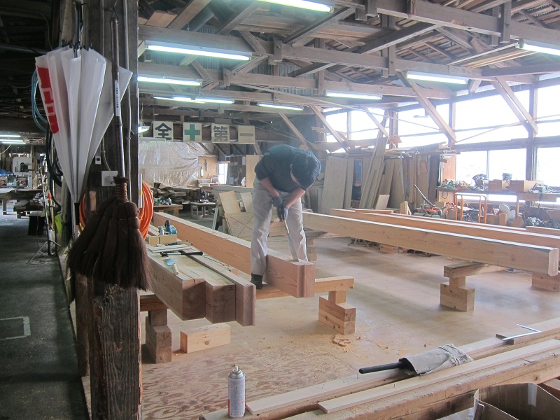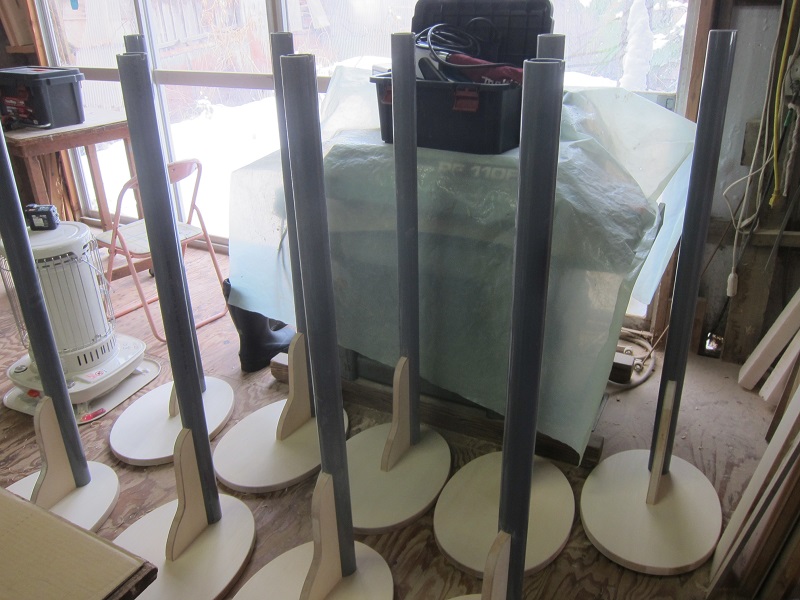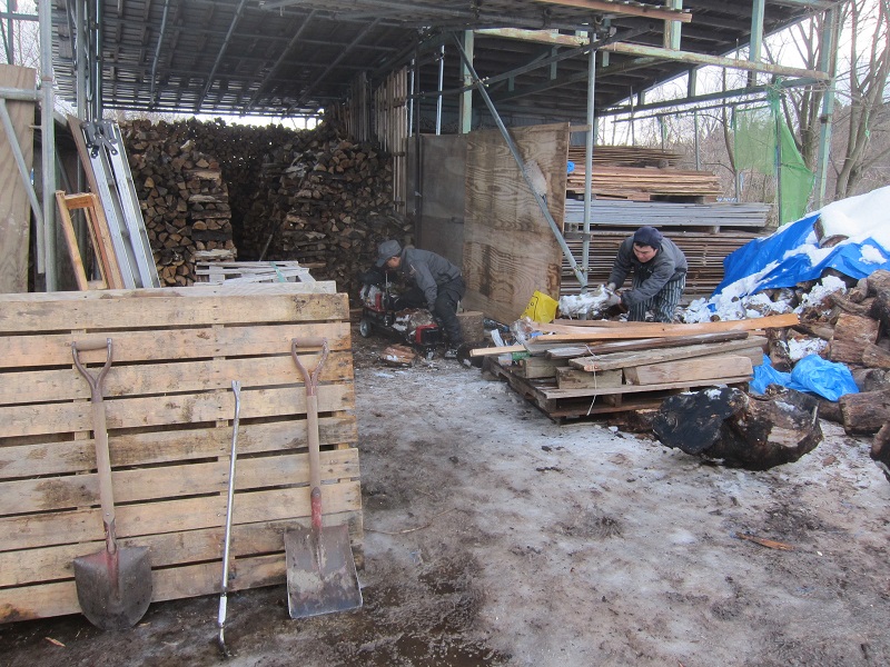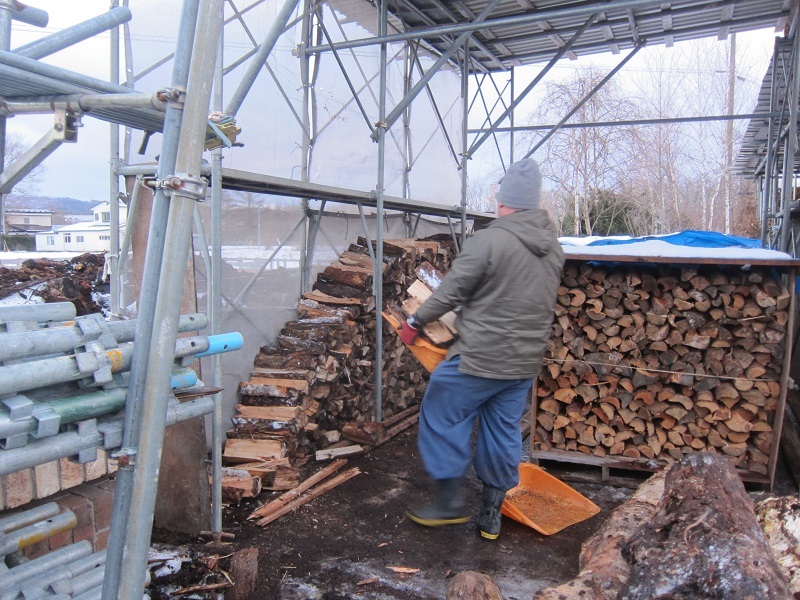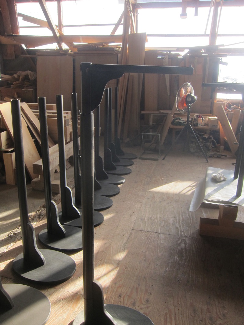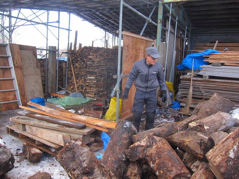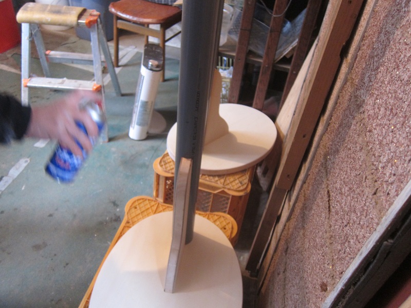 塗り込みの間に車椅子大工は板の所にスタンバイして