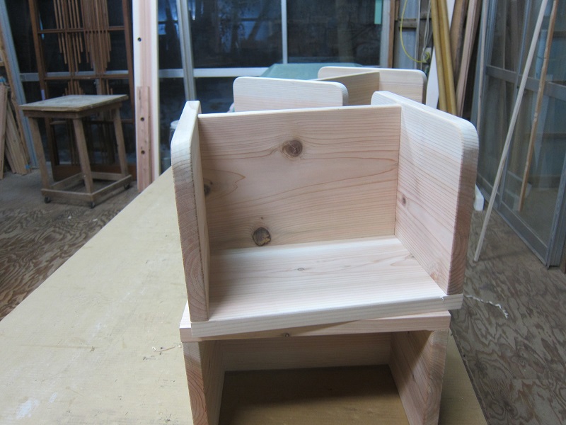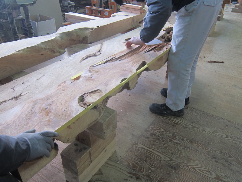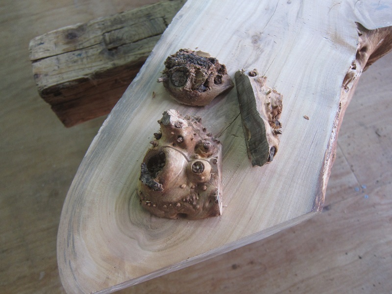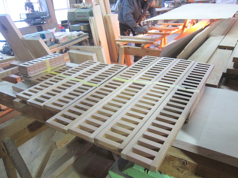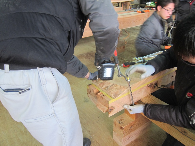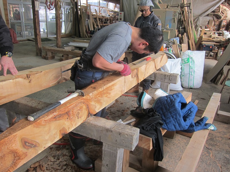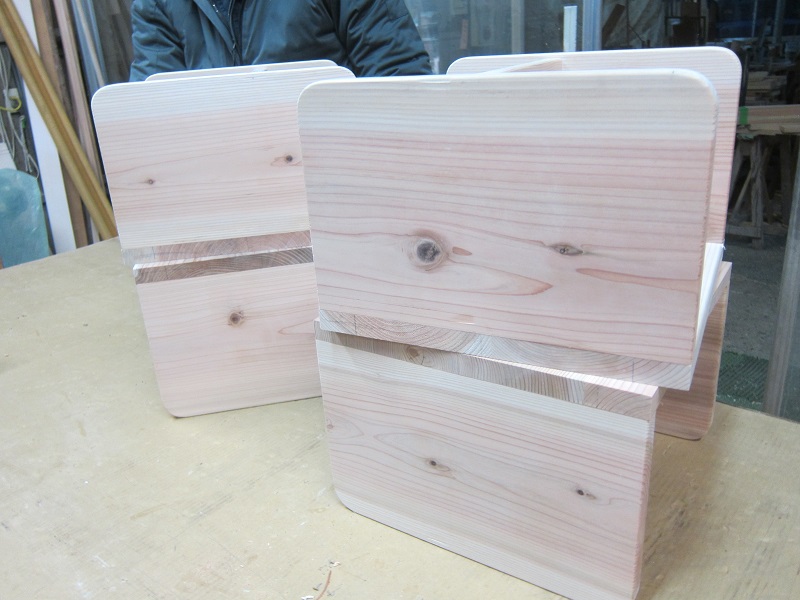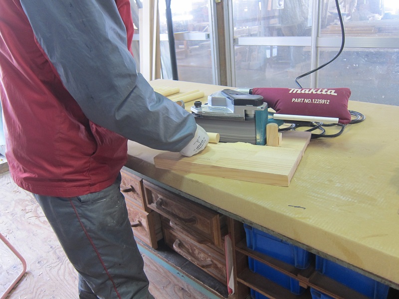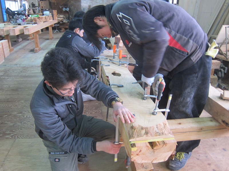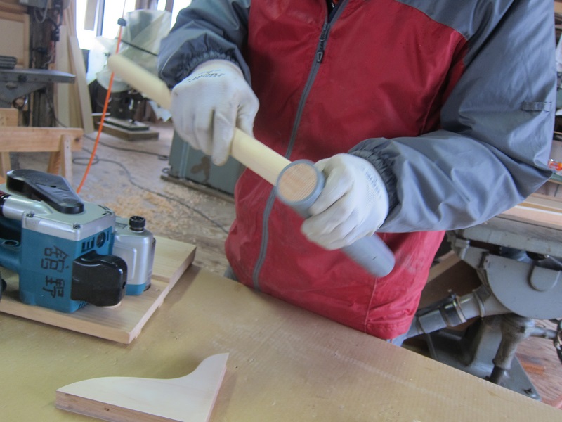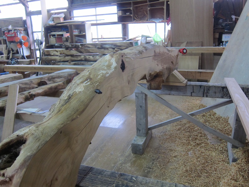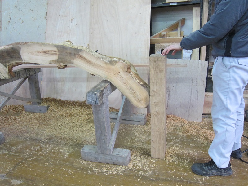 桜材を何が何でも使う理由があります。元の園庭の桜の木だからなのですが、いざ使おうと加工するとかなりの難儀材です。洞が有った部分は当然の如くですが、その周りは割と確りしているので、丈夫な板を張り付けて補強する作業を大勢の連携プレイで行う場面に遭遇してシャッターチャンスでした。