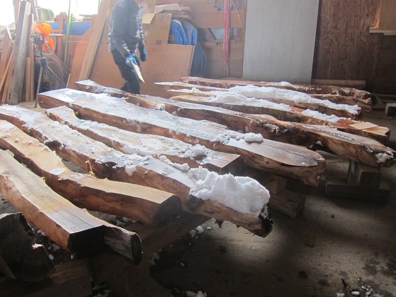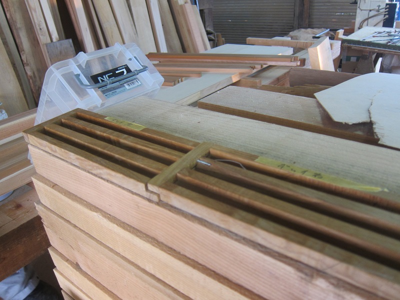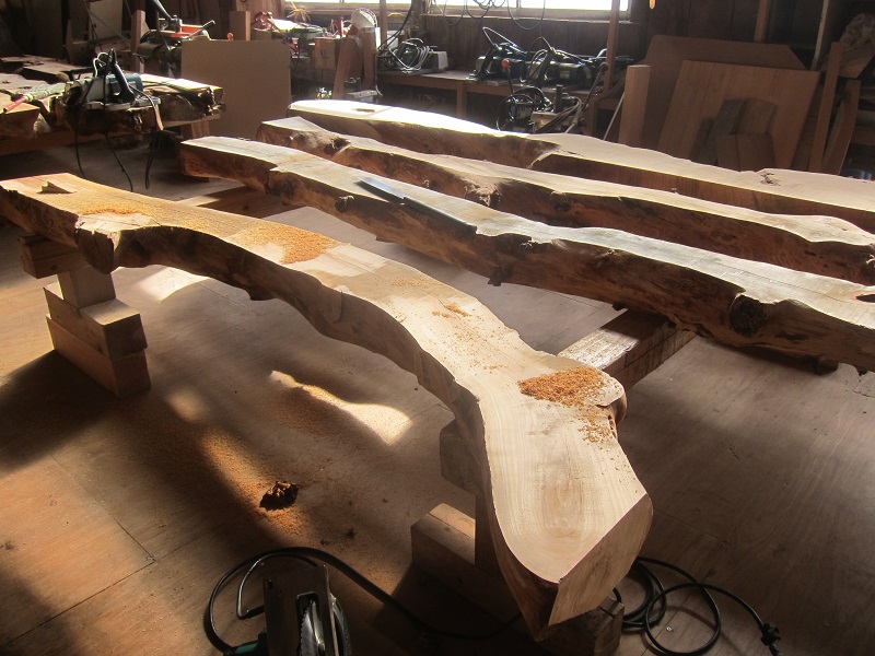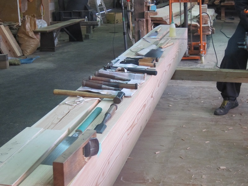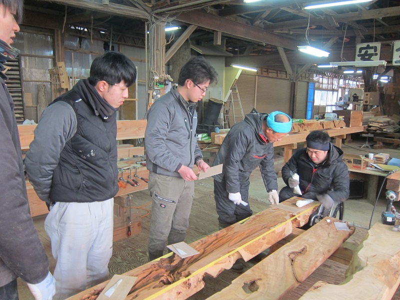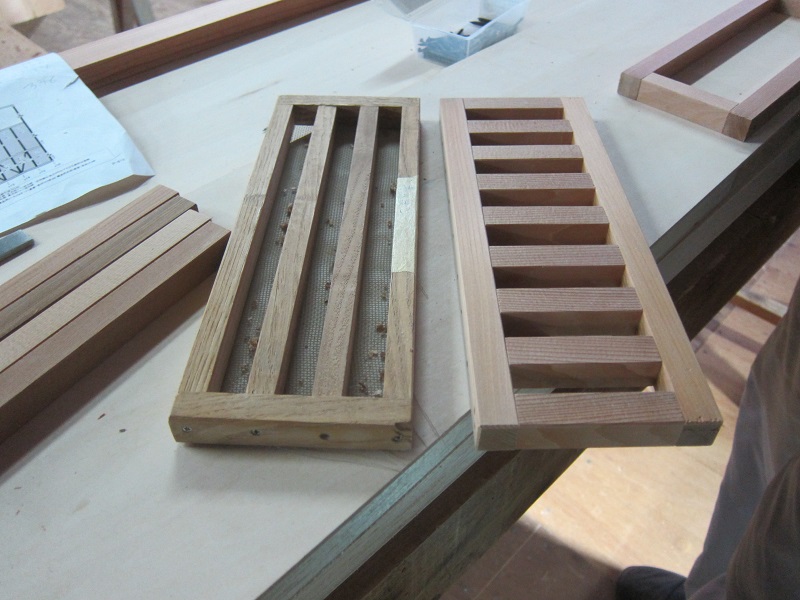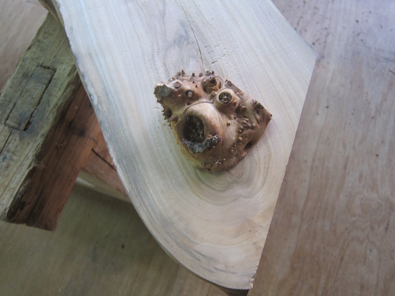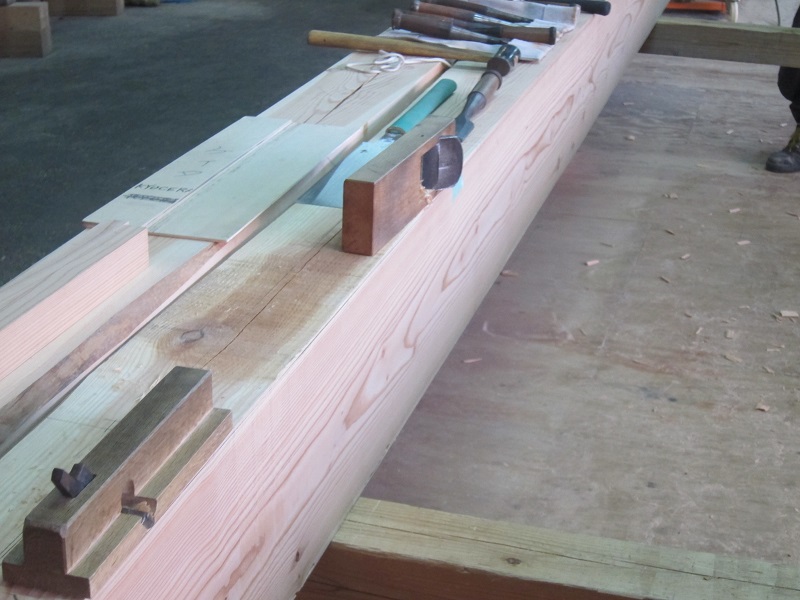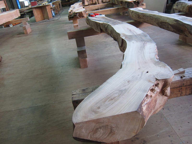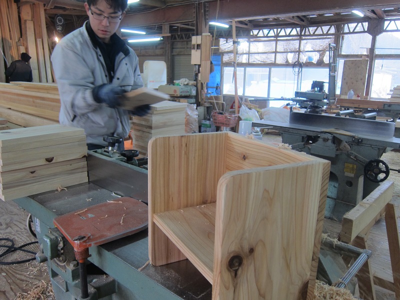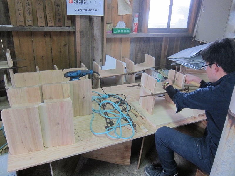 桜材を何が何でも使う理由があります。元の園庭の桜の木だからなのですが、いざ使おうと加工するとかなりの難儀材です。洞が有った部分は当然の如くですが、その周りは割と確りしているので、丈夫な板を張り付けて補強する作業を大勢の連携プレイで行う場面に遭遇してシャッターチャンスでした。
