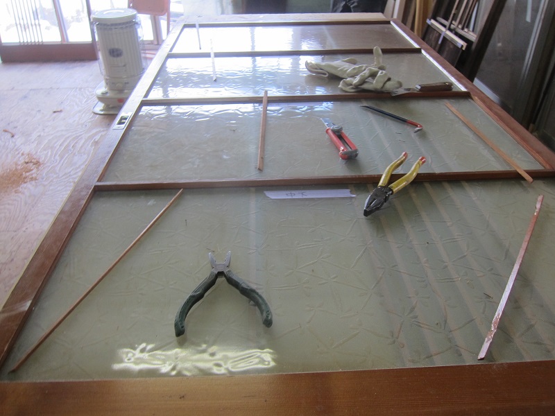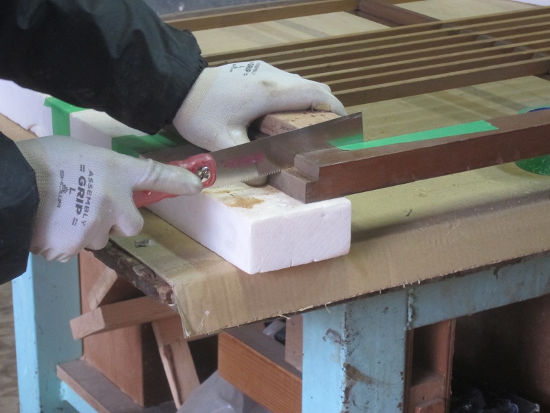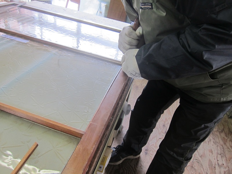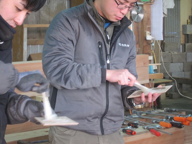この板を張り付ける打ち合わせをしていますが、接着樹脂は直ぐに乾いて大変だぞと注意されていました。