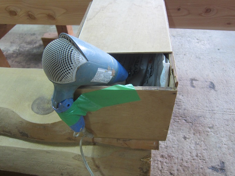 テープを張り、樹脂材を温めて張り付ける準備しています。