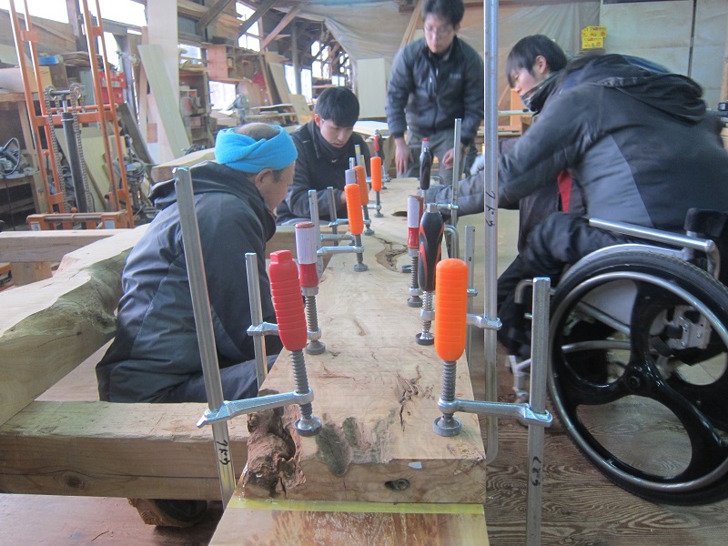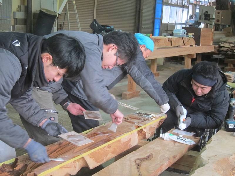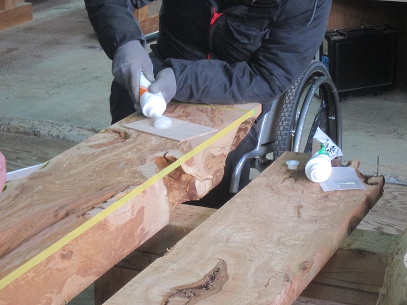 車椅子大工が接着樹脂をそれぞれが手にするベニヤ板に流し込みます。