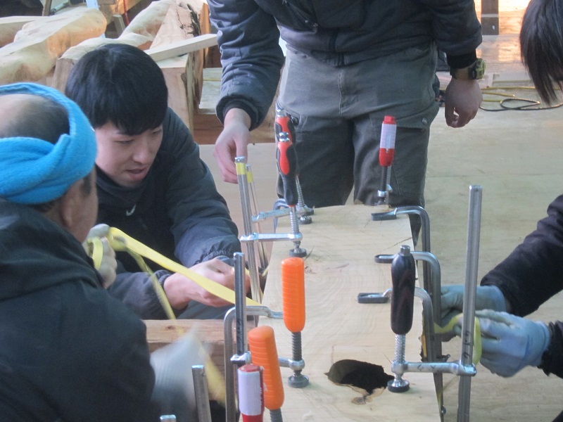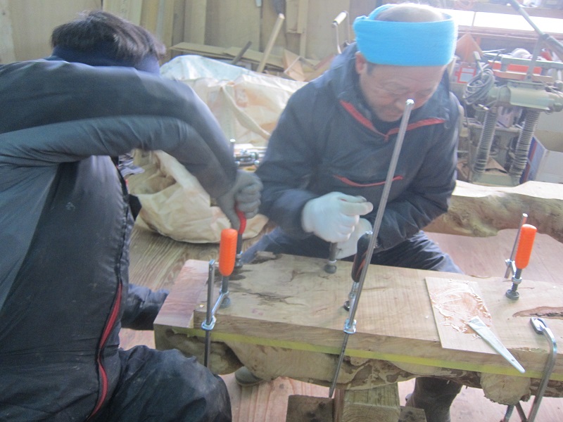 厚板を張り付けたので、大急ぎでクランプで締め付けています。