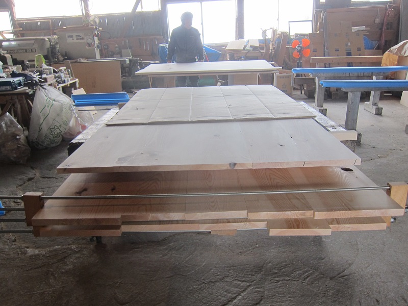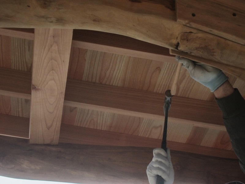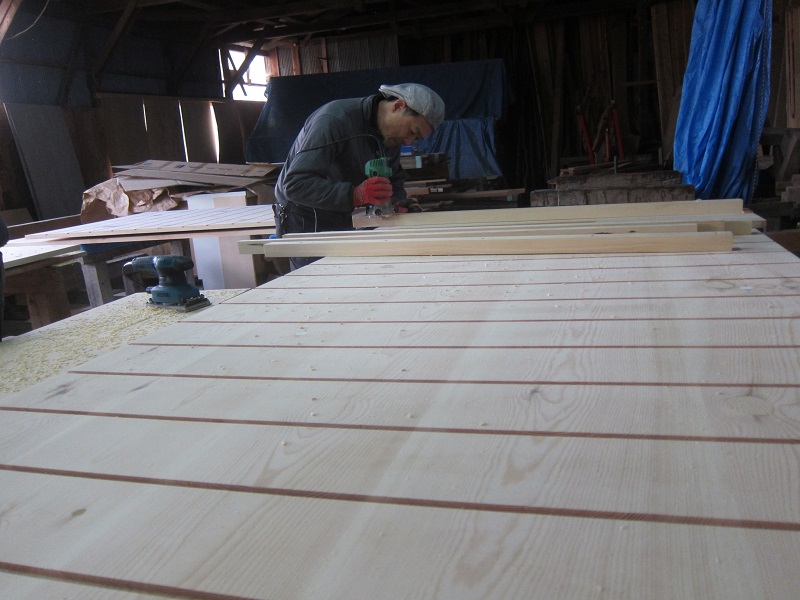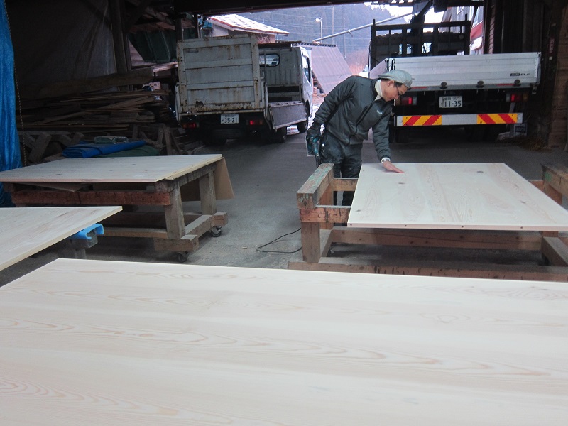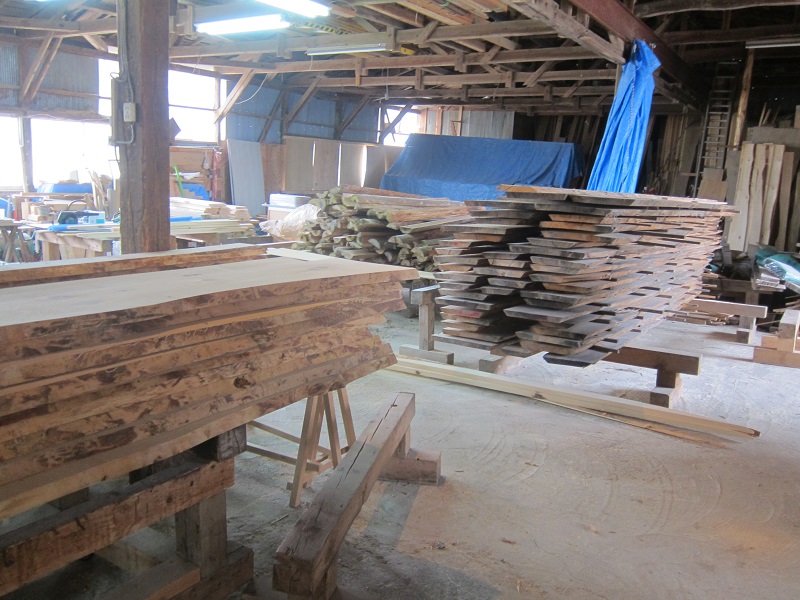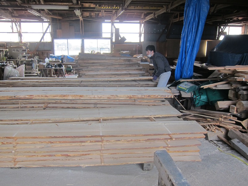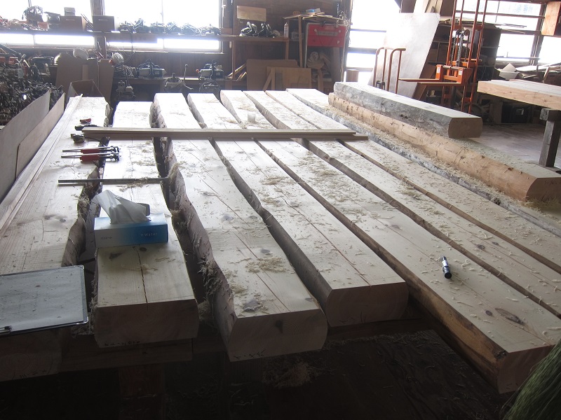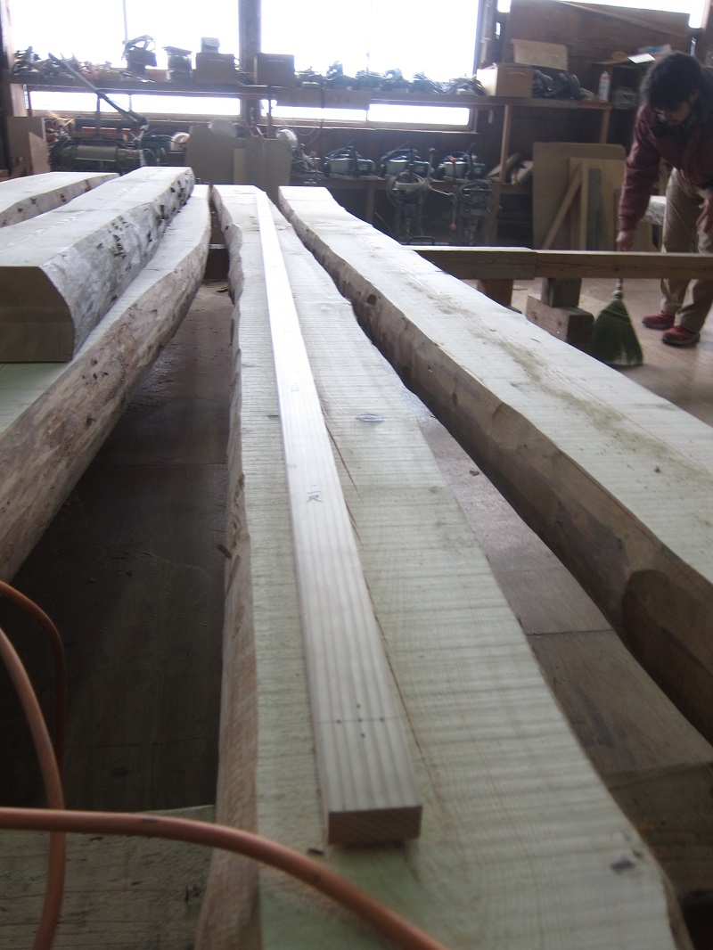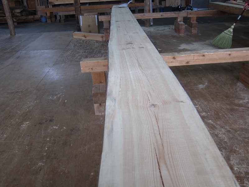 構造材の手刻みを終えて、上棟後に張り込む天井板の加工に取り組んでいます。丸太を購入して自社製材しすると1本の丸太から1本の梁が取れますが、それと同時にこの写真の様な板材も製材されて、何年も寝かして自然乾燥させた材が場内には大量に積み置かれていましたので、いよいよ出番到来です。