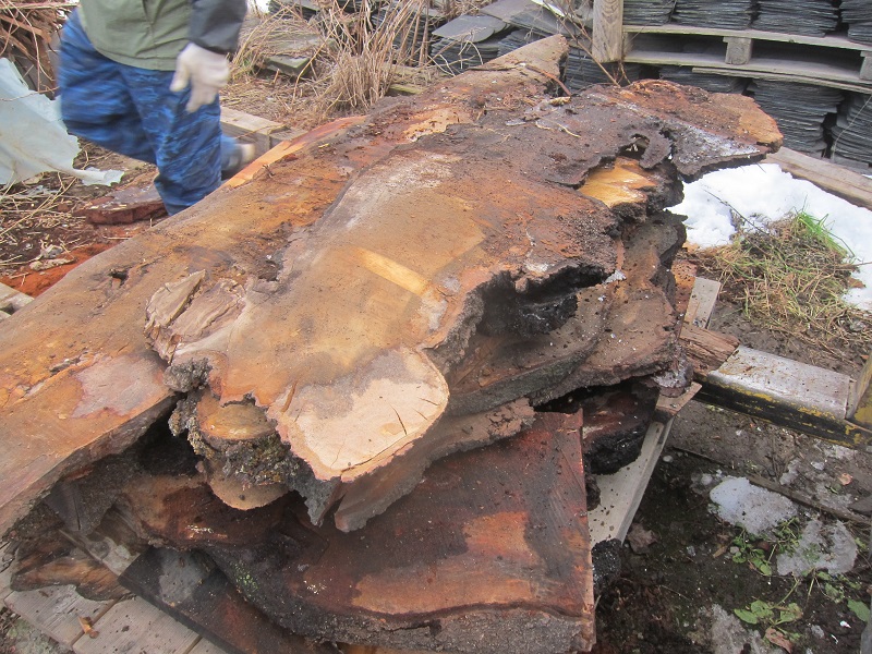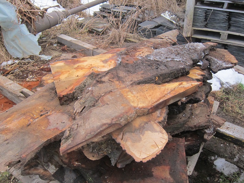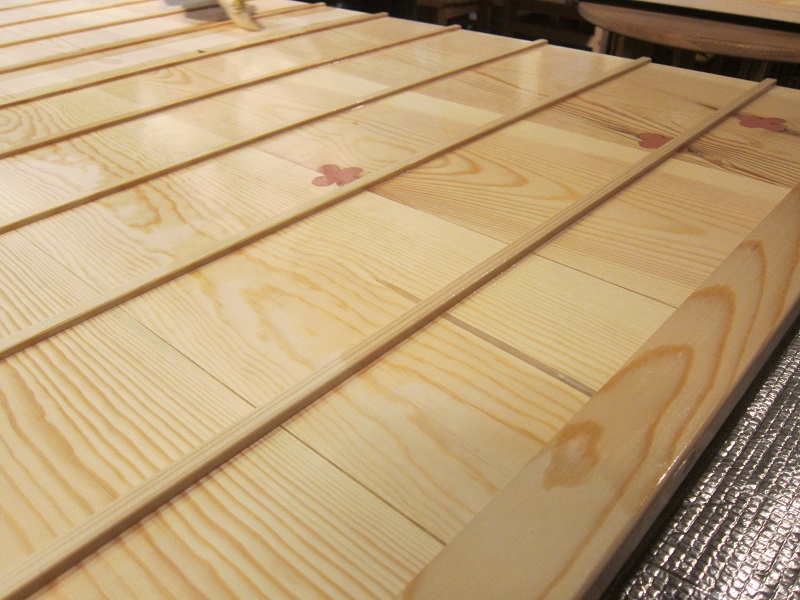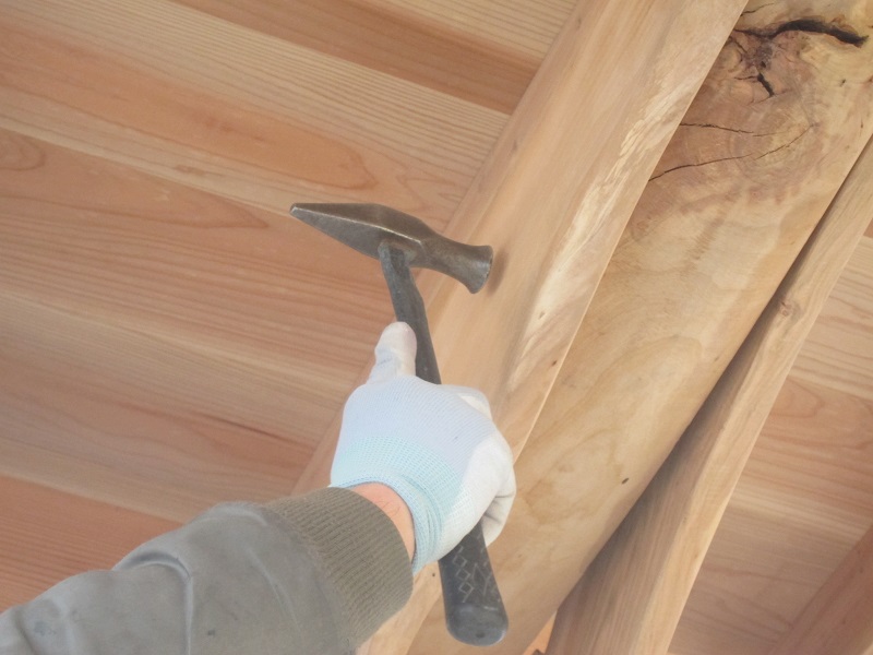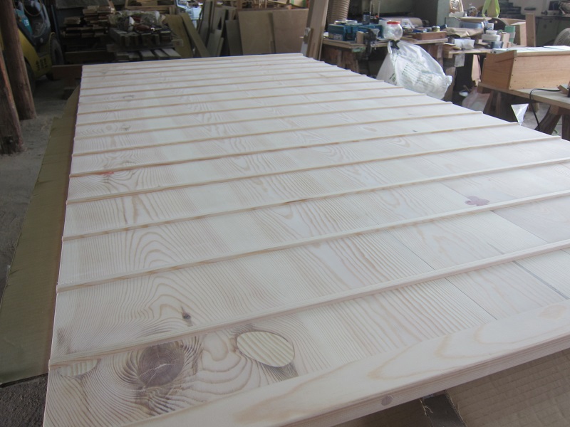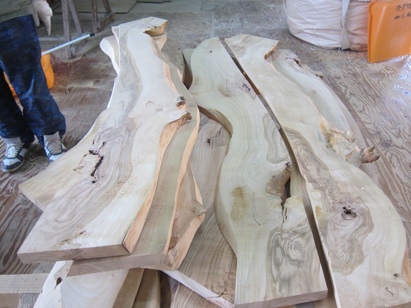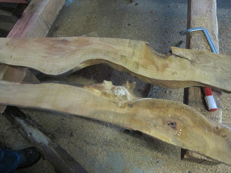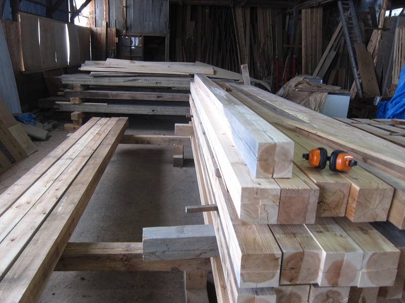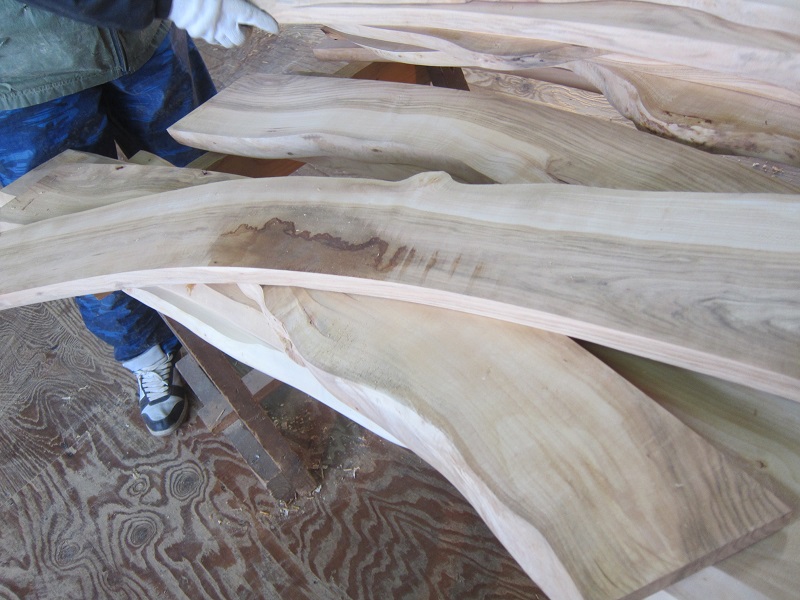 構造材の手刻みを終えて、上棟後に張り込む天井板の加工に取り組んでいます。丸太を購入して自社製材しすると1本の丸太から1本の梁が取れますが、それと同時にこの写真の様な板材も製材されて、何年も寝かして自然乾燥させた材が場内には大量に積み置かれていましたので、いよいよ出番到来です。
