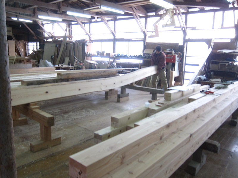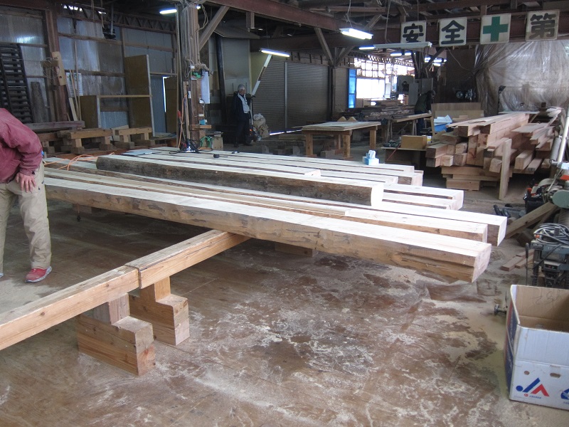 キャノピー材が出て、広くなった刻み場でしたが、次なる手刻みの準備に入ってまた構造材で一杯になって来ました。スタートはモルダーという機械で四面鉋を掛けて角材を9四面0度の真四角にする作業です。