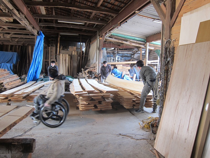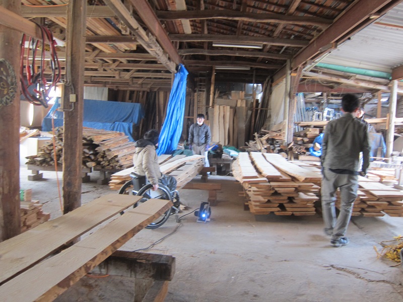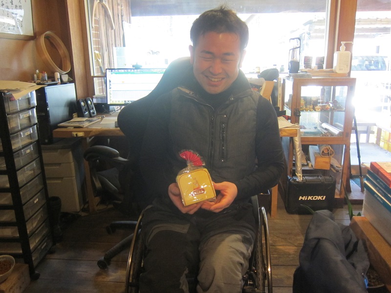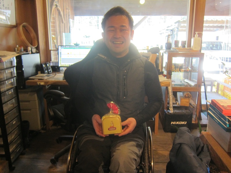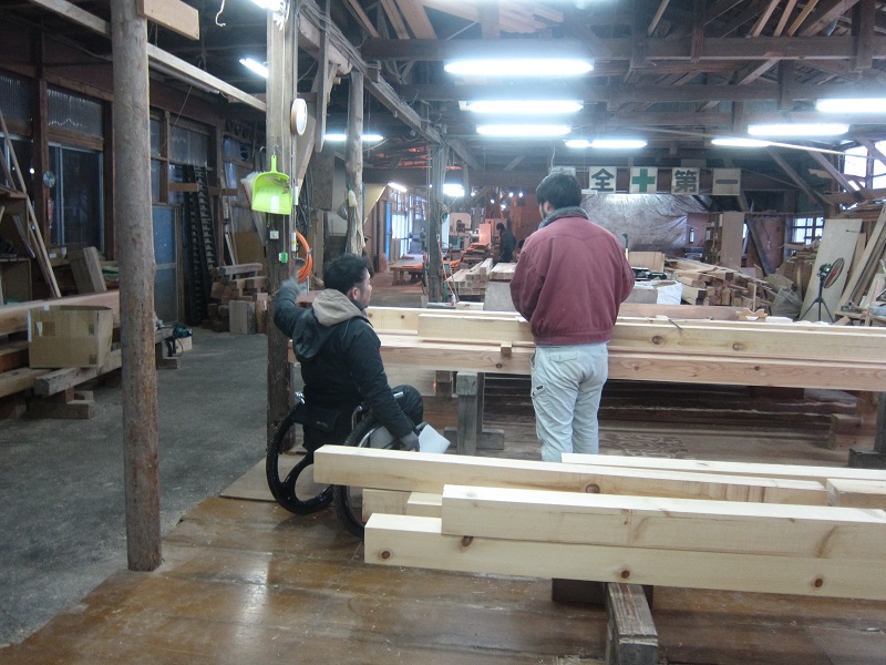 車椅子バスケ全国大会出場の車椅子大工大和田洋平が凱旋帰還いたしました。全国2位準優勝との事です。優勝は神奈川です。会場は横浜、行きは9時間戻り11時間の自車走行だったとの事、今朝3時に盛岡に戻った男が、仕事が気になって若手の墨付け刻みの確認に来ています。良く頑張りましたよね。拍手!