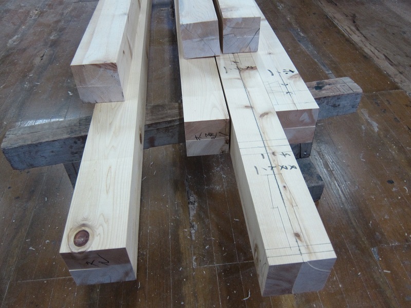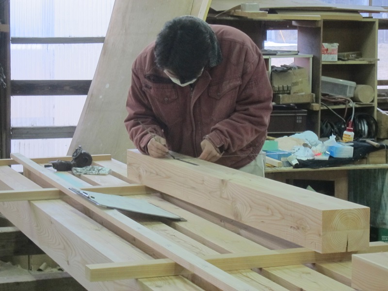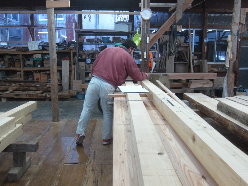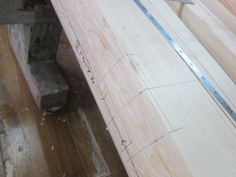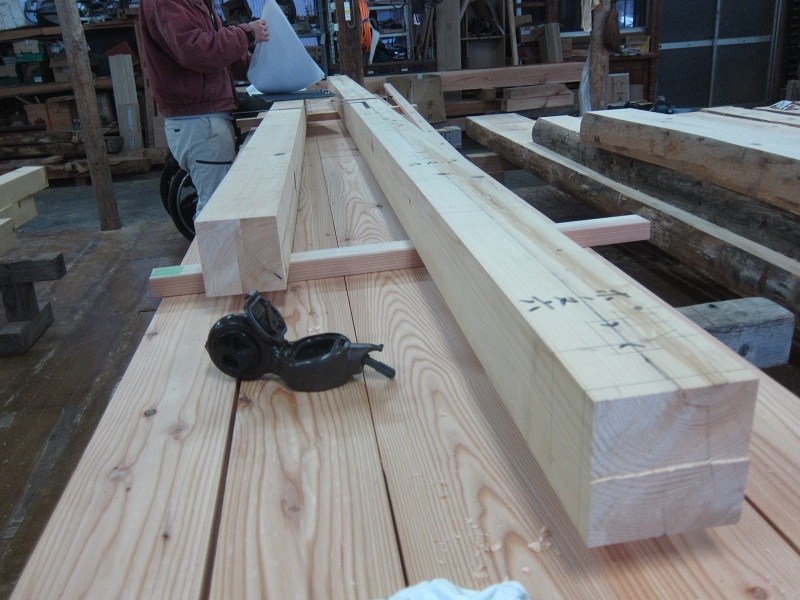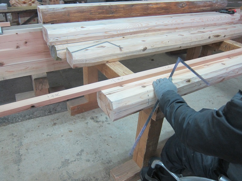 構造材が並んで、墨付け準備も整いましたので、墨付けが始まりました。今回は若手大工の良い経験になりますことを考えて、25歳の若手大工が墨付けに取り組みます。こうして実際に手を掛ける事で千年を超えると云われる大工の伝統技術が後の世にまで継承される事は未来への贈り物宝物と私は思っています。