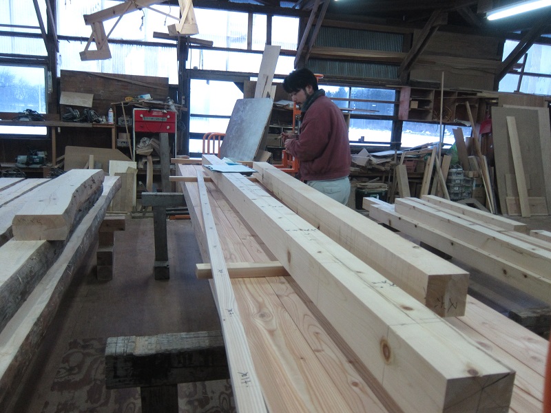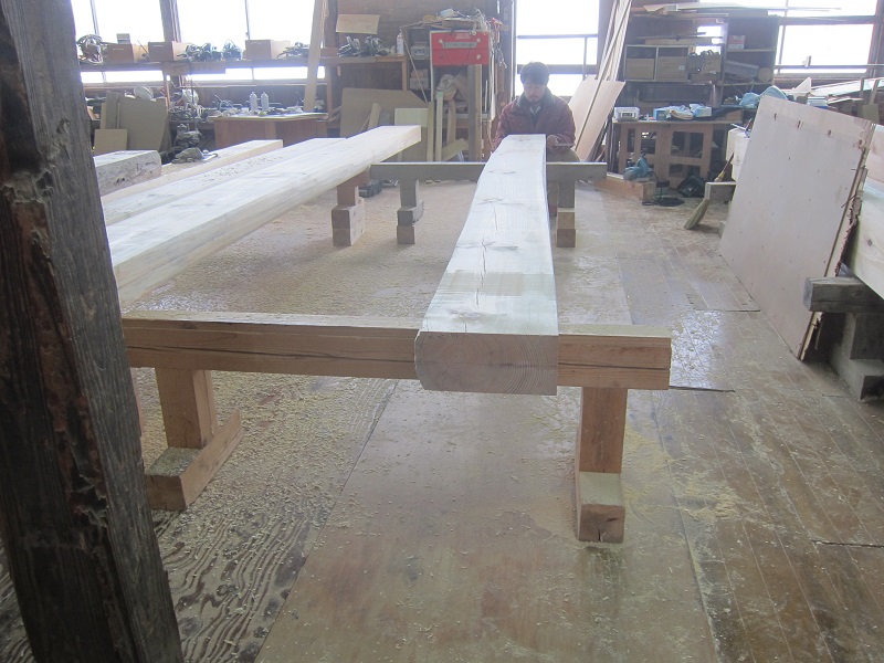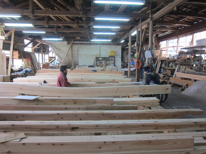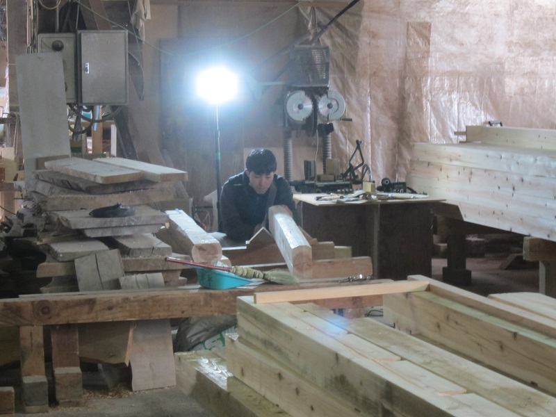 場内では、墨付け手刻みが続いていますが、その作業はまるで木に埋もれる様に見えます。