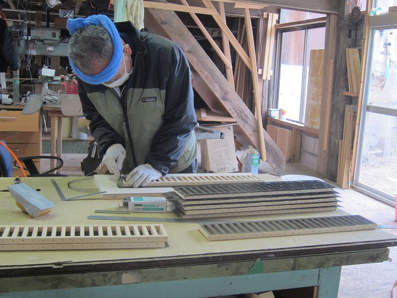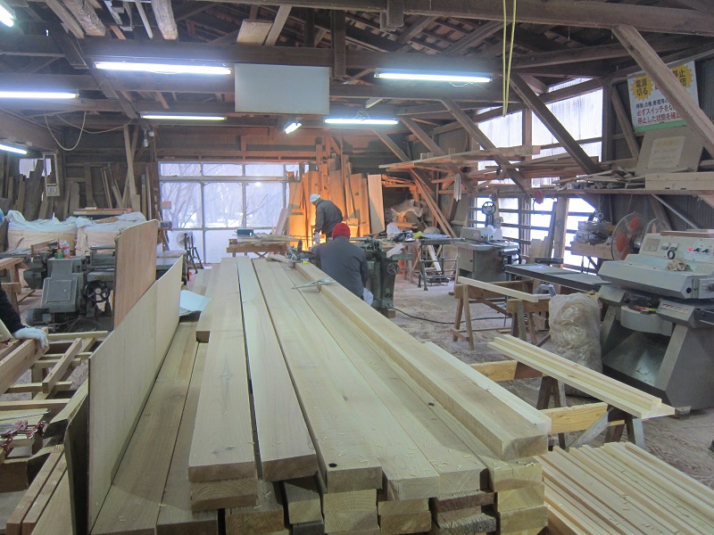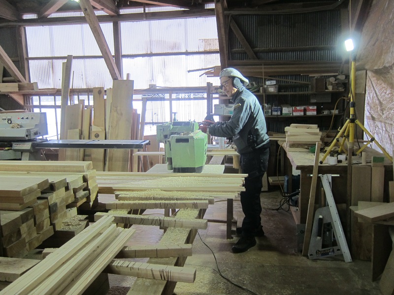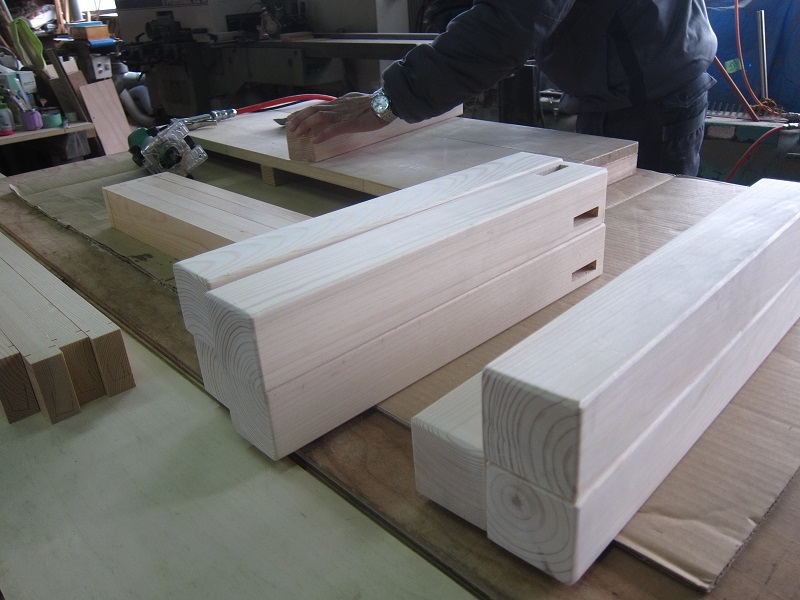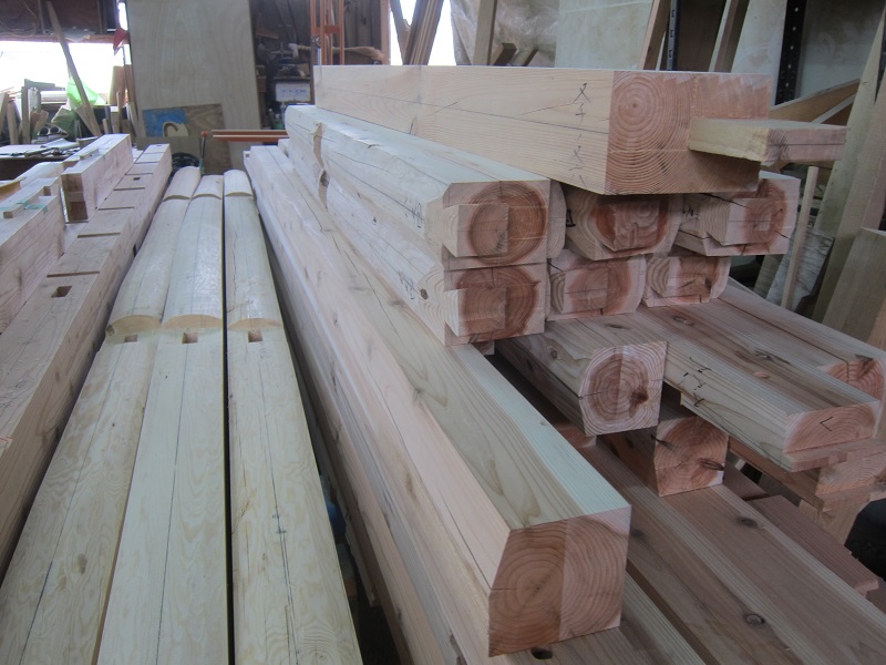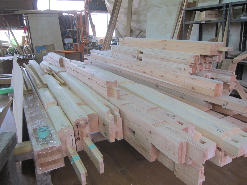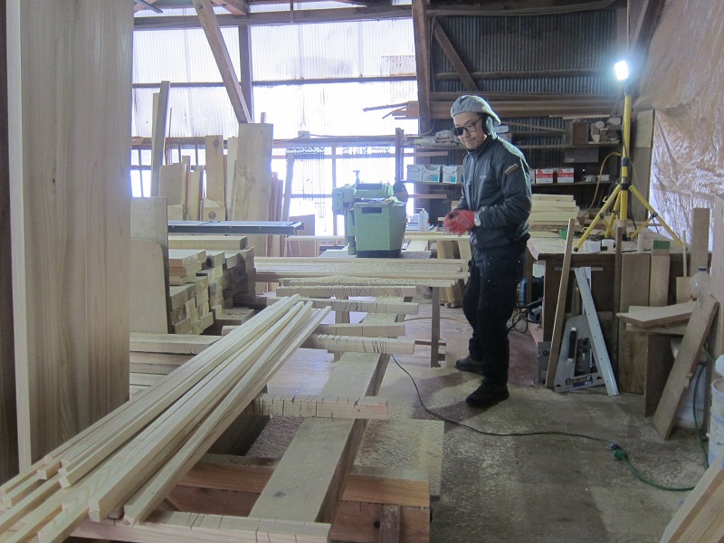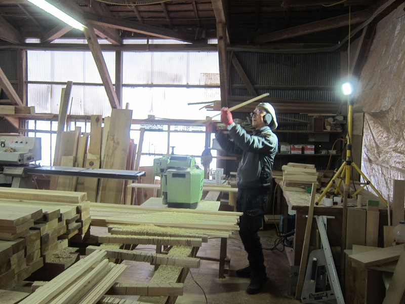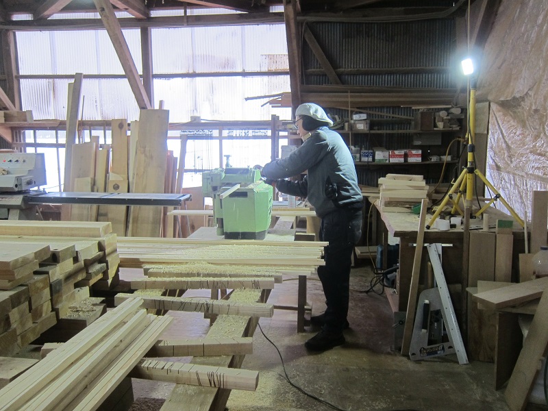 最近細かな材料を沢山作る機会が増えました。そして、還暦過ぎてから他社退職後に新たな道を見出した61歳の御方は、その手伝いで桟造りに取り組んで見事に職人と化しています。老後と云うにはまだまだ早すぎて若くも無いのでどうしようとお悩みの皆様、この様にまだまだ道は御座います。個人差は当然あると思いますが、自然の木と触れ合う仕事は楽しく魅力あると私は思います。桟造りの隣では同年代の大工の面々が共に造作加工しているのも心強いと思われます。
