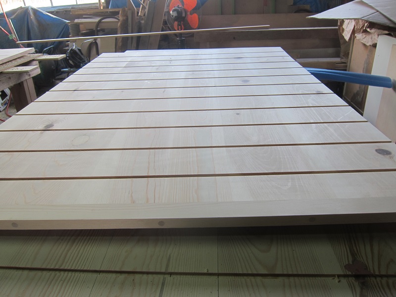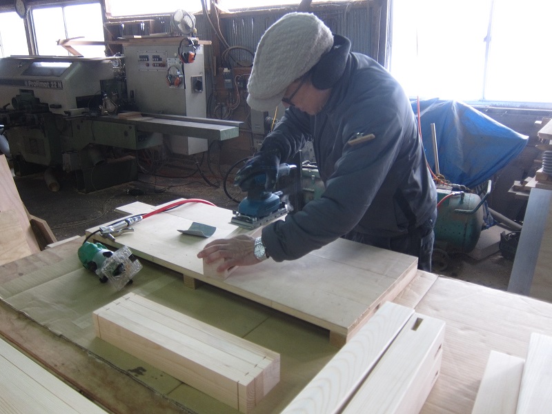 いよいよハイハイ板の塗装仕上げが取り組まれています。桟に手足を掛けて上がってその板をひっくり返して滑り台にして滑って降りる仕組みですから、良く滑り棘が刺さらない様に造りますから、一度塗ってさらにまた磨いて最後にまた塗ります。今回はその塗る前のサンダー掛けを外で天気を見ながら行っていました。なんとかまだ降ってはいませんが、午後からは降る予報ですね!無事室内に運び戻して塗装できています。