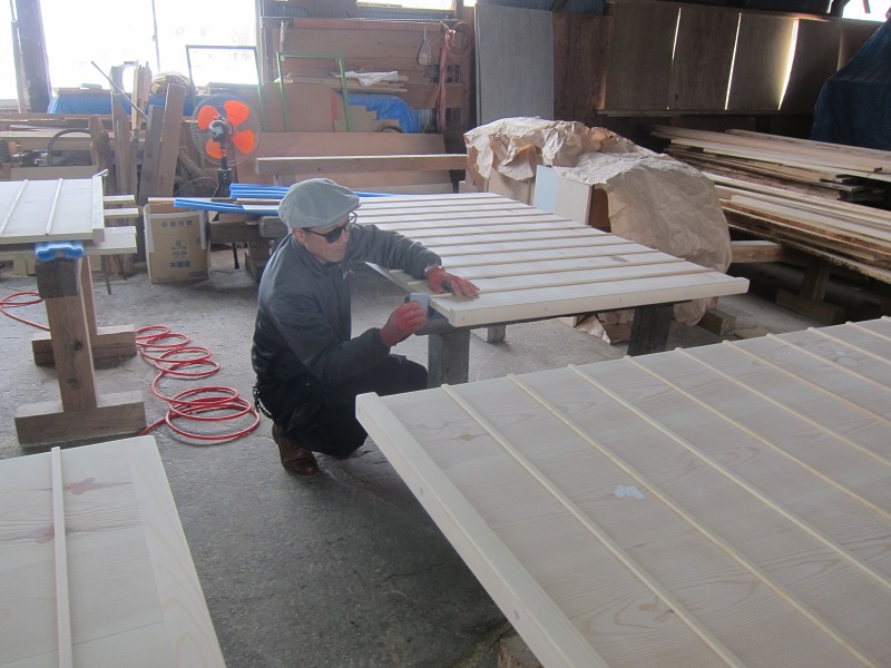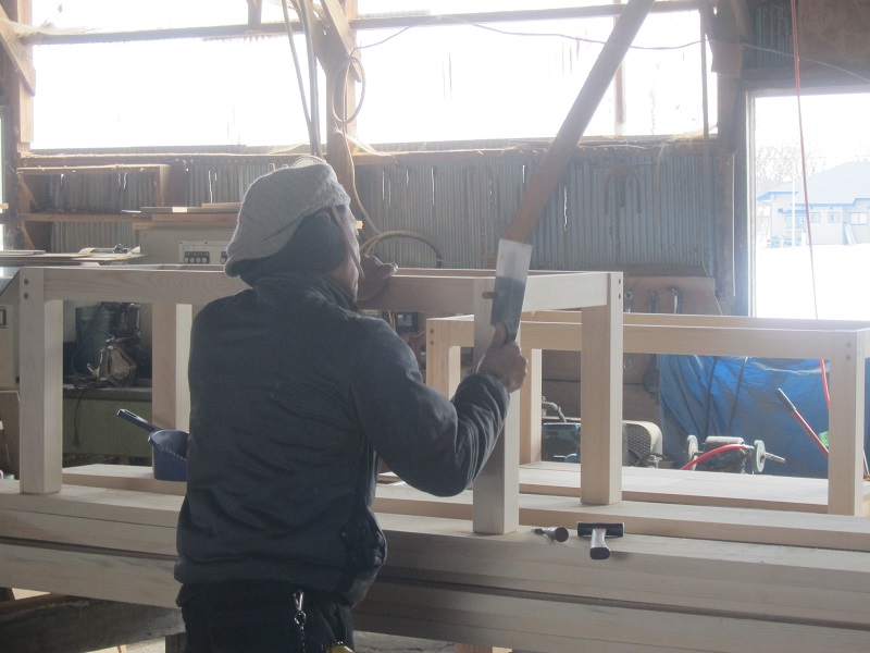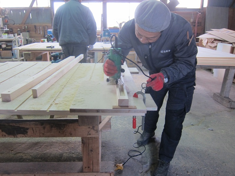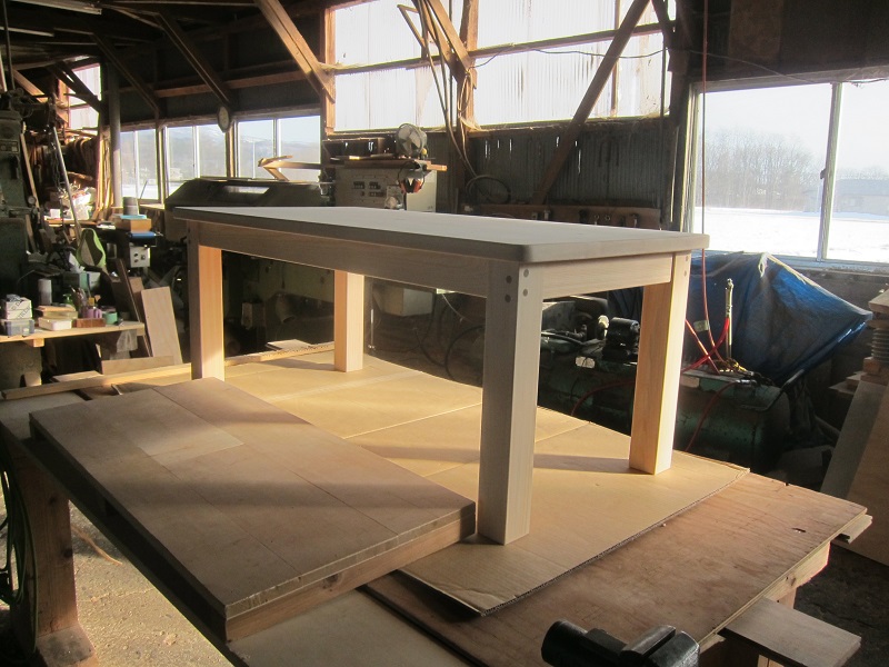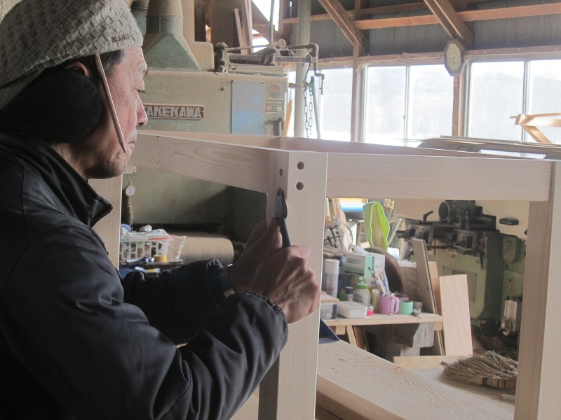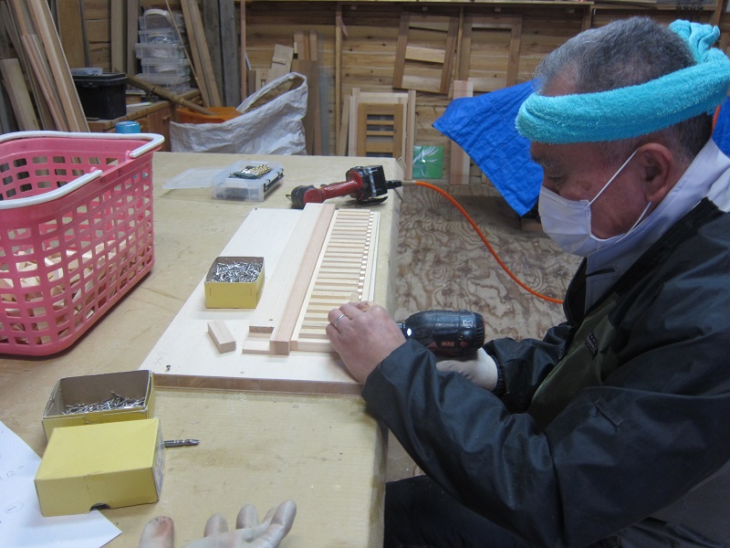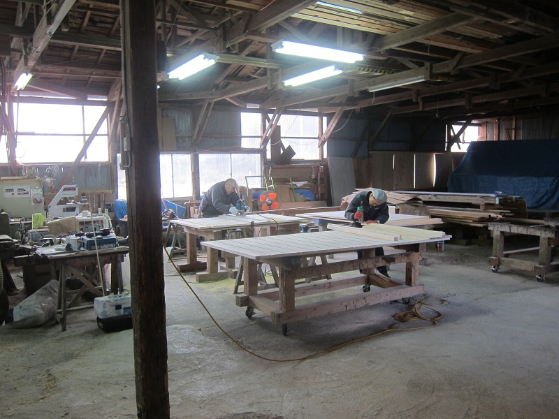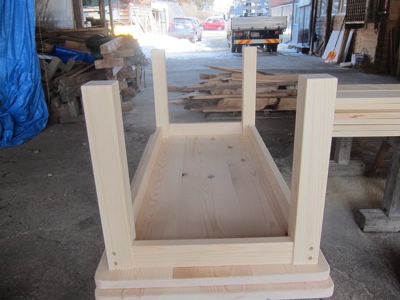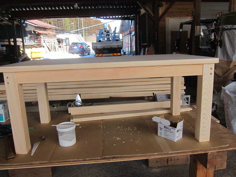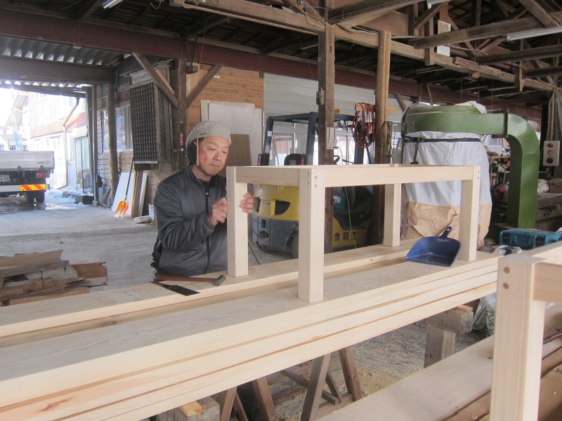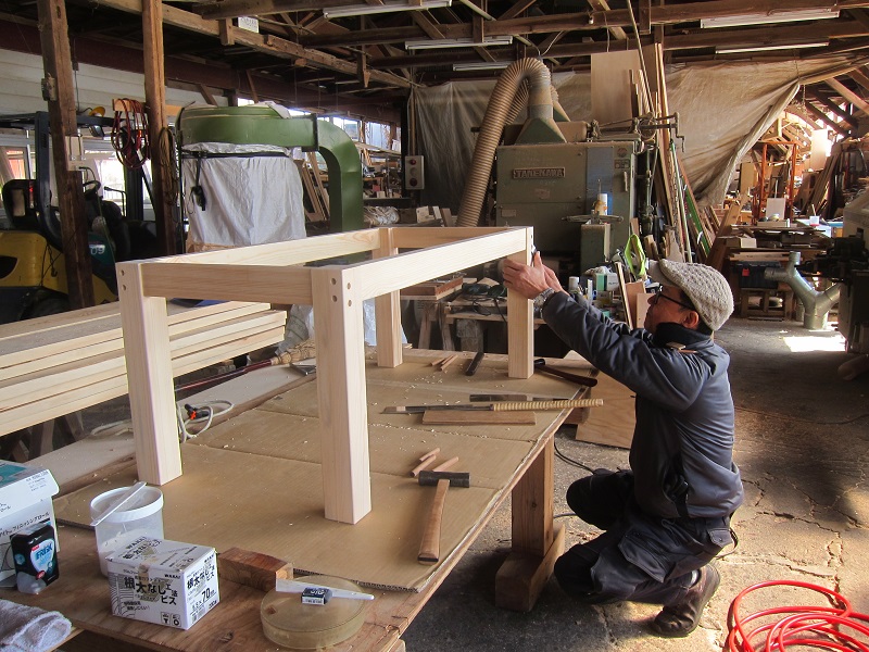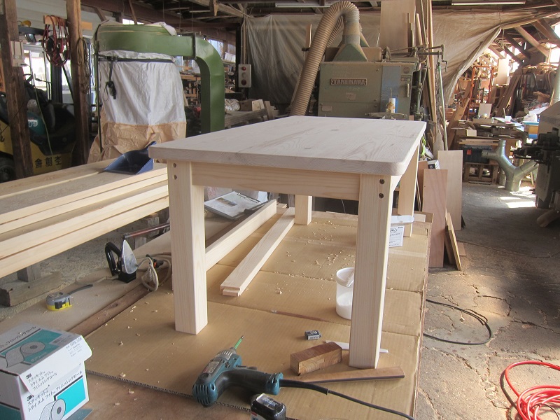 他社定年退職後に当社への就職を果たした御同輩は、園児椅子造りの次は小さなテーブル造をしています。見た目家具職人様になっています。年齢限界は無いですね。