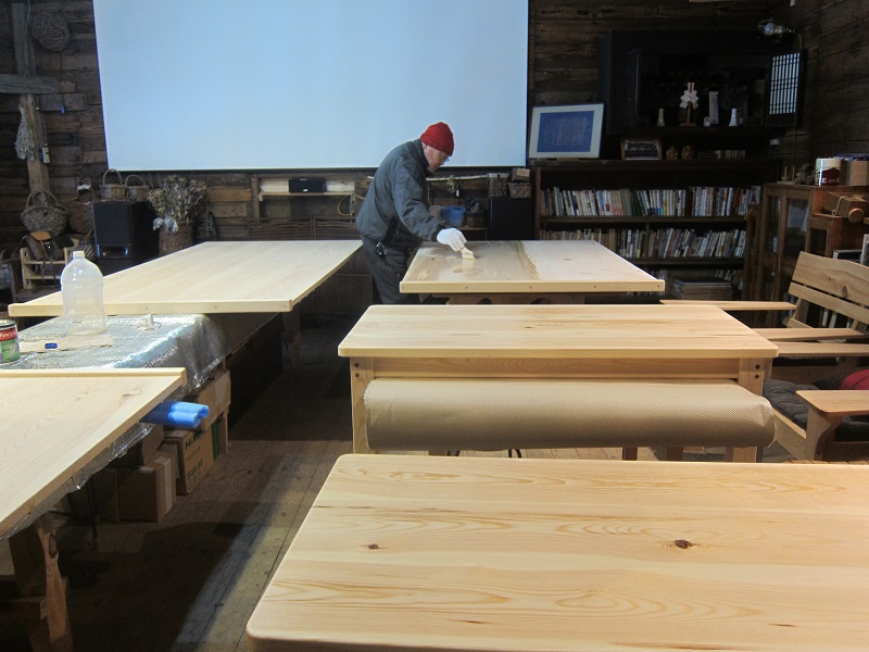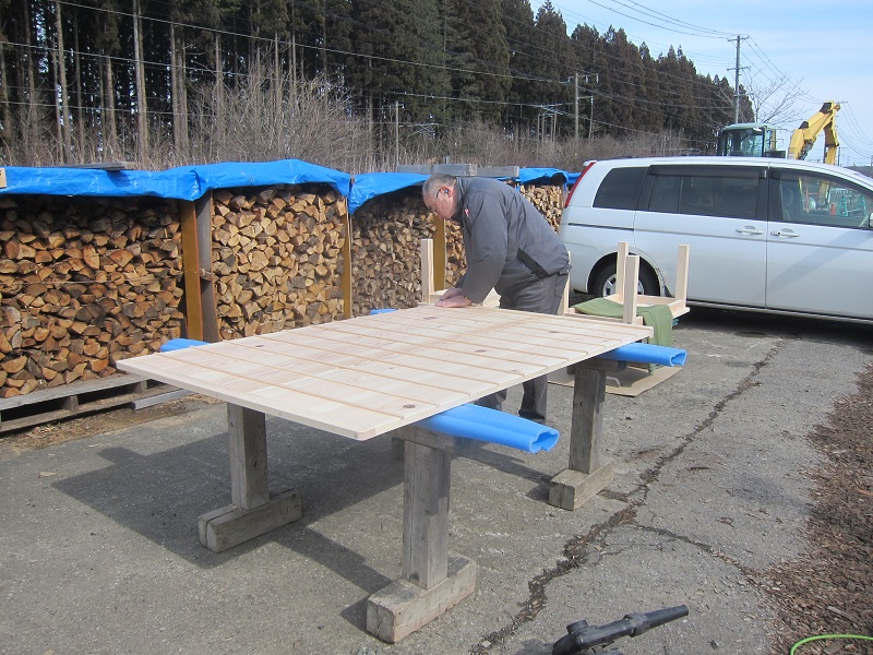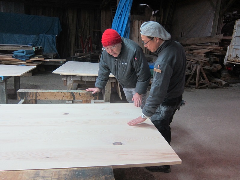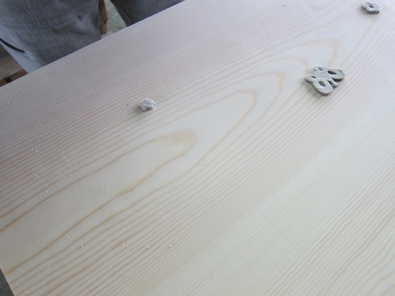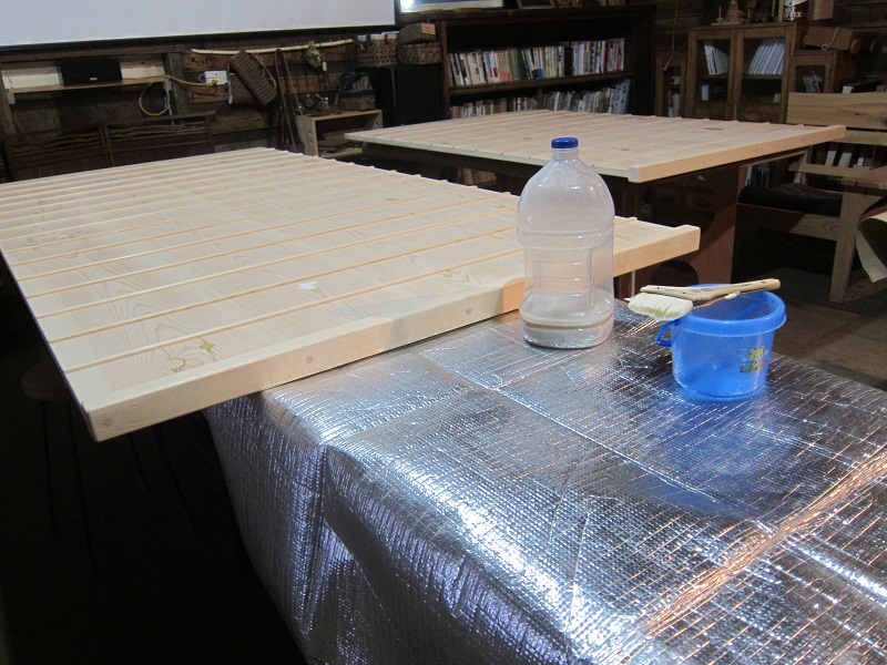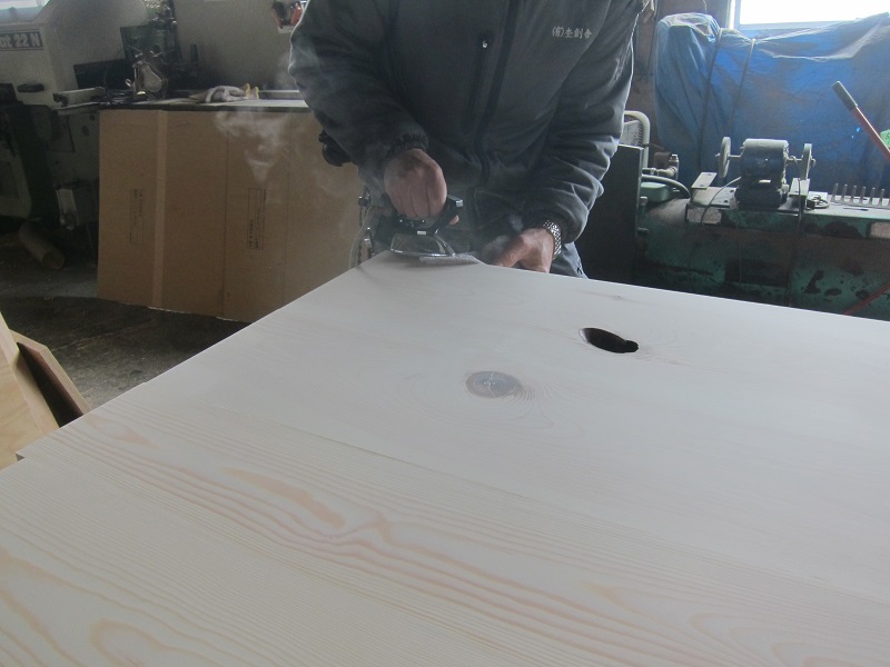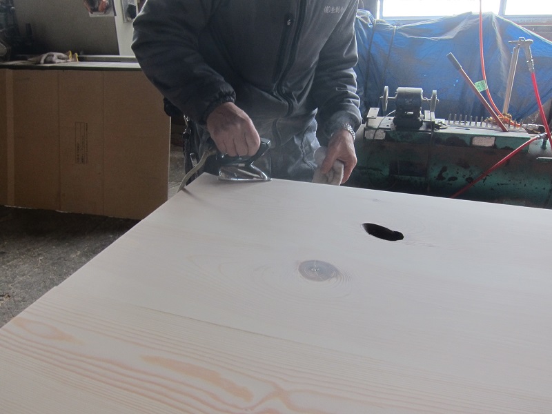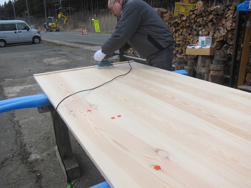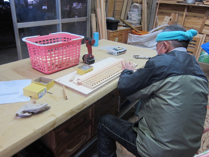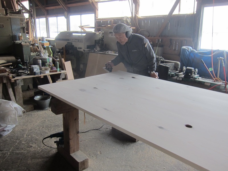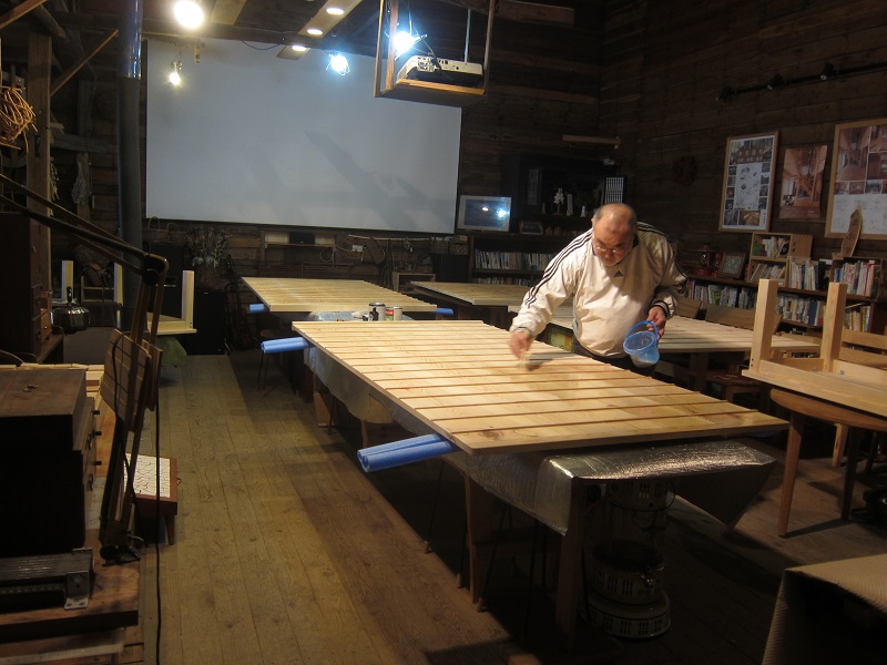とても大きな板の盤を製作しています。これに桟を付けて子供が昇りやすくするそうです。その名もハイハイ板です。アイロンで手入れしたりサンダーで磨いたりと家具職人並みに手付きが良い定年退職者さんです。プロ職人は、抜け節の埋木など本格的な部分を直していましたが、ミッキーマウス象嵌にしようかなと呟いていました。