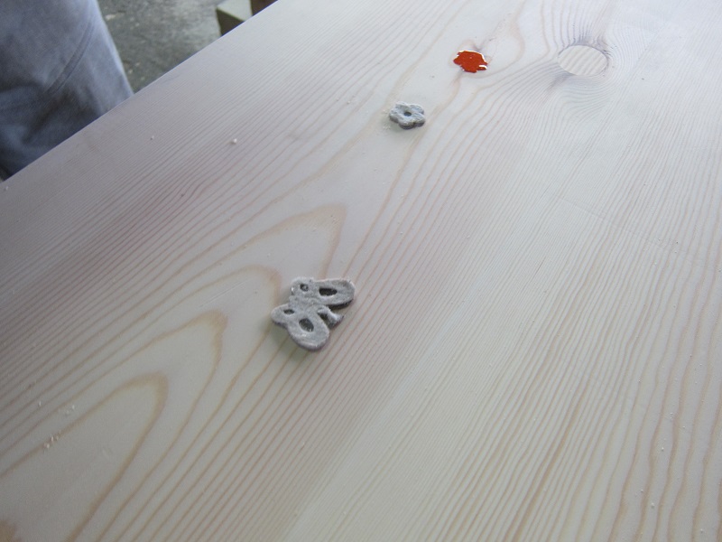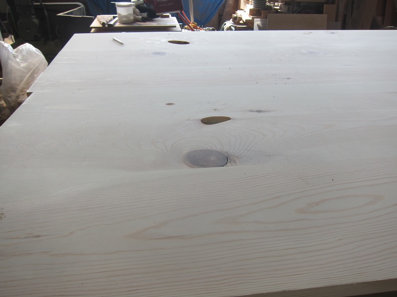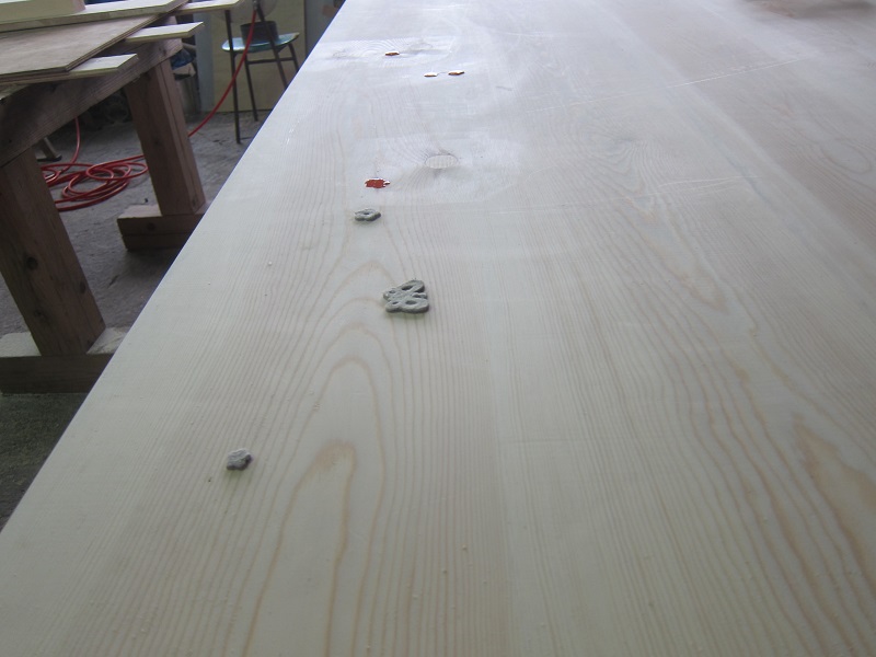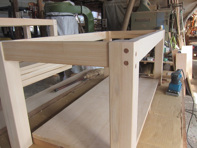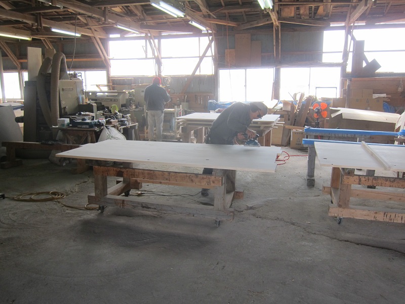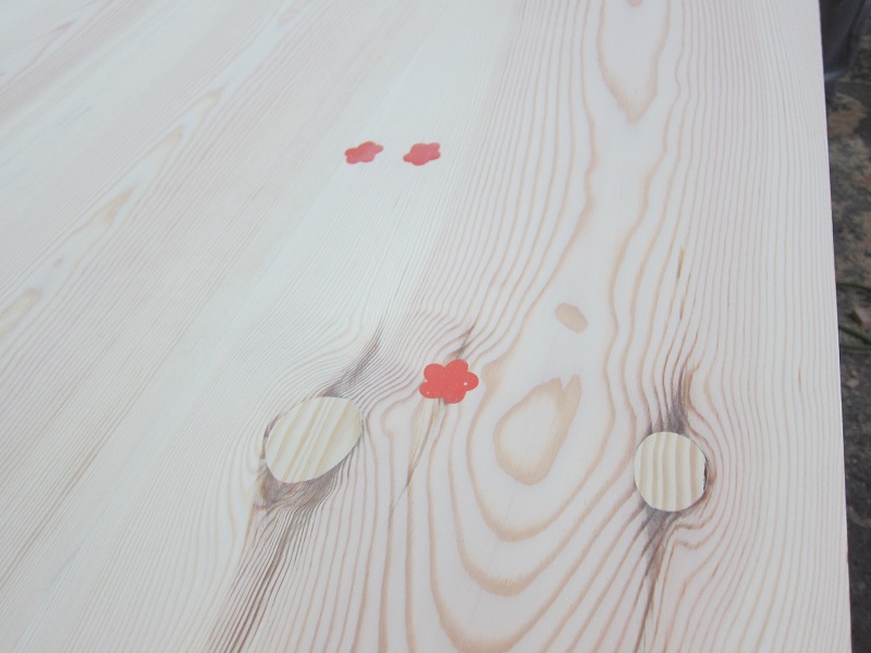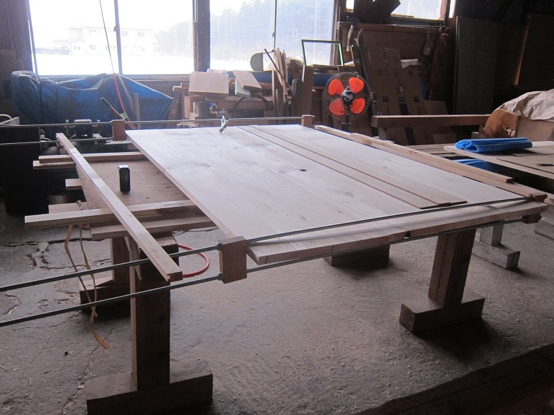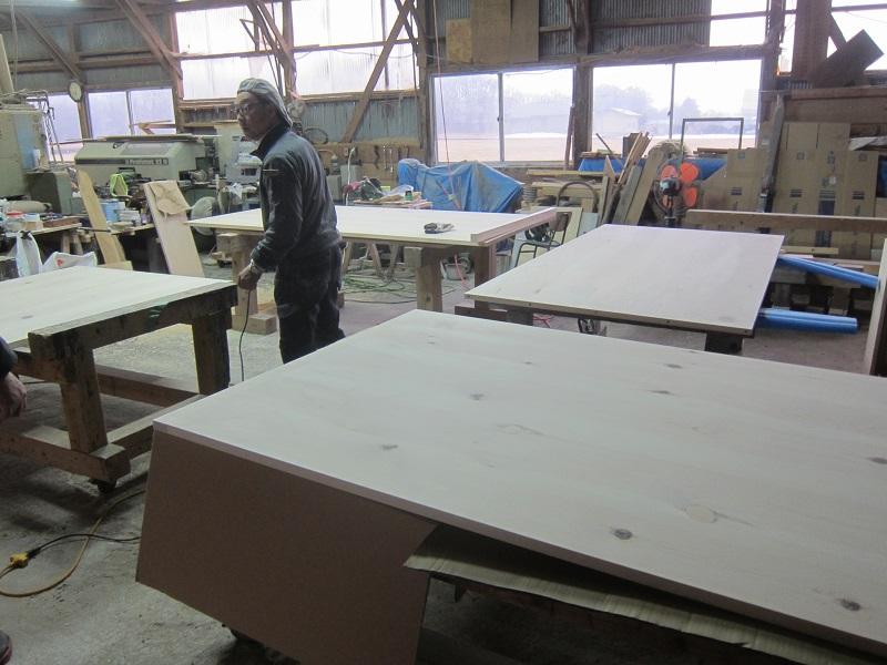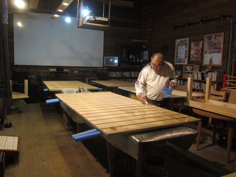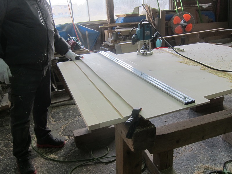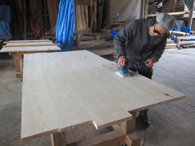 とても大きな板の盤を製作しています。これに桟を付けて子供が昇りやすくするそうです。その名もハイハイ板です。アイロンで手入れしたりサンダーで磨いたりと家具職人並みに手付きが良い定年退職者さんです。プロ職人は、抜け節の埋木など本格的な部分を直していましたが、ミッキーマウス象嵌にしようかなと呟いていました。