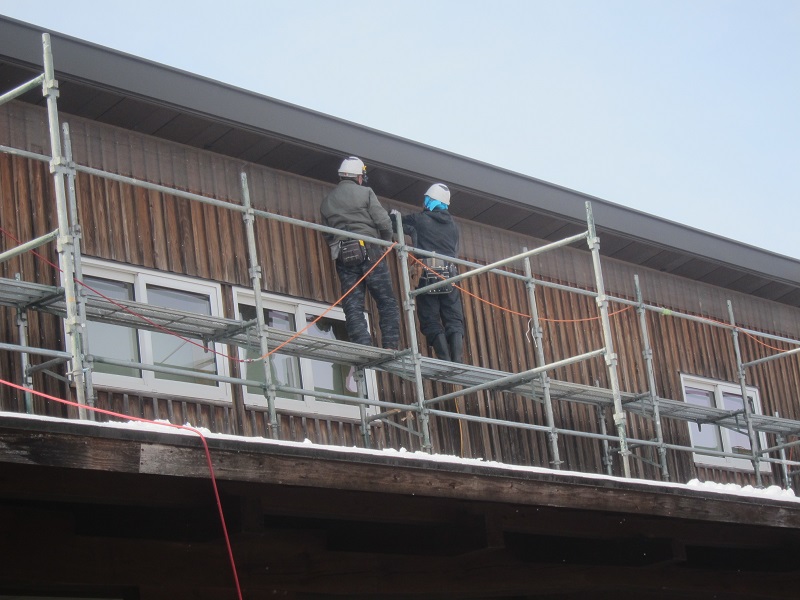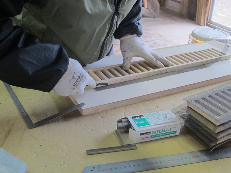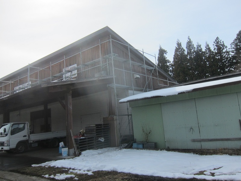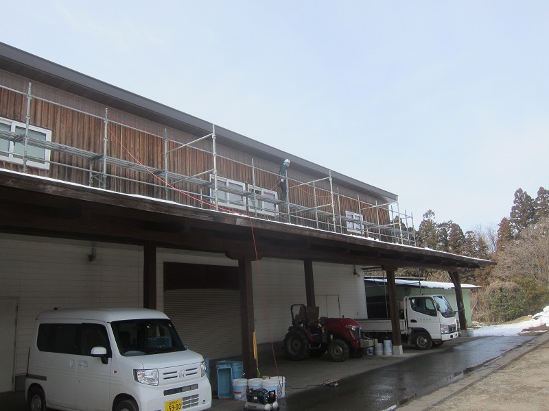 盛岡市内の農場です。板壁をキツツキに穴だらけにされてしまいました。その穴を塞いで防鳥ステンレス網を取り付けました。