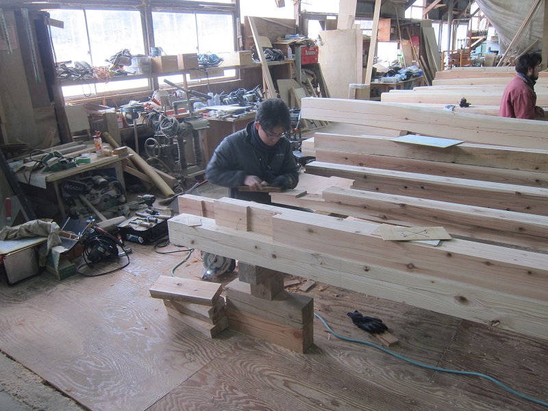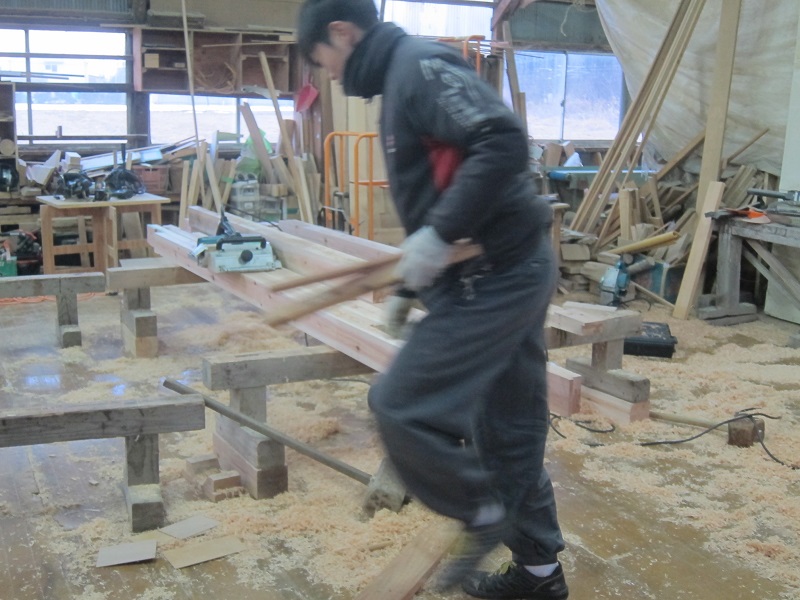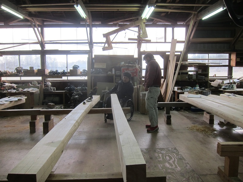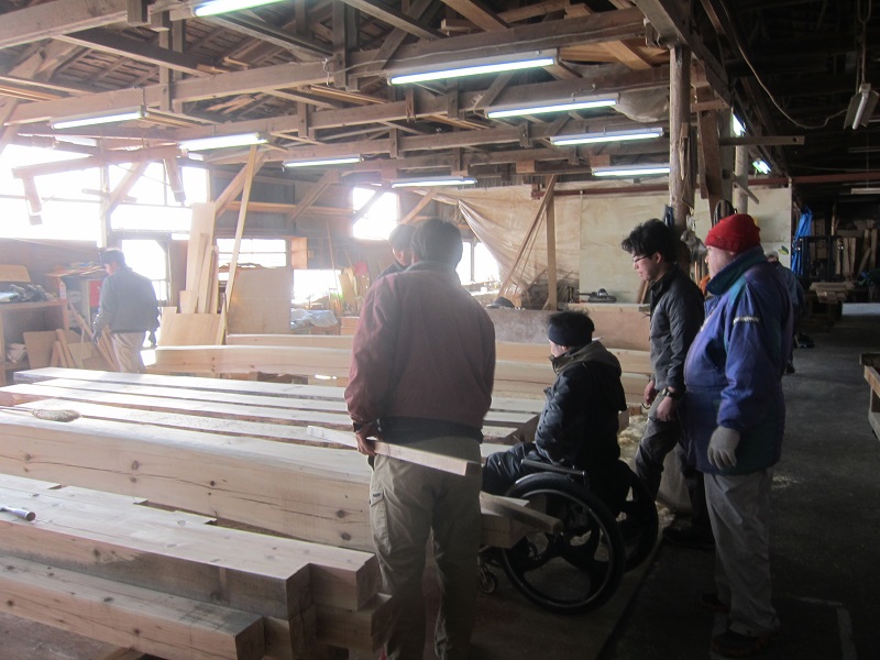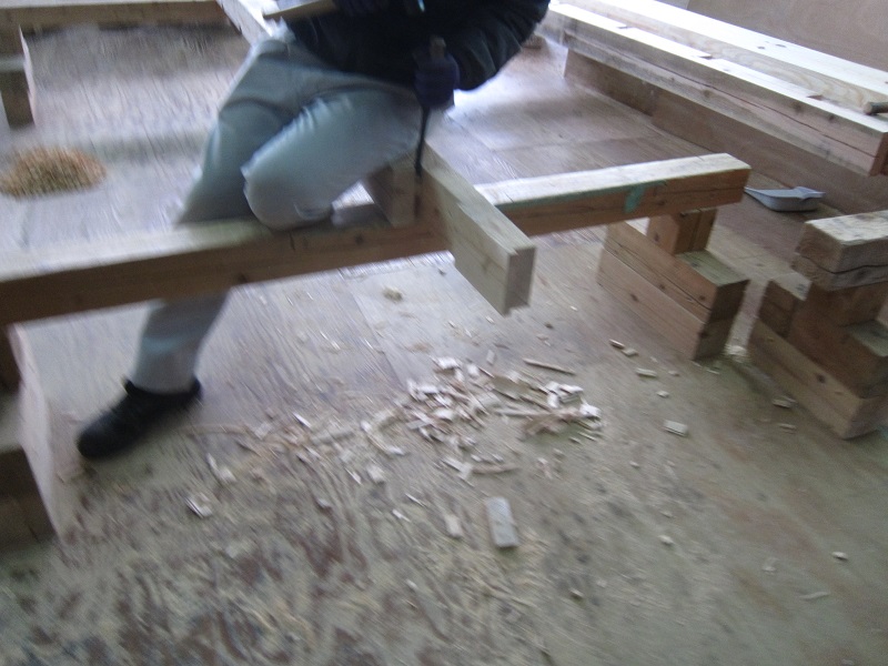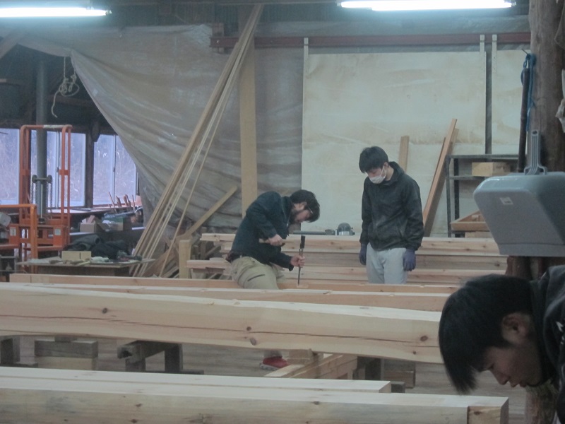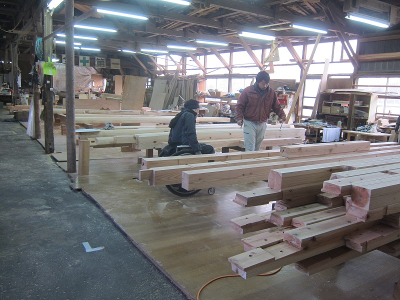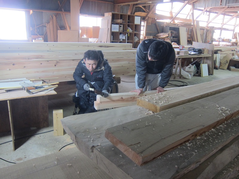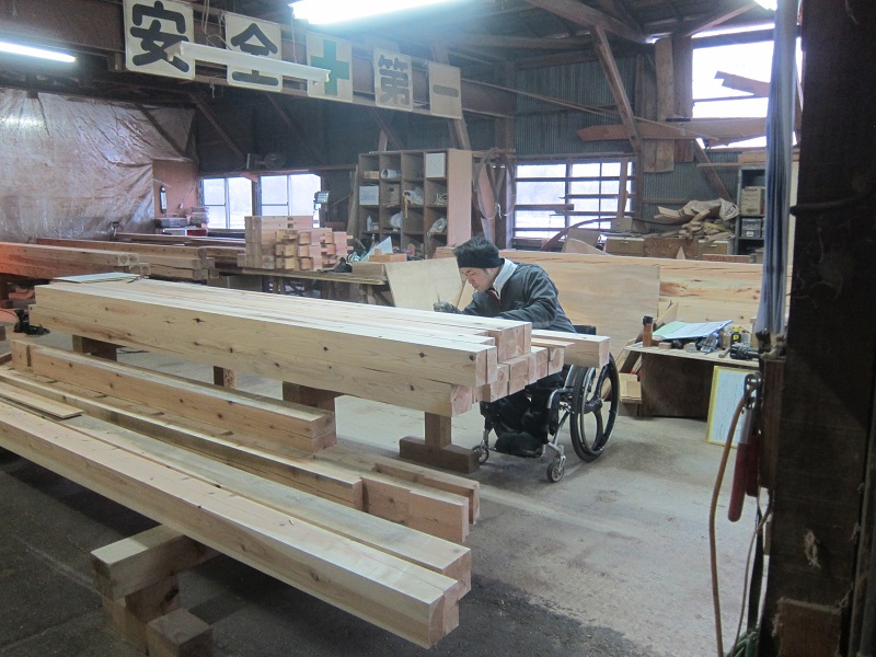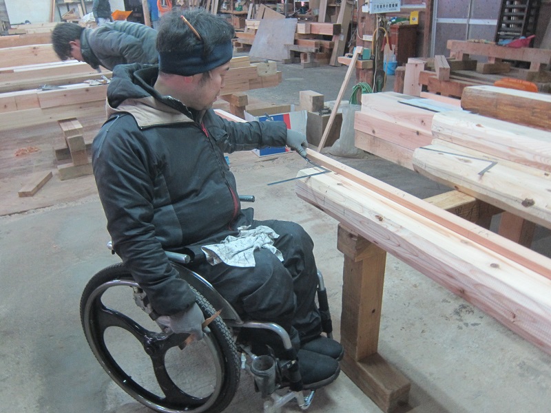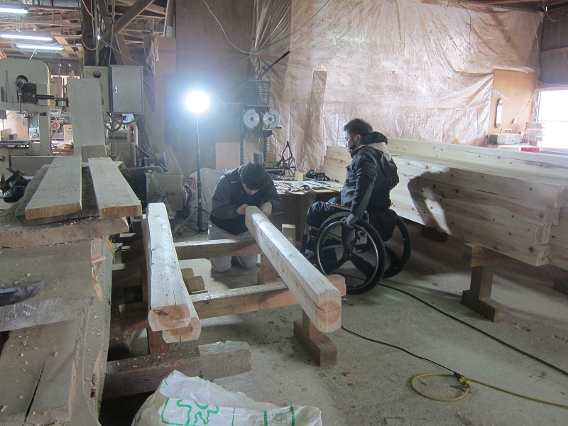 新たな墨付け刻みが進んでいます。若手と一緒に車椅子大工も一緒に教えながら墨を付け、若手が揃って刻んでいます。写真内、赤い帽子以外は皆20代です。
